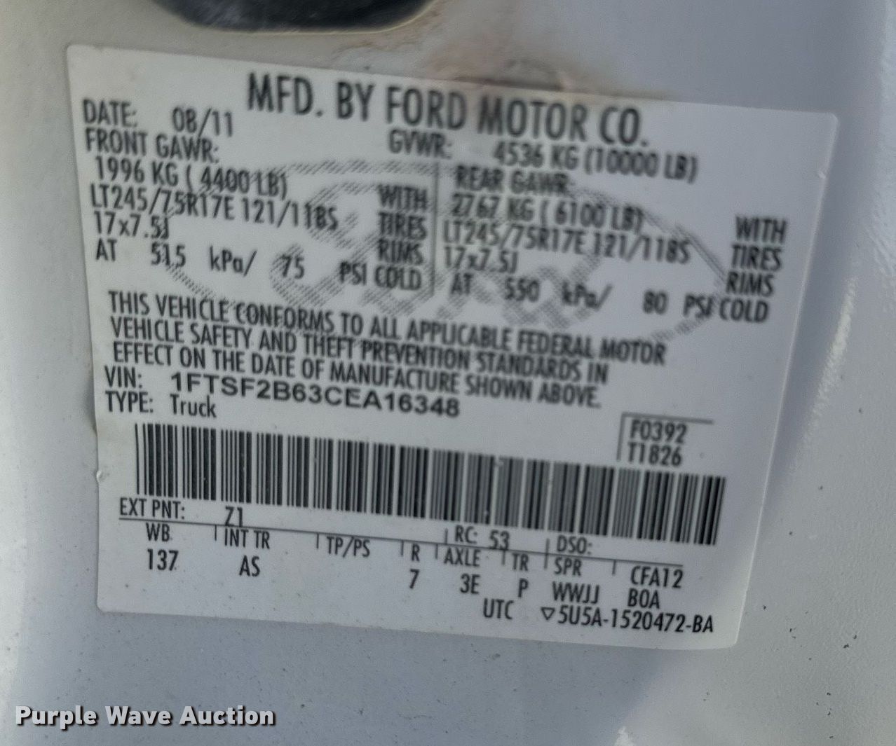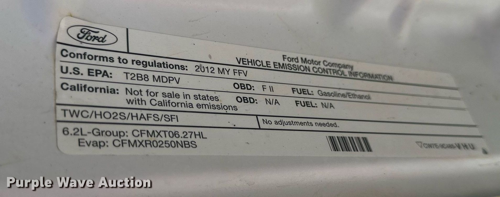 2012 Ford F250 Super Duty pickup truck. Miles: 213,612 on odometer, VIN: 1FTSF2B63CEA16348. Engine Displacement: 6.2L V8 OHV, Cylinders: 8, Fuel type: Gas. Transmission Automatic, Four wheel drive. Interior AC, Heat, Cruise control. Tires Size: 245/75R17. Notes Dash warning indicator: TPMS. Kansas title. Title distribution may be delayed up to 14 days from verification of funds. Ellis County Public Works. 1195 280th Avenue. Hays, KS 67601