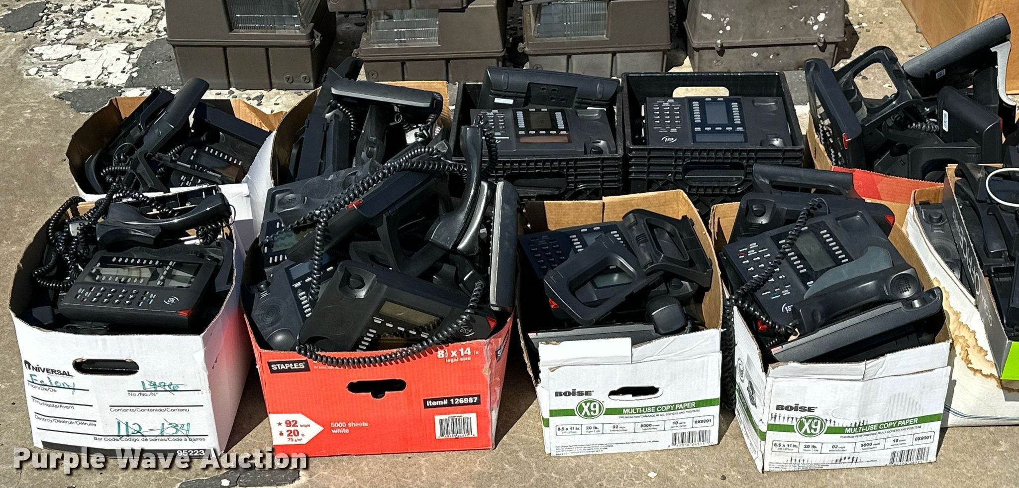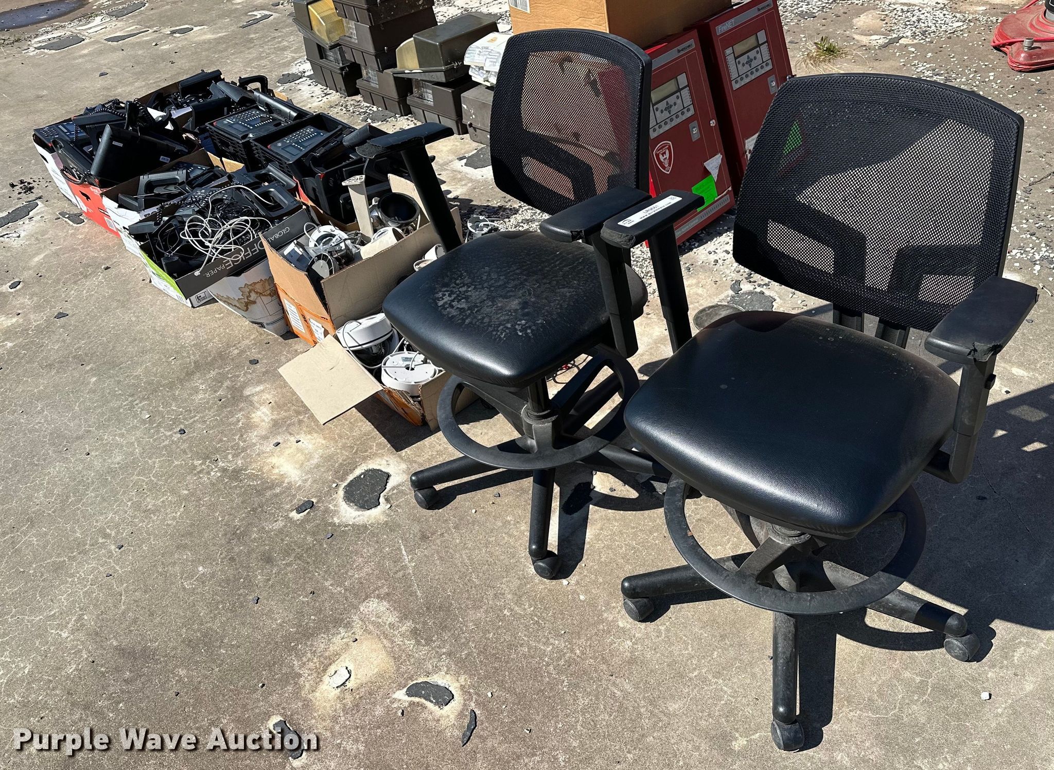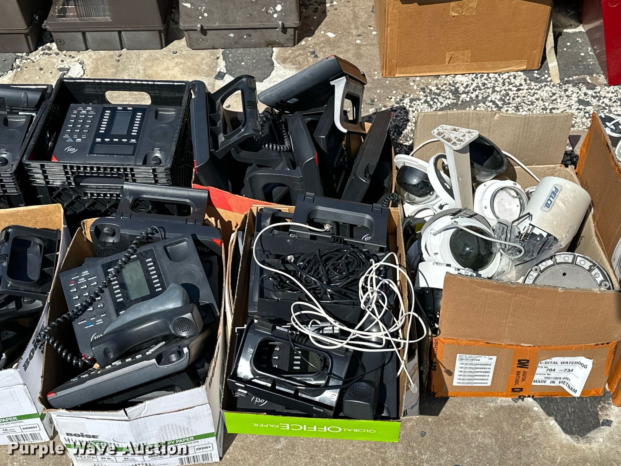 Purple Wave is selling a used Office Supplies and Equip. in Oklahoma. This item is a Office equipment with the following: Desk, (2) chairs, (2) boxes of security cameras, Approximately 20 phones, Unknown operating condition of cameras and phones