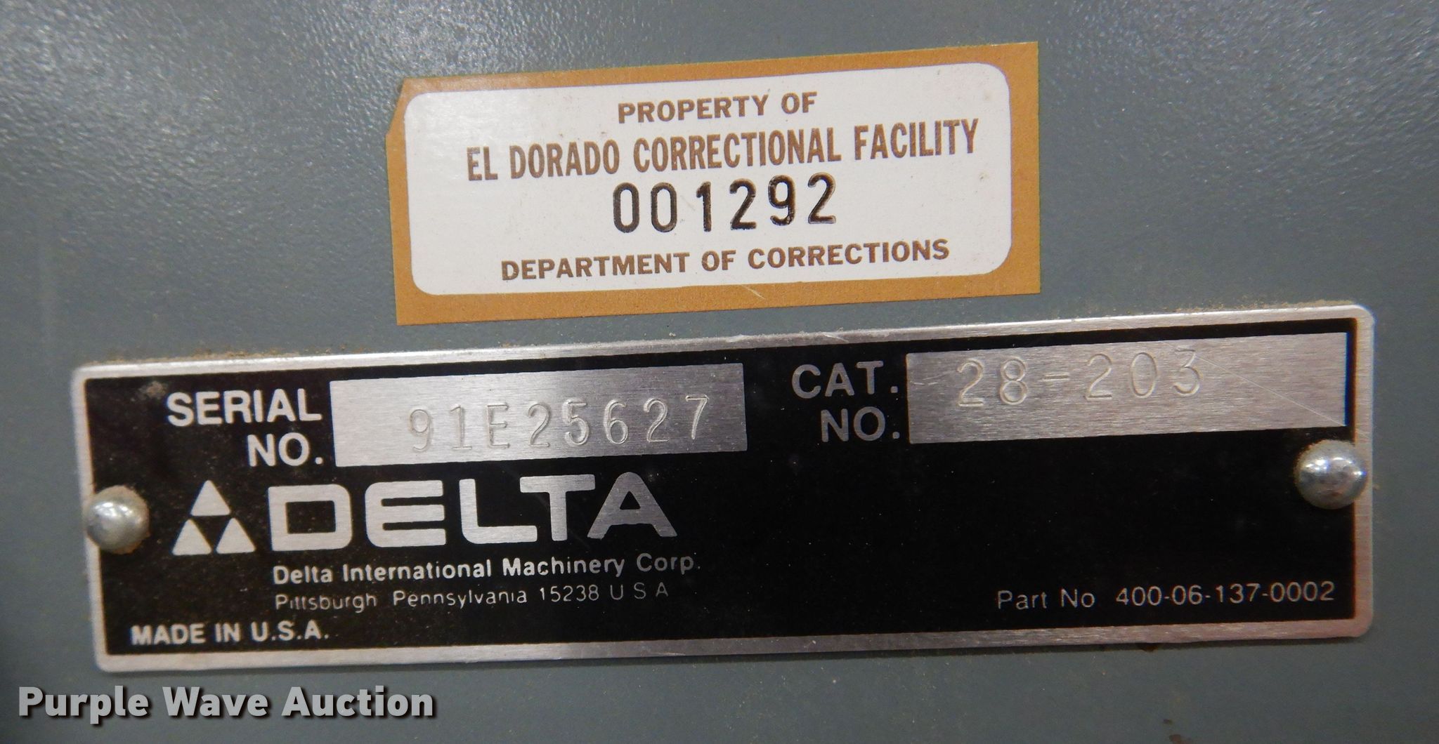 Delta bandsaw. Serial: 91E25627. Electric Motor Volts: 115, Phase: Single. Notes (4) Olson 93.5" blades, Unknown operating condition. El Dorado Correctional Facility. El Dorado, KS 67042