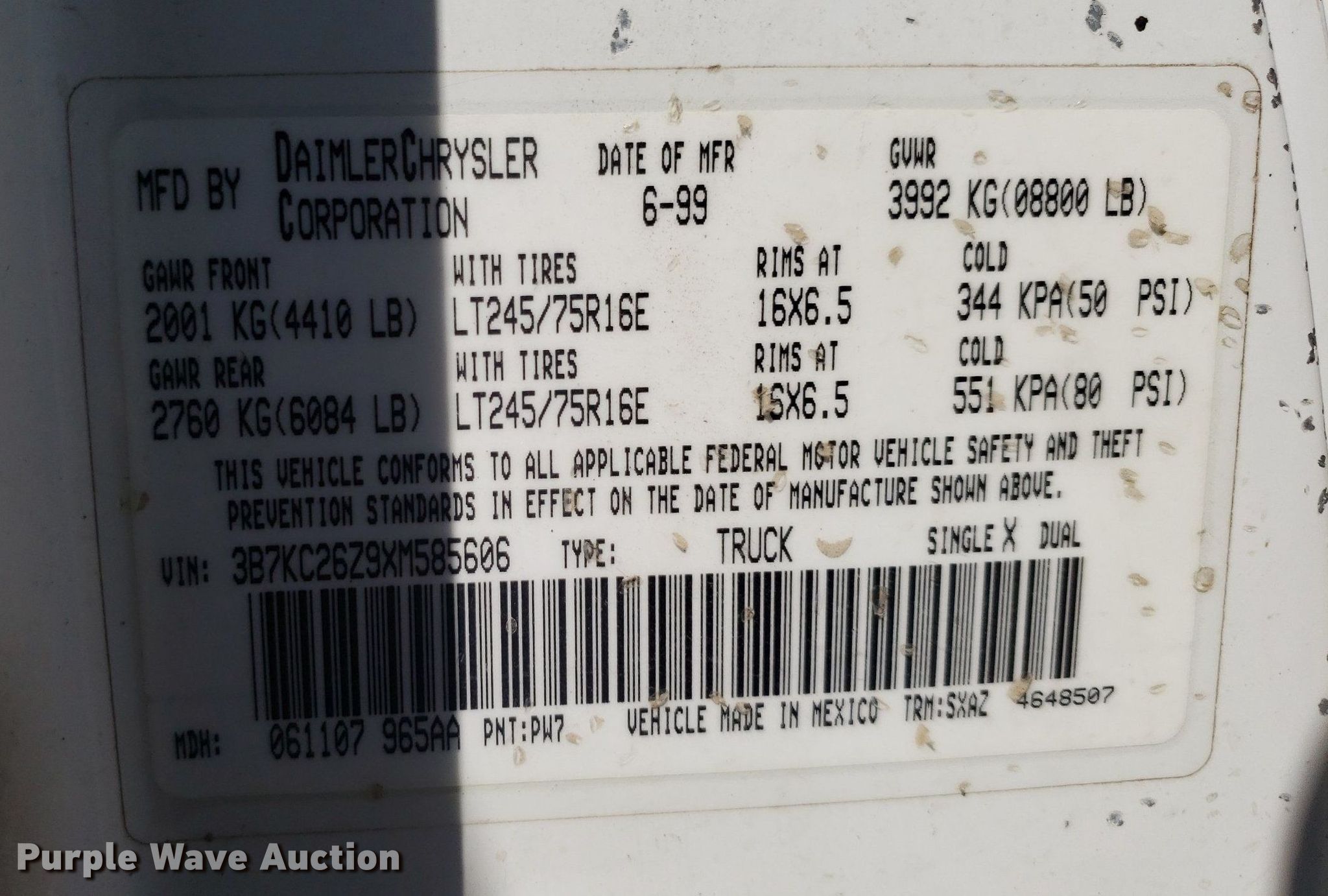 1999 Dodge Ram 2500 pickup truck. Miles: 132,778 on odometer, VIN: 3B7KC26Z9XM585606. Engine Displacement: 5.9L V8 OHV, Cylinders: 8, Fuel type: Gas. Transmission Automatic. Interior AC, Heat, Cruise control. Tires Size: 245/75R16. Notes Dash warning indicator: Check engine, Airbag. Kansas title. Title distribution may be delayed up to 14 days from verification of funds. City of Wellington. 504 S Blaine St. Wellington, KS 67152