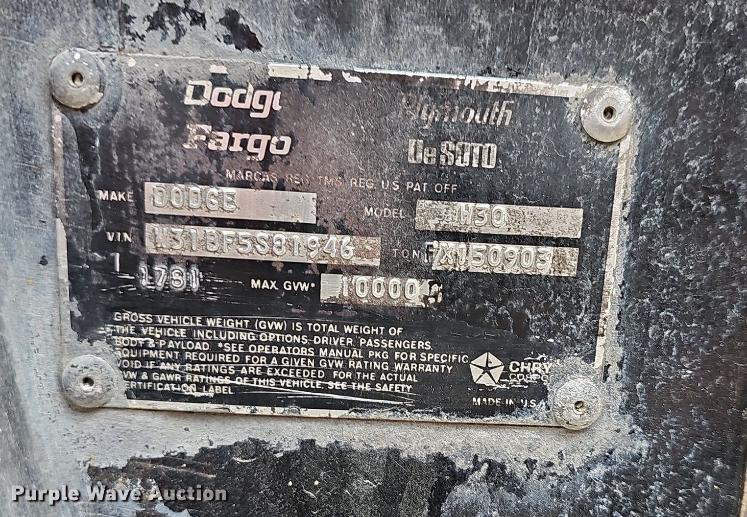 1975 Dodge pumper fire truck. Miles: 31,833 on odometer, VIN: W31BF5S81946. Engine Cylinders: 8, Fuel type: Gas. Transmission Manual, Speed: 4. Chassis Axles: Single, Suspension: Spring, Brakes: Hydraulic. Interior Heat. Features Fire truck body Pump 300 gpm, Ladder, Hose reel Hose.. Tires Size: LT235/85R16. Notes Contents not included, Dead battery. Missouri title. Mileage has not been verified. Exempt will be written in the odometer disclosure on the title. Wheatland Vol Fire dept. 18901 Missouri 83. Wheatland, MO 65779