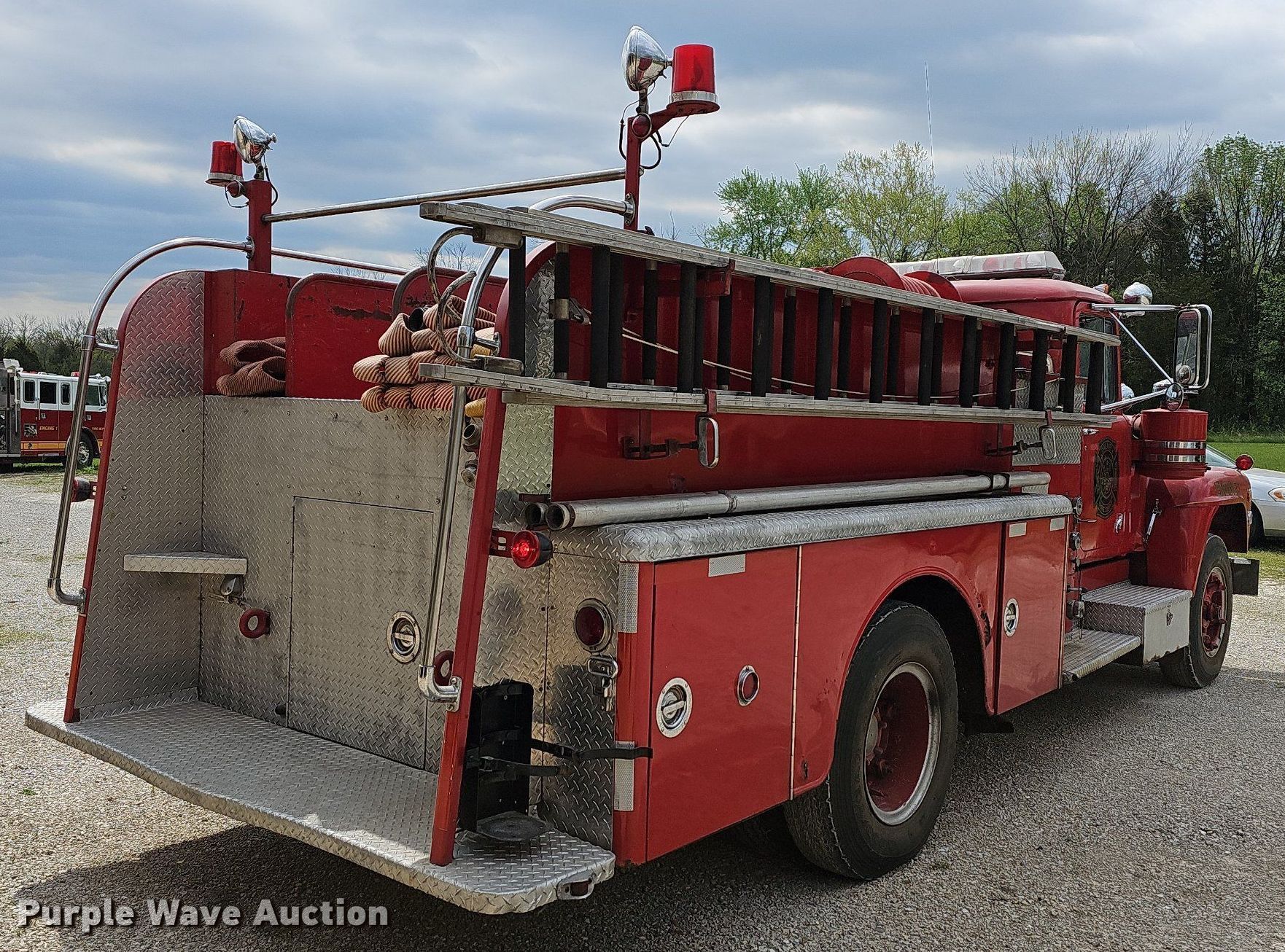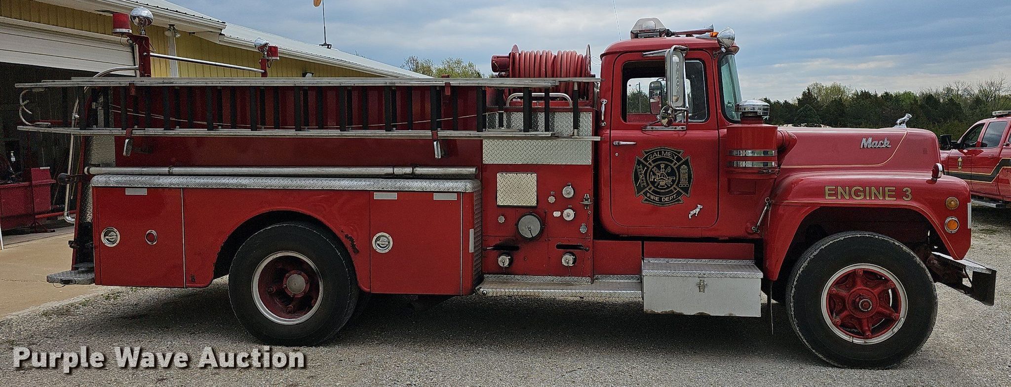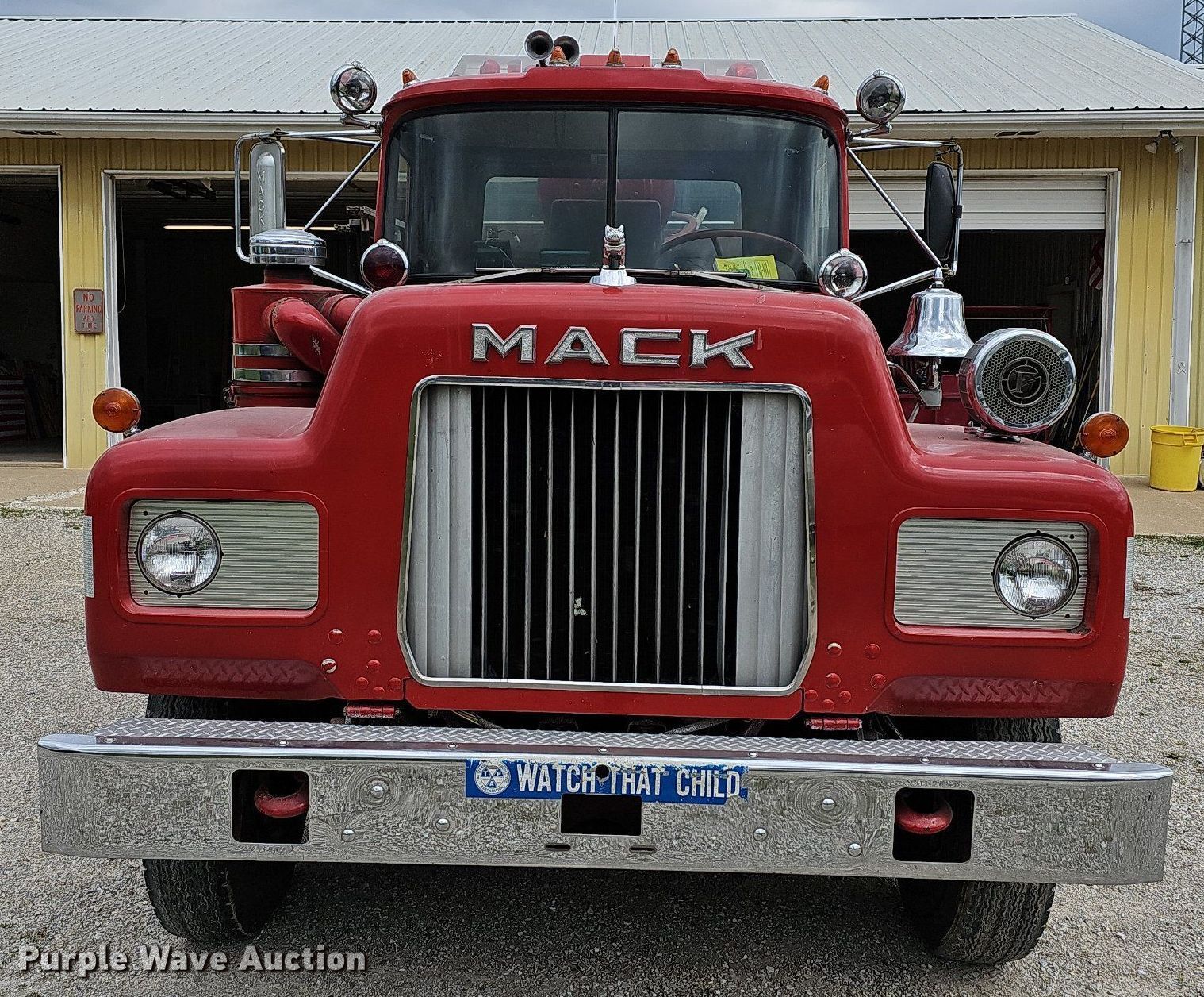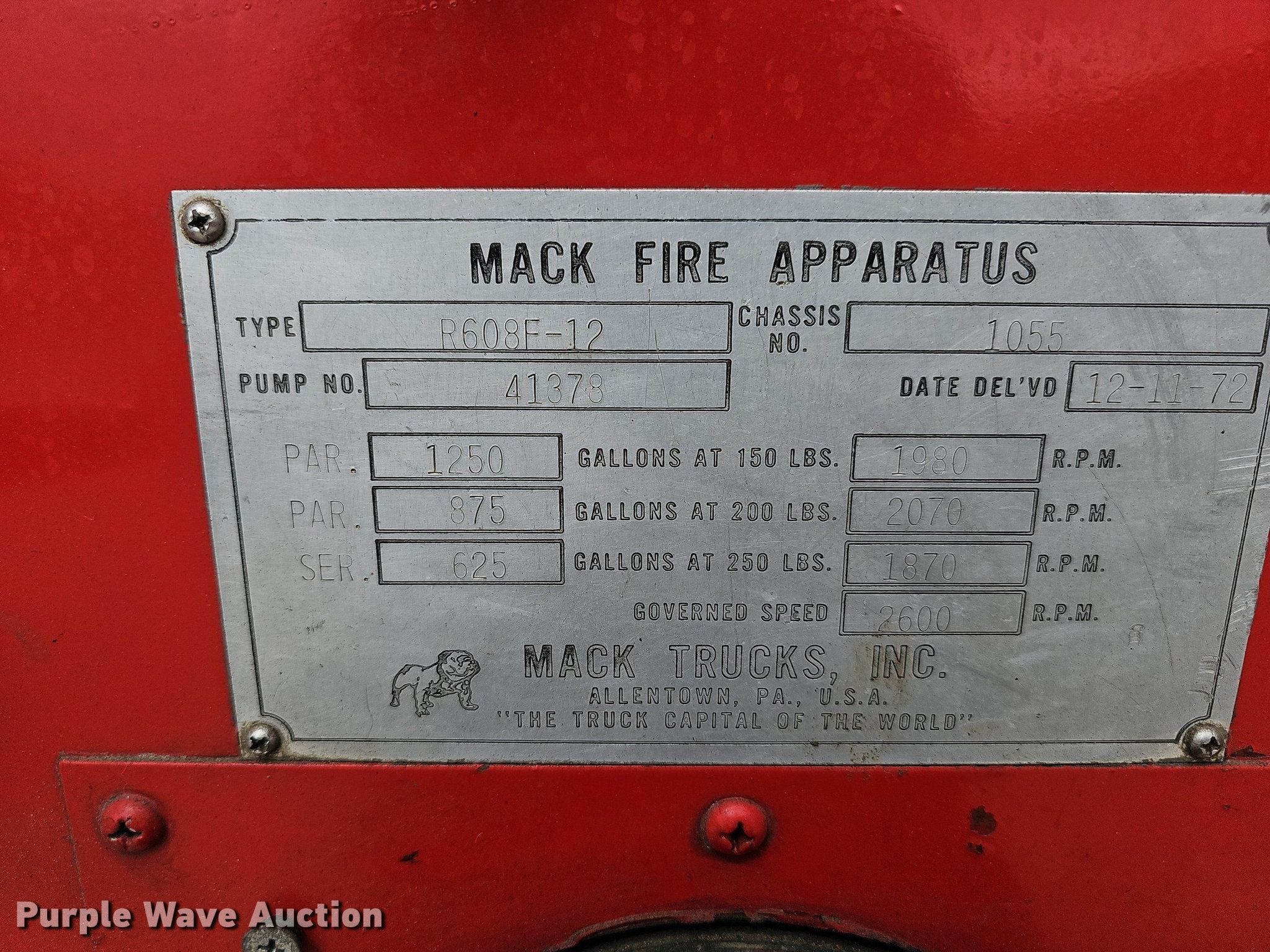 1973 Mack pumper fire truck. Miles: 91,065 on odometer, VIN: R608F1055. Engine Mack, Cylinders: 6, Fuel type: Gas. Transmission Manual, Speed: 5. Chassis Axles: Single, Suspension: Spring, Brakes: Air. Interior Heat. Features Fire truck body Pump 1,250 gpm, Hose reel Hose, Ladder. Tires Size: 9.00R20. Notes Contents not included, Dead battery. Missouri title. Title distribution may be delayed up to 14 days from verification of funds. Wheatland Vol Fire dept. 18901 Missouri 83. Wheatland, MO 65779