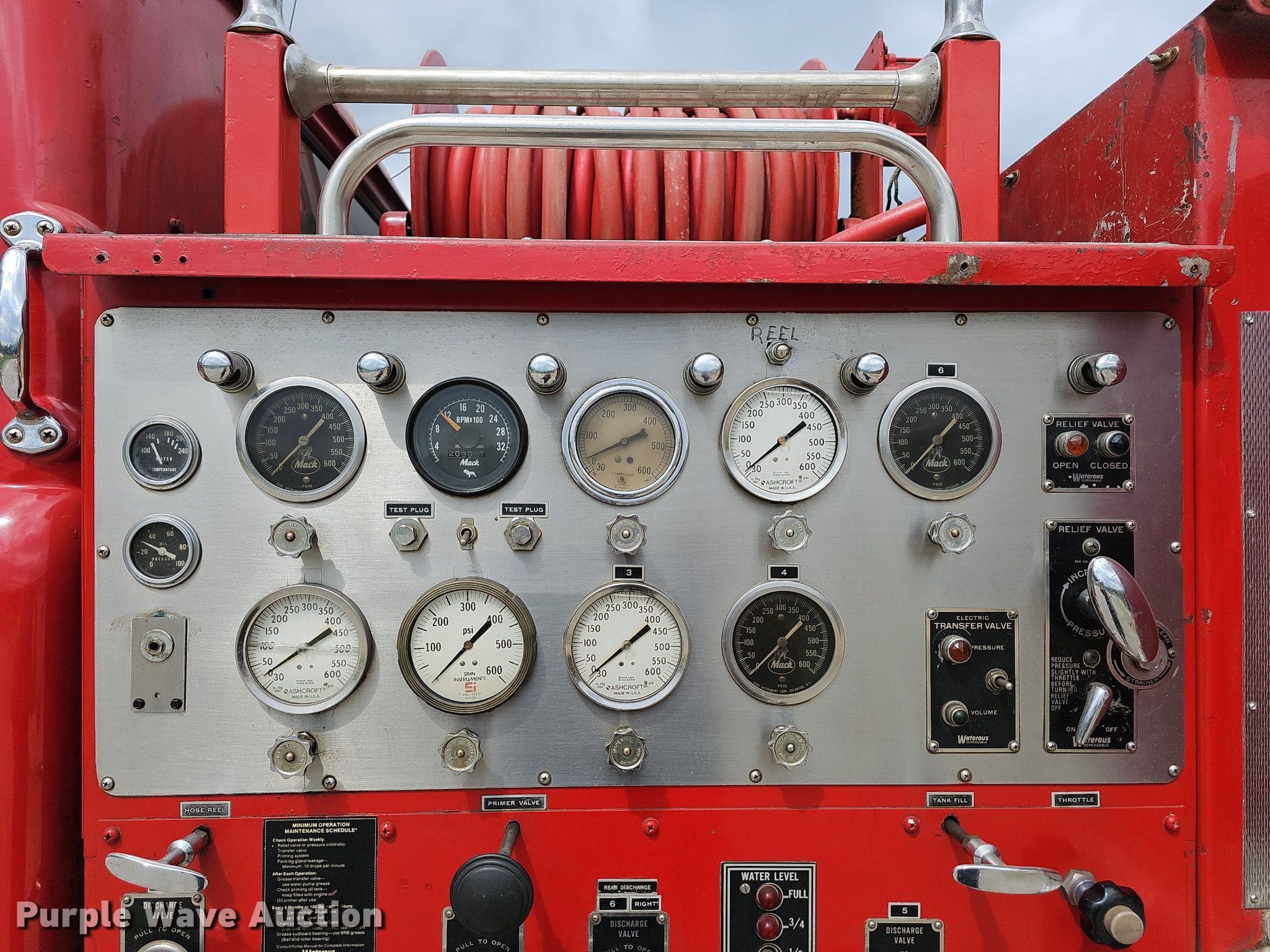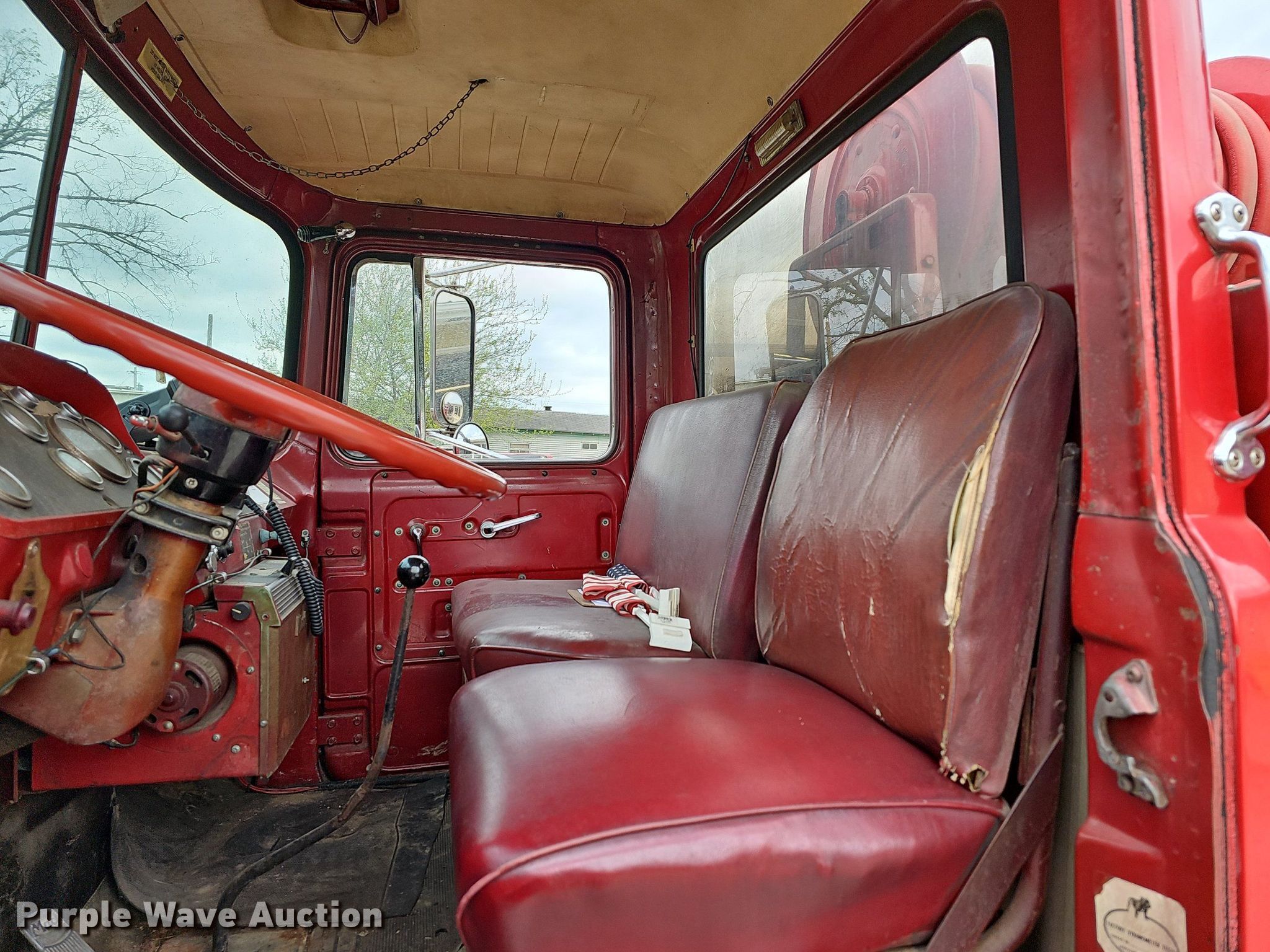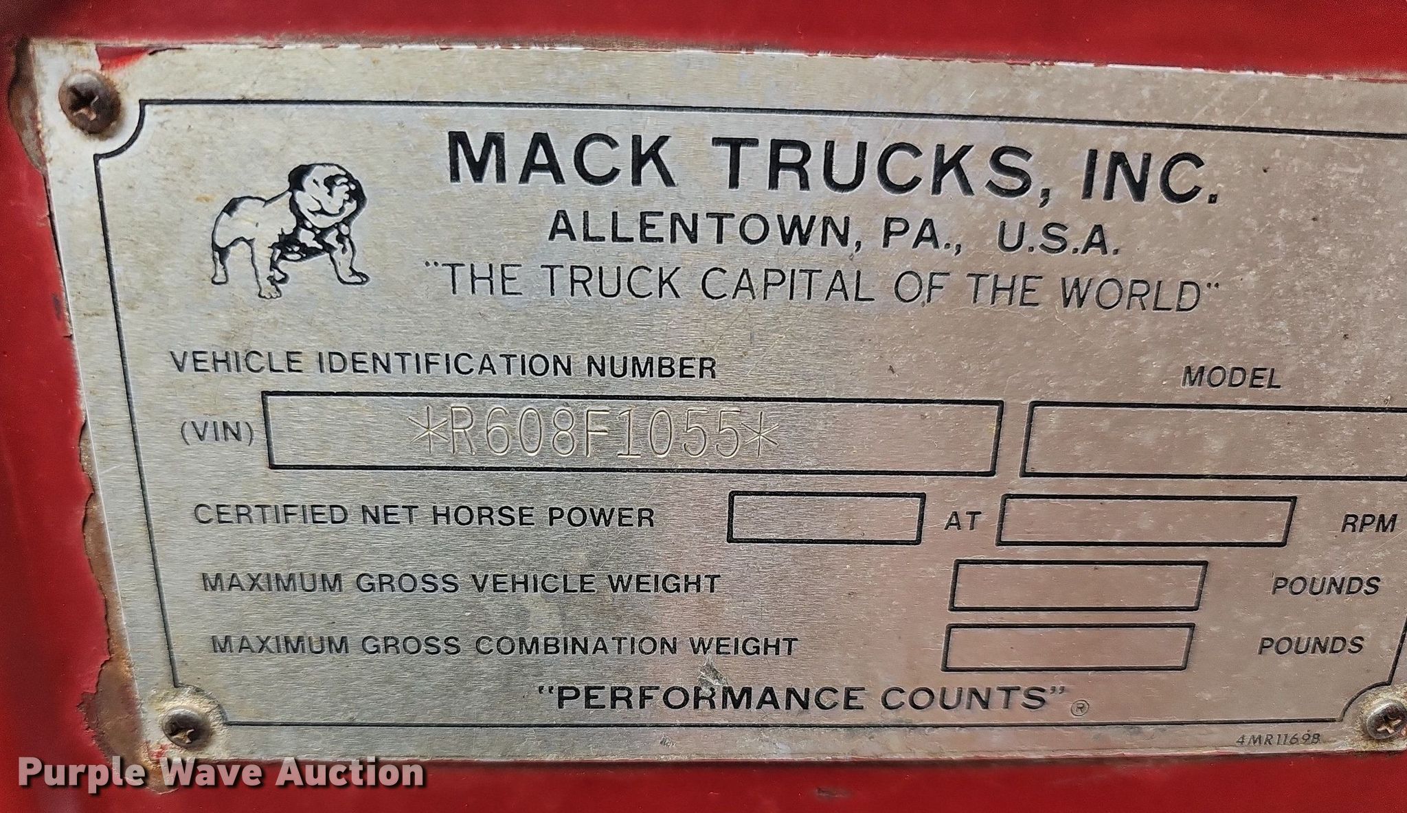 1973 Mack pumper fire truck. Miles: 91,065 on odometer, VIN: R608F1055. Engine Mack, Cylinders: 6, Fuel type: Gas. Transmission Manual, Speed: 5. Chassis Axles: Single, Suspension: Spring, Brakes: Air. Interior Heat. Features Fire truck body Pump 1,250 gpm, Hose reel Hose, Ladder. Tires Size: 9.00R20. Notes Contents not included, Dead battery. Missouri title. Title distribution may be delayed up to 14 days from verification of funds. Wheatland Vol Fire dept. 18901 Missouri 83. Wheatland, MO 65779