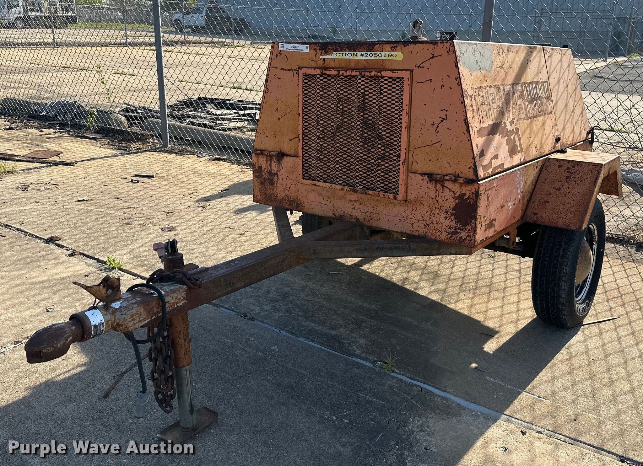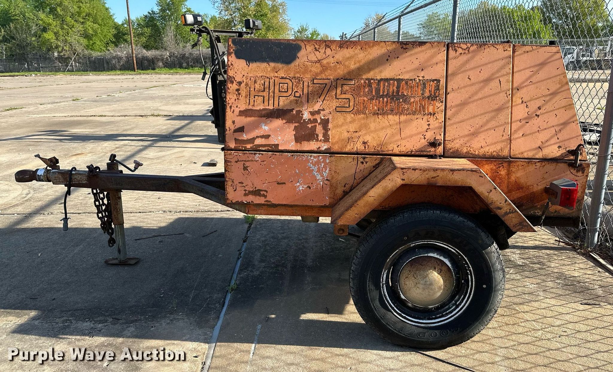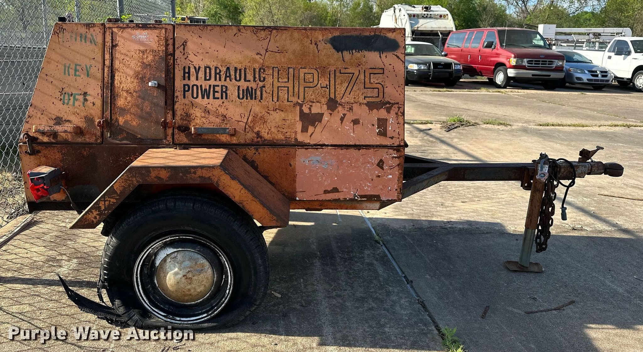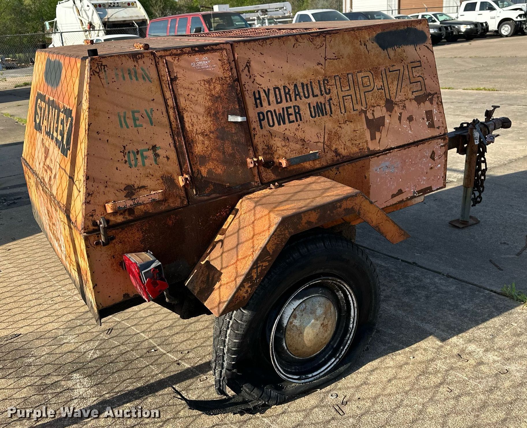 Stanley HP-175 hydraulic power unit. Hours: 103 on meter. Engine Cylinders: 3, Fuel type: Diesel. Trailer 8' 6" L x 60" W, Ball hitch size: 2 5/16", Suspension: Spring, Brakes: Electric, Axles: Single, Tire size: 175/80R13. Notes Tire damaged, Unknown operating condition. Transfer of ownership documentation will be a bill of sale. City of Broken Arrow, OK. 2304 First St. Broken Arrow, OK 74012