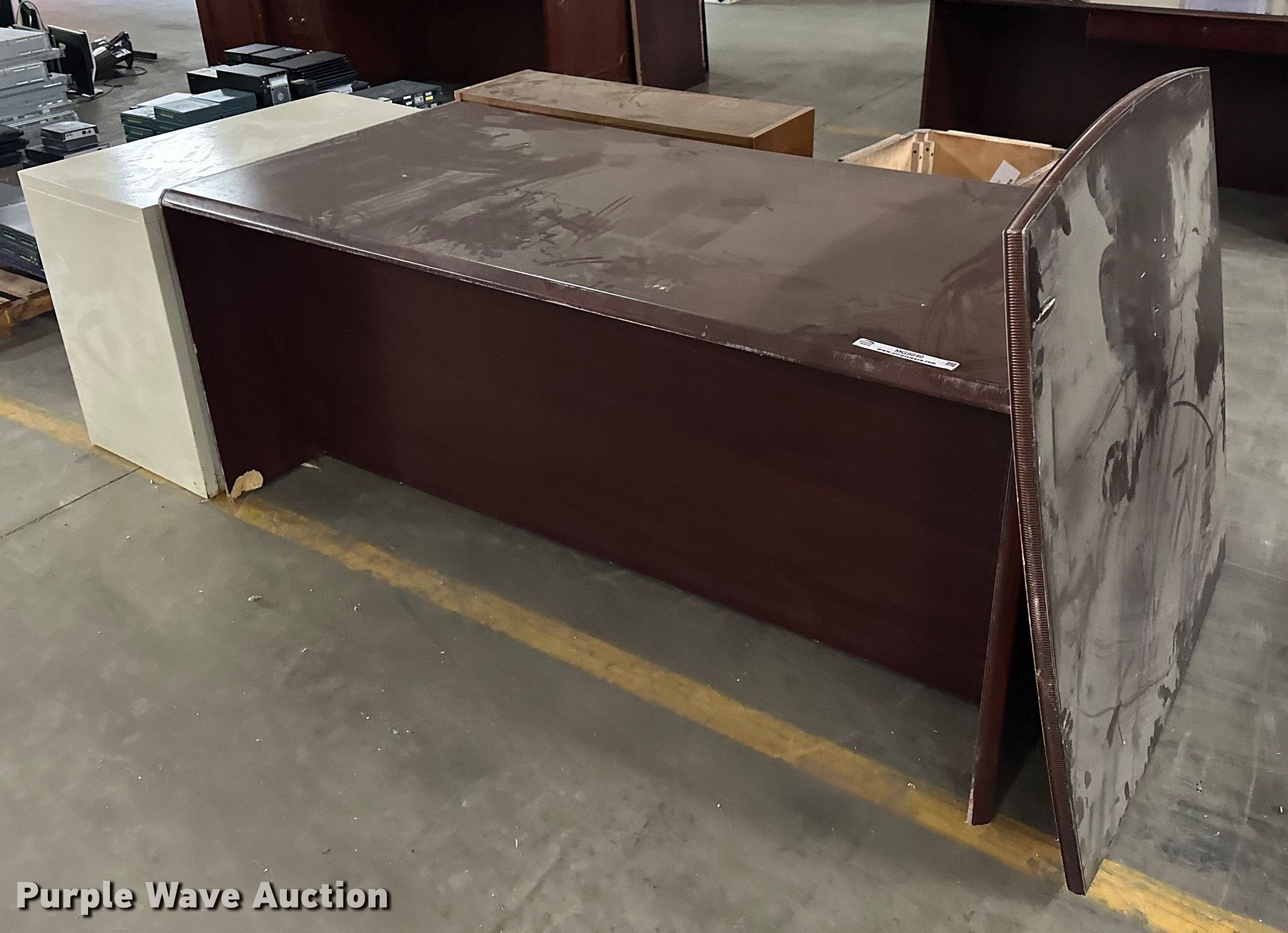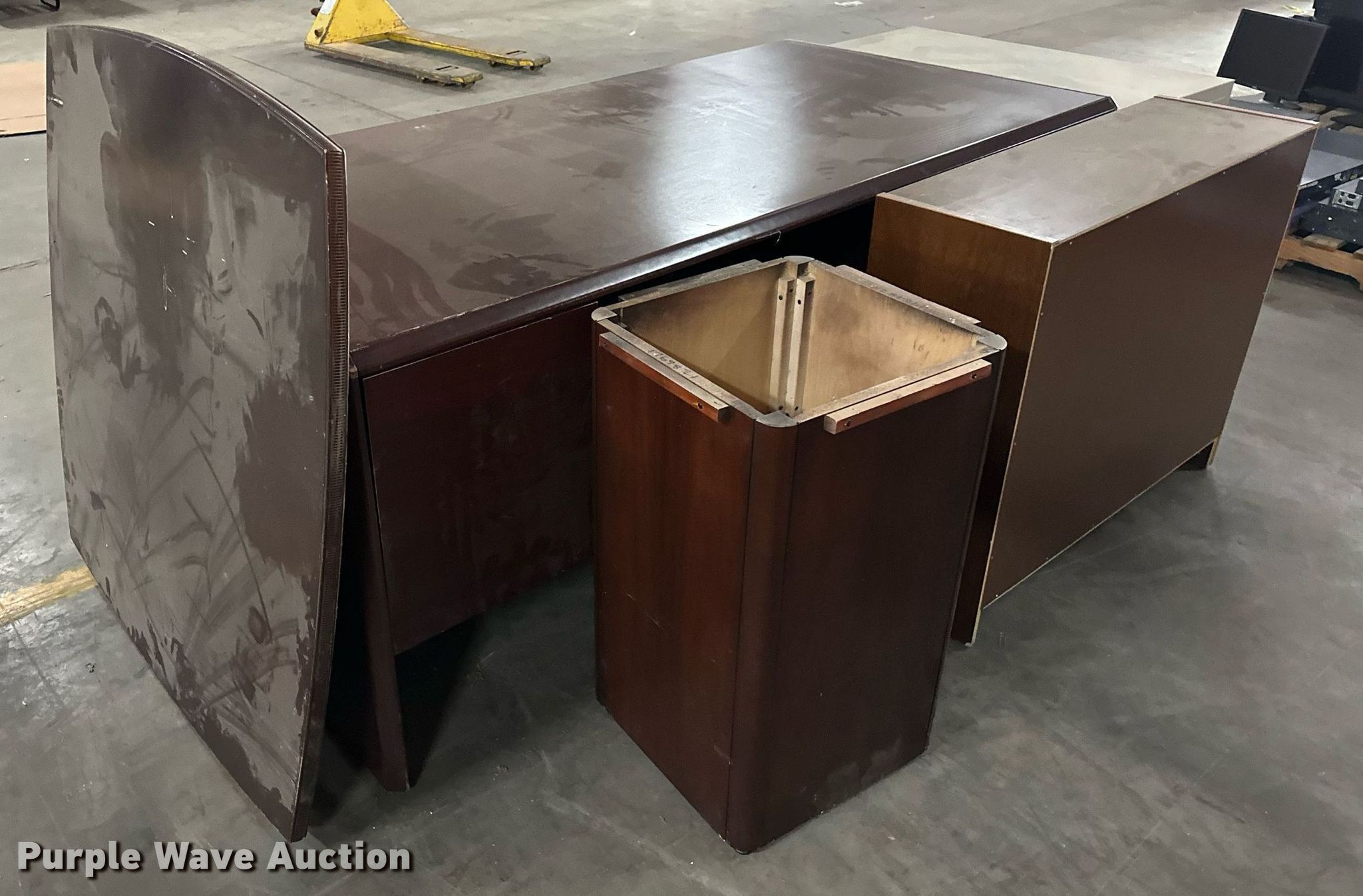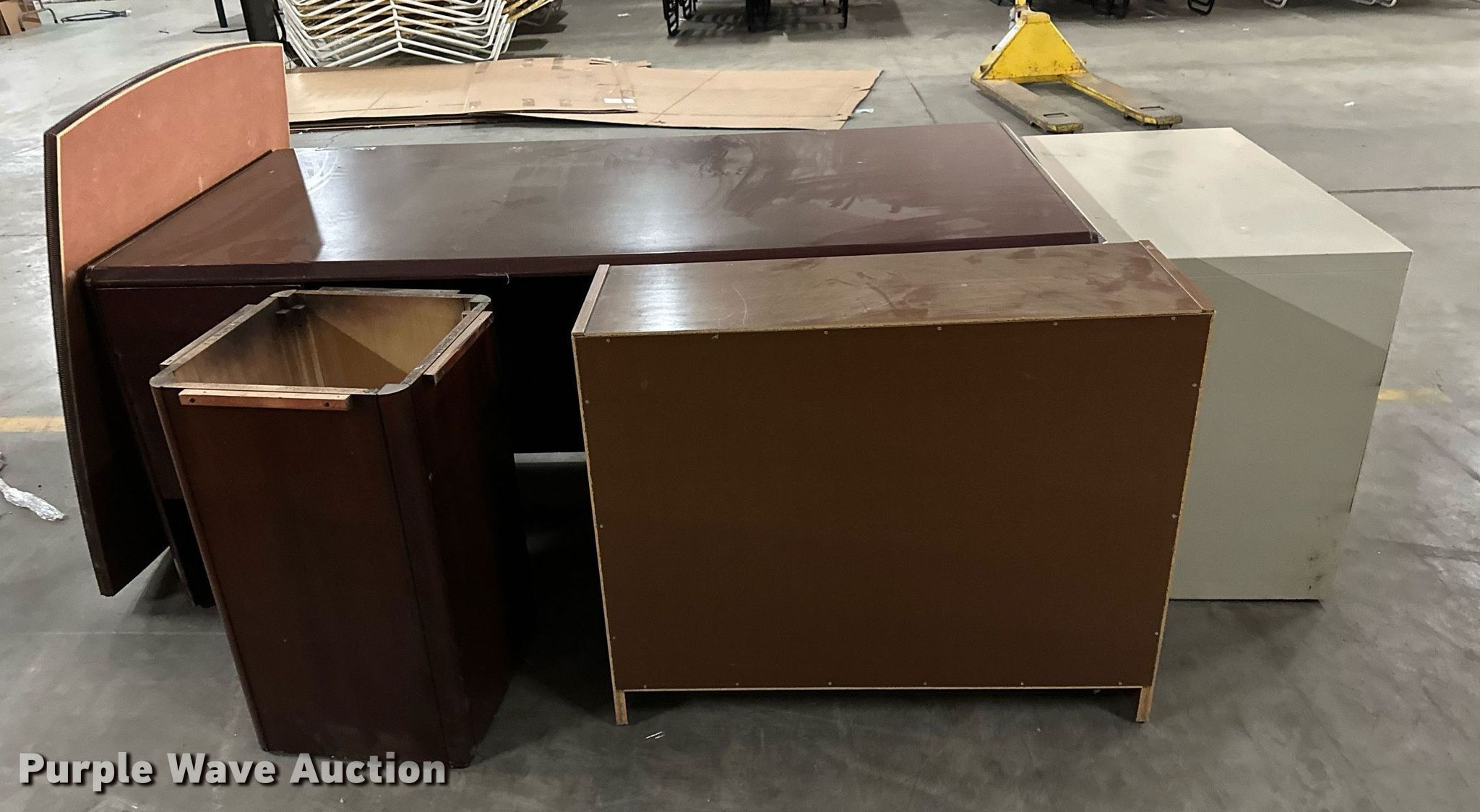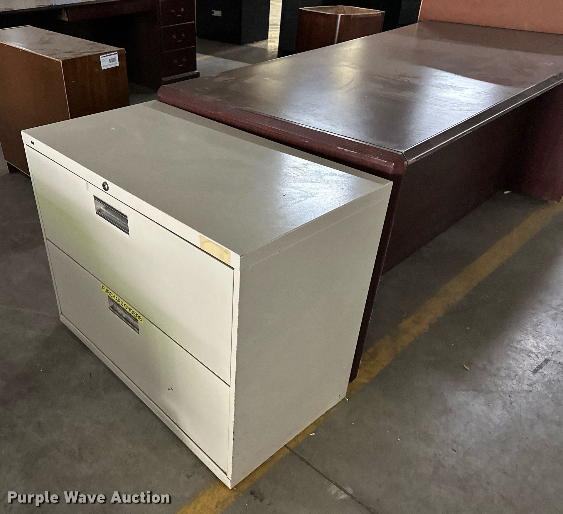 Purple Wave is selling a used Furniture in Oklahoma. This item is a Furniture with the following: Four drawer desk, Book shelf, Round desk, Two drawer file cabinet