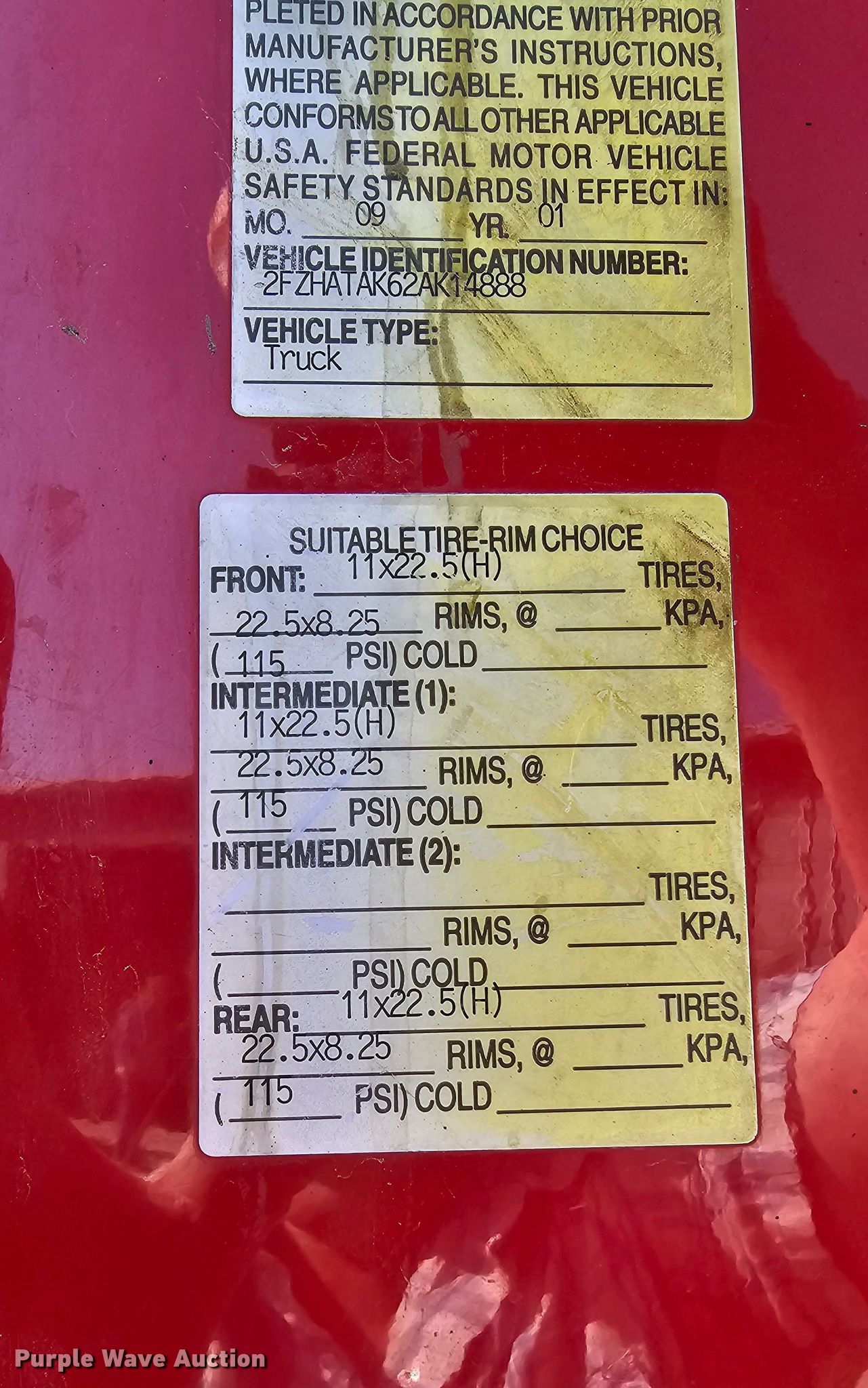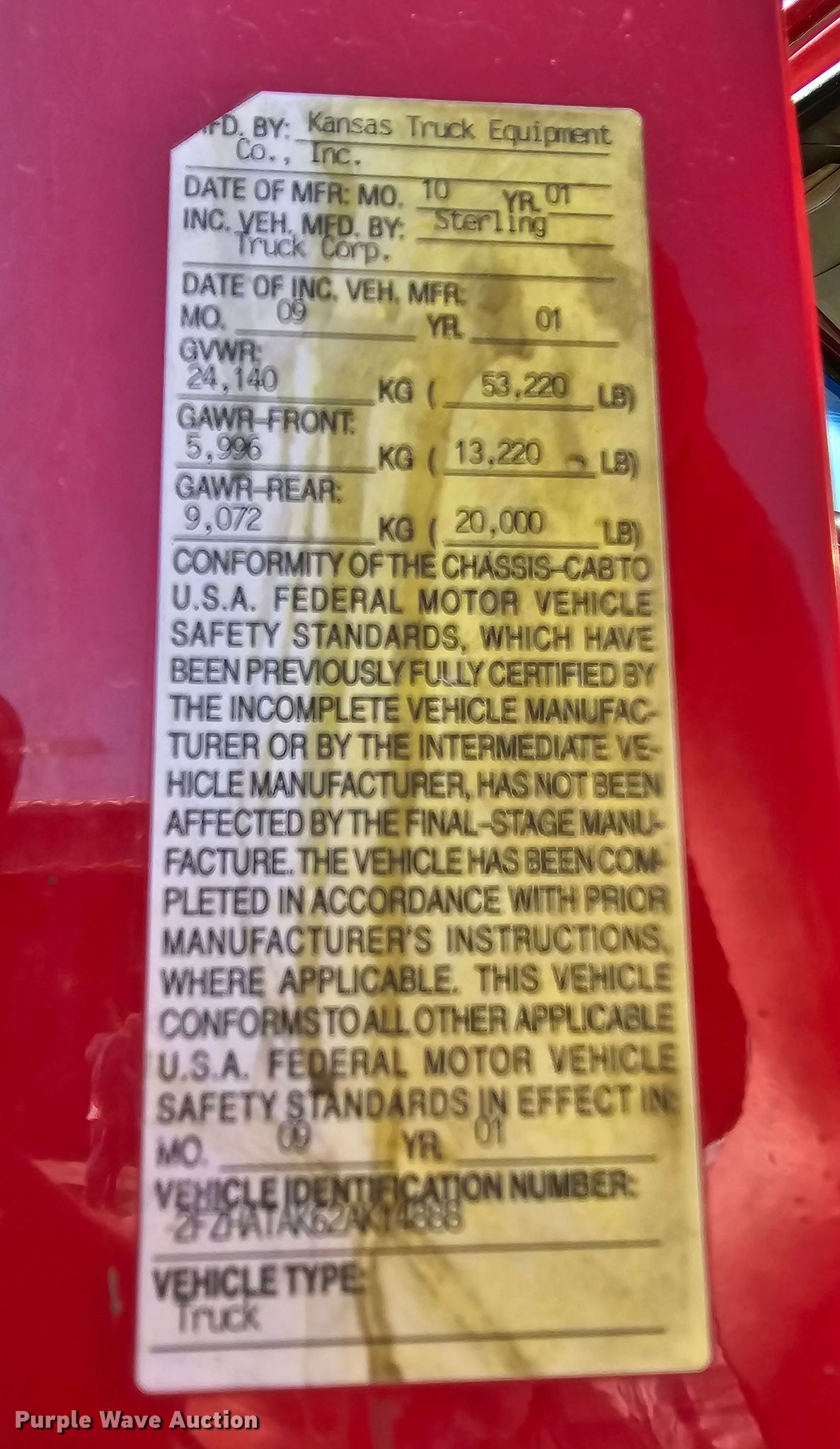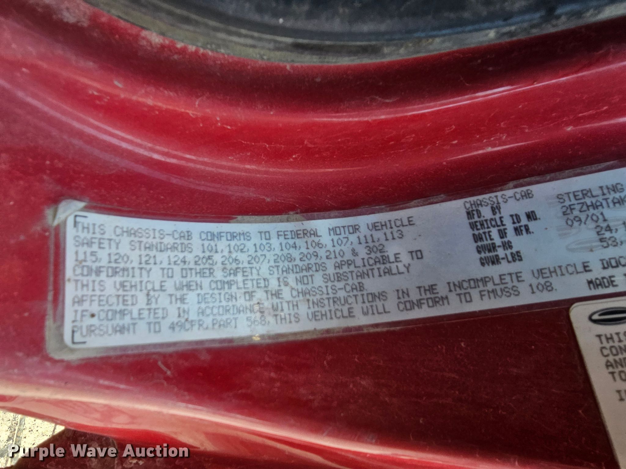 2002 Sterling L-Line dump truck. Miles: 351,764 on odometer, VIN: 2FZHATAK62AK14888, Unit #: 37. Engine Caterpillar 3126, Displacement: 7.2L, Cylinders: 6, Fuel type: Diesel. Transmission Allison , Automatic. Chassis Axles: Tandem, Differential lock: Inter-axle, Suspension: Spring over walking beam, Brakes: Air, GVWR: 53,220 lbs FAWR: 13,220 lbs, RAWR: 20,000 lbs, Wheelbase: 192". Interior AC, Heat, Cruise control. Features Dump bed Warren FL65115, Capacity: 13.15 cu.yd., 15' L x 8' W, Side height: 36", Bed type: Steel, Ram: Single , End gate: Manual, Plow mount Flink. Tires Size: 11R22.5, Brand: Firestone. Notes End gate removed, but included, Non-operational passenger side fuel tank, Exhaust leak, Windshield chipped or cracked. Kansas title. Title distribution may be delayed up to 14 days from verification of funds. Geary County Public Works. Junction City, KS 66441