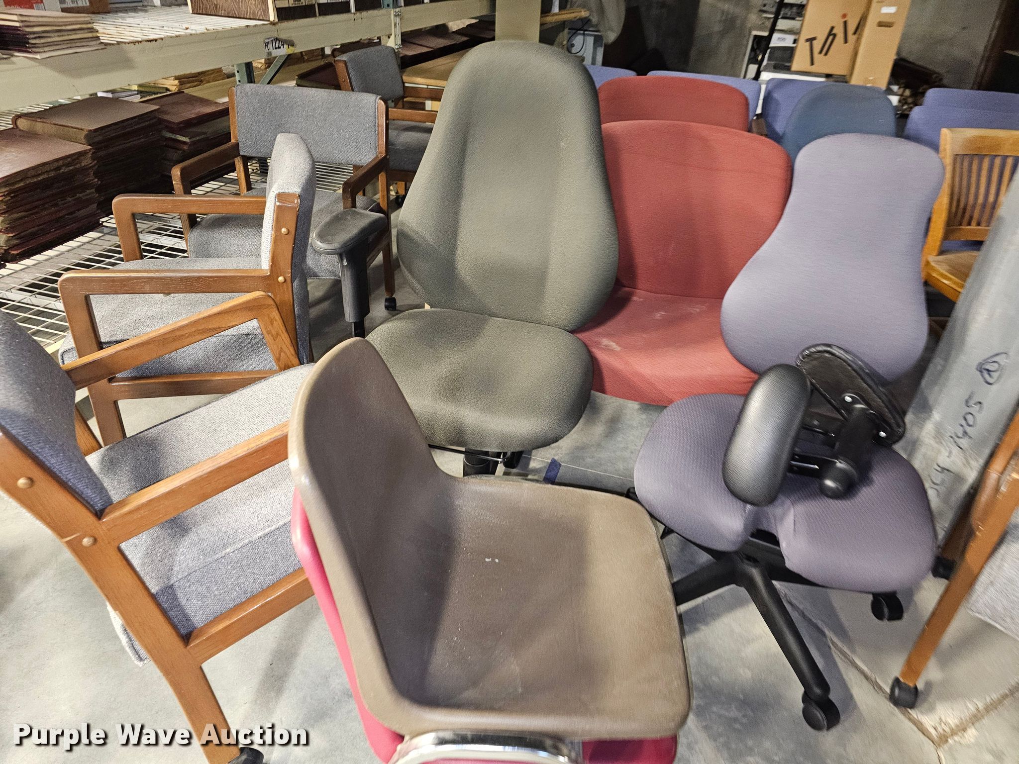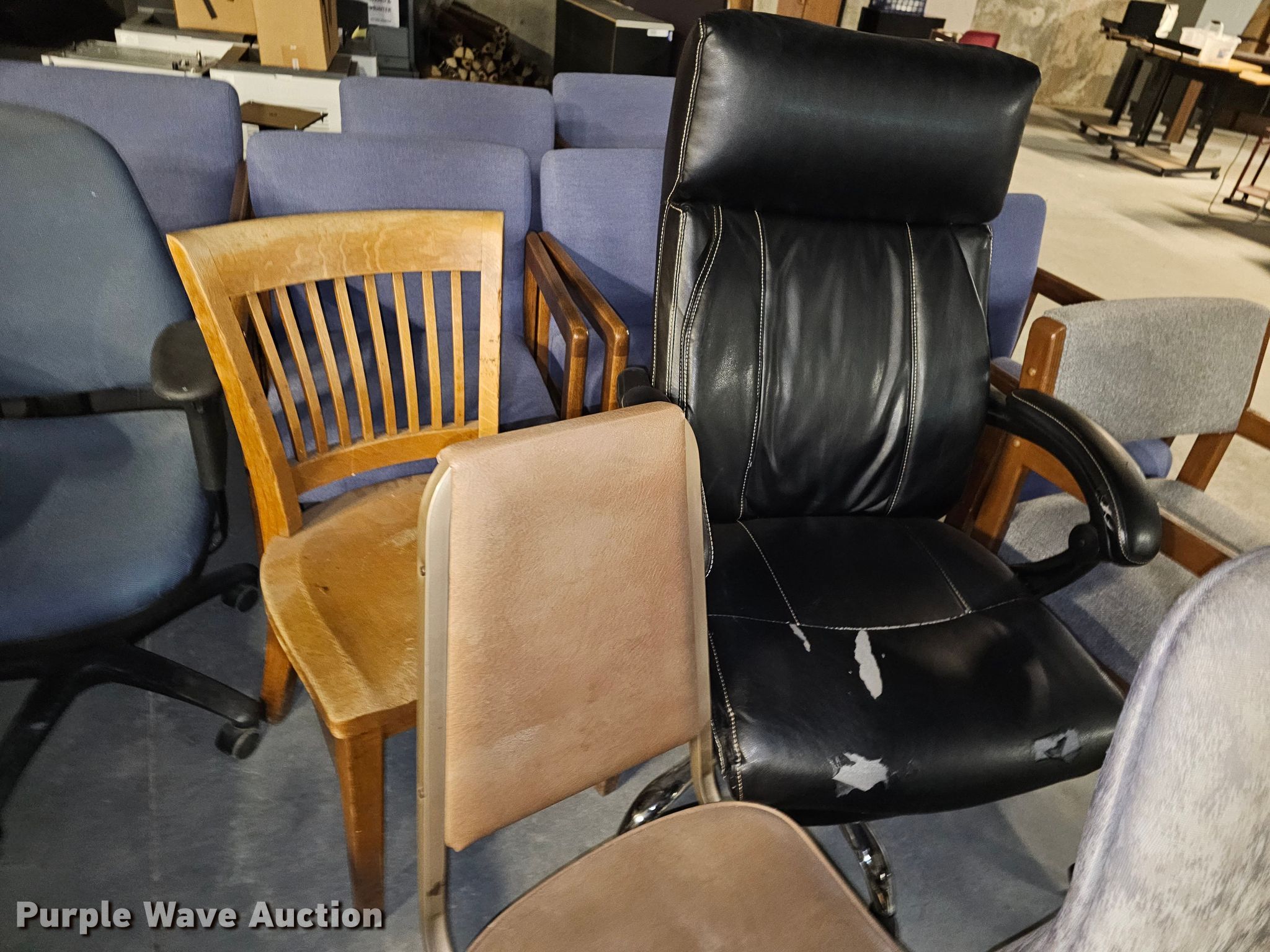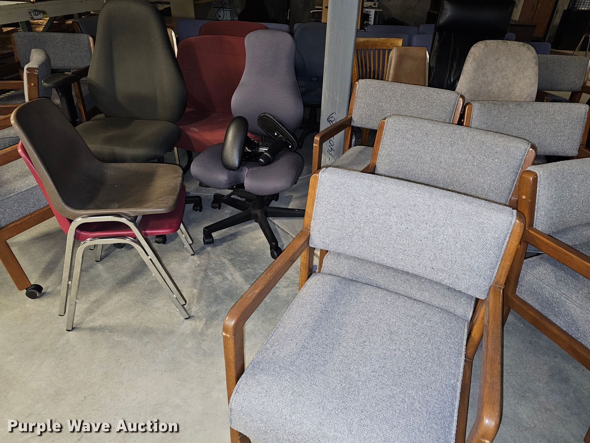 Purple Wave is selling a used Furniture in Kansas. This item is a Approximately 49 chairs with the following: Some damaged