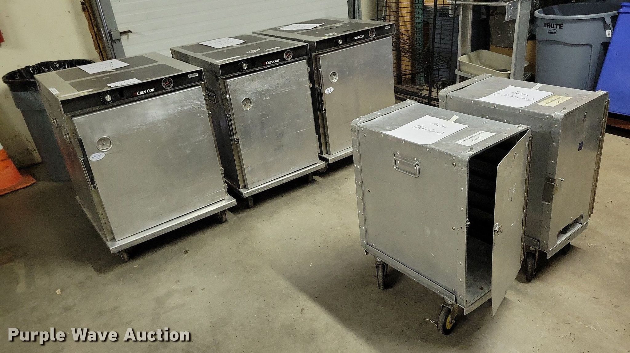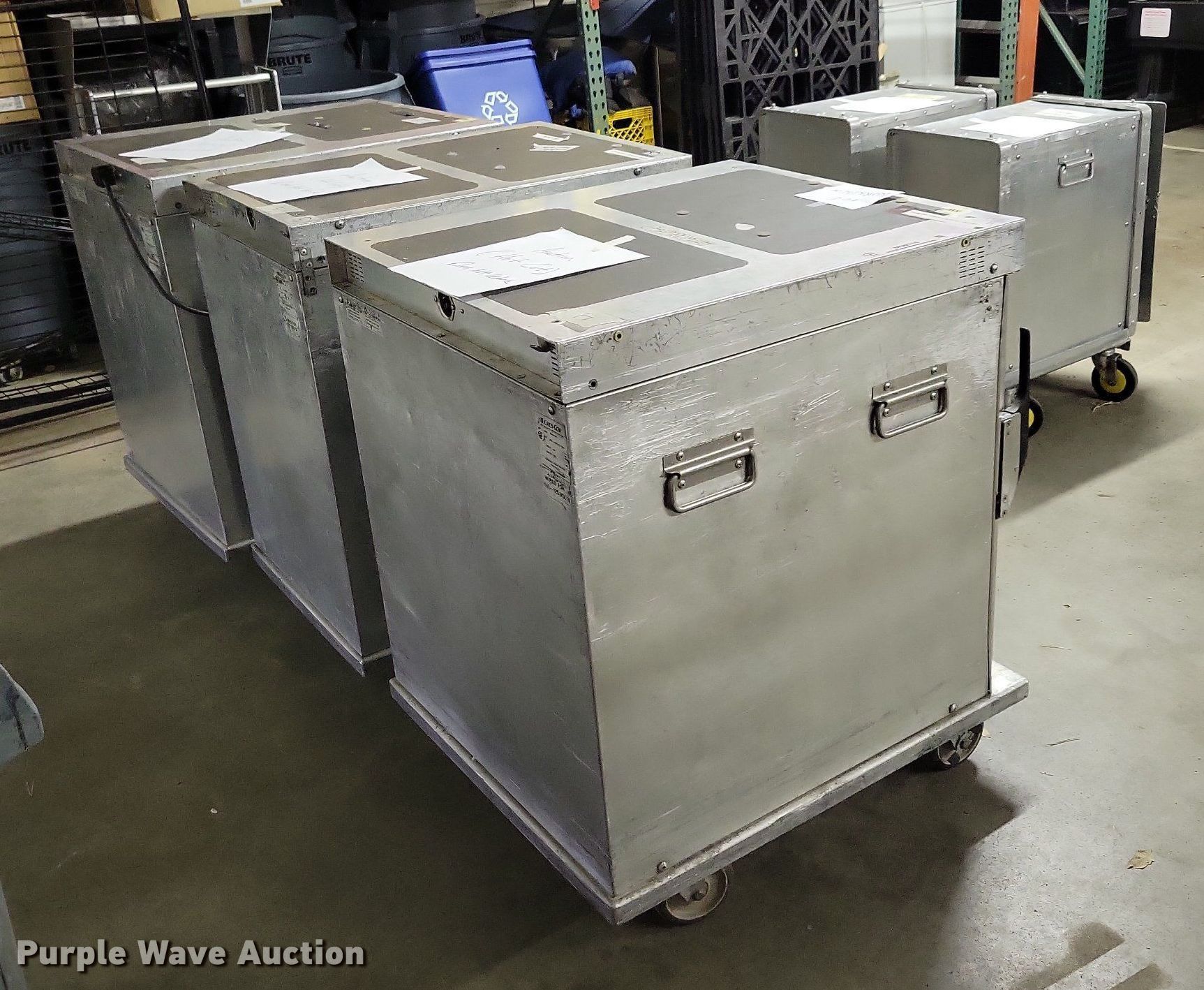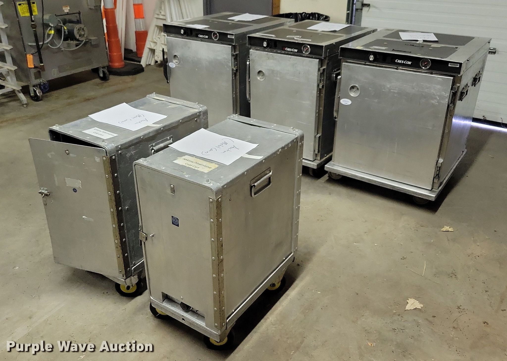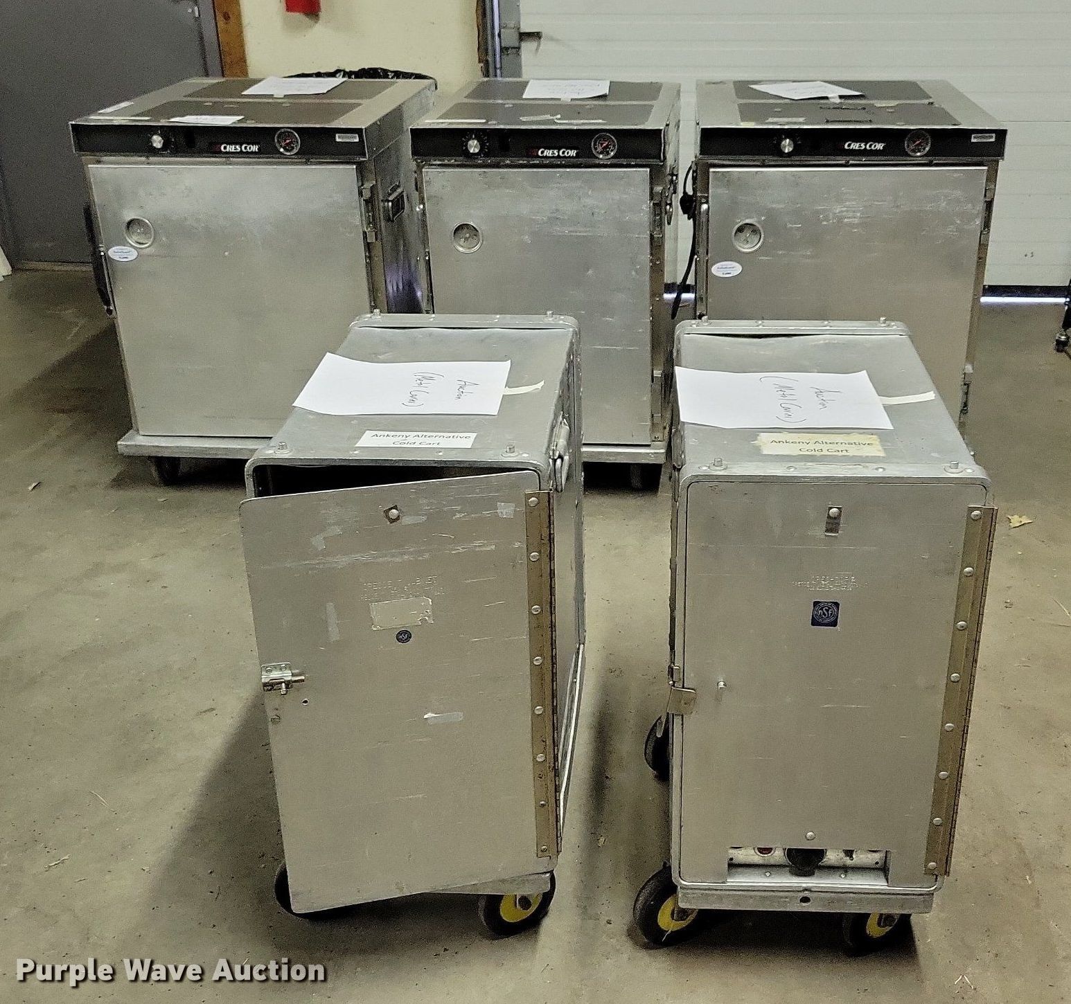 Purple Wave is selling a used Restaurant Equip. in Iowa. This item is a (5) Cres Cor food cabinets with the following: (3) heated cabinets, (2) refrigerated cabinets, Phase: Single, Volts: 120