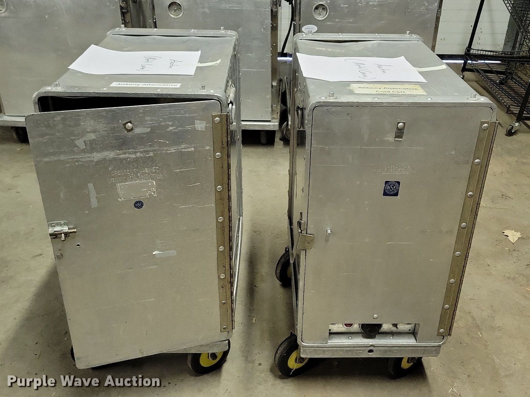 (5) Cres Cor food cabinets. (3) heated cabinets, (2) refrigerated cabinets, Phase: Single, Volts: 120. Notes Non-operational unit. Ankeny School District. 1513 SE Cortina Dr. Ankeny, IA 50021