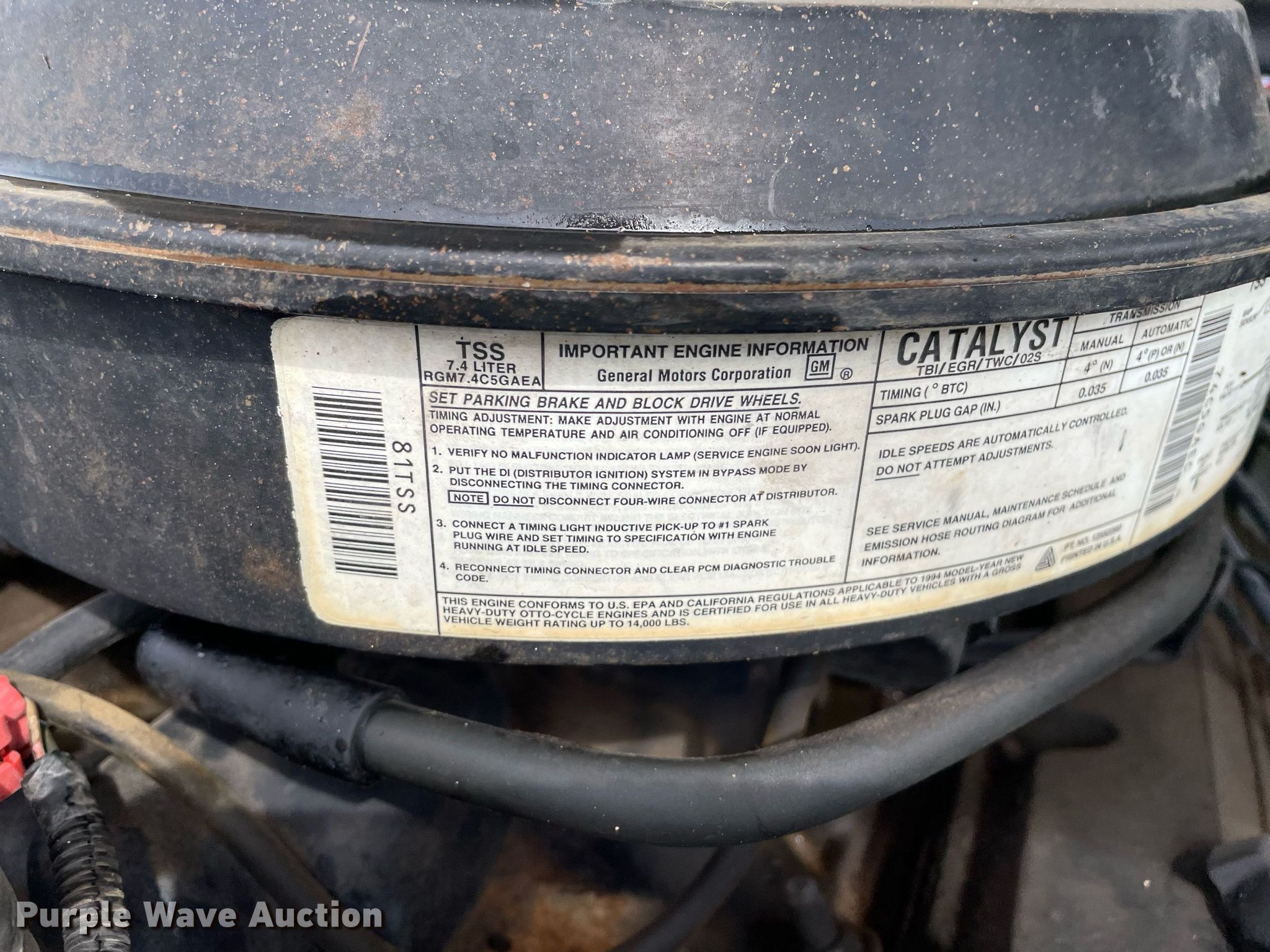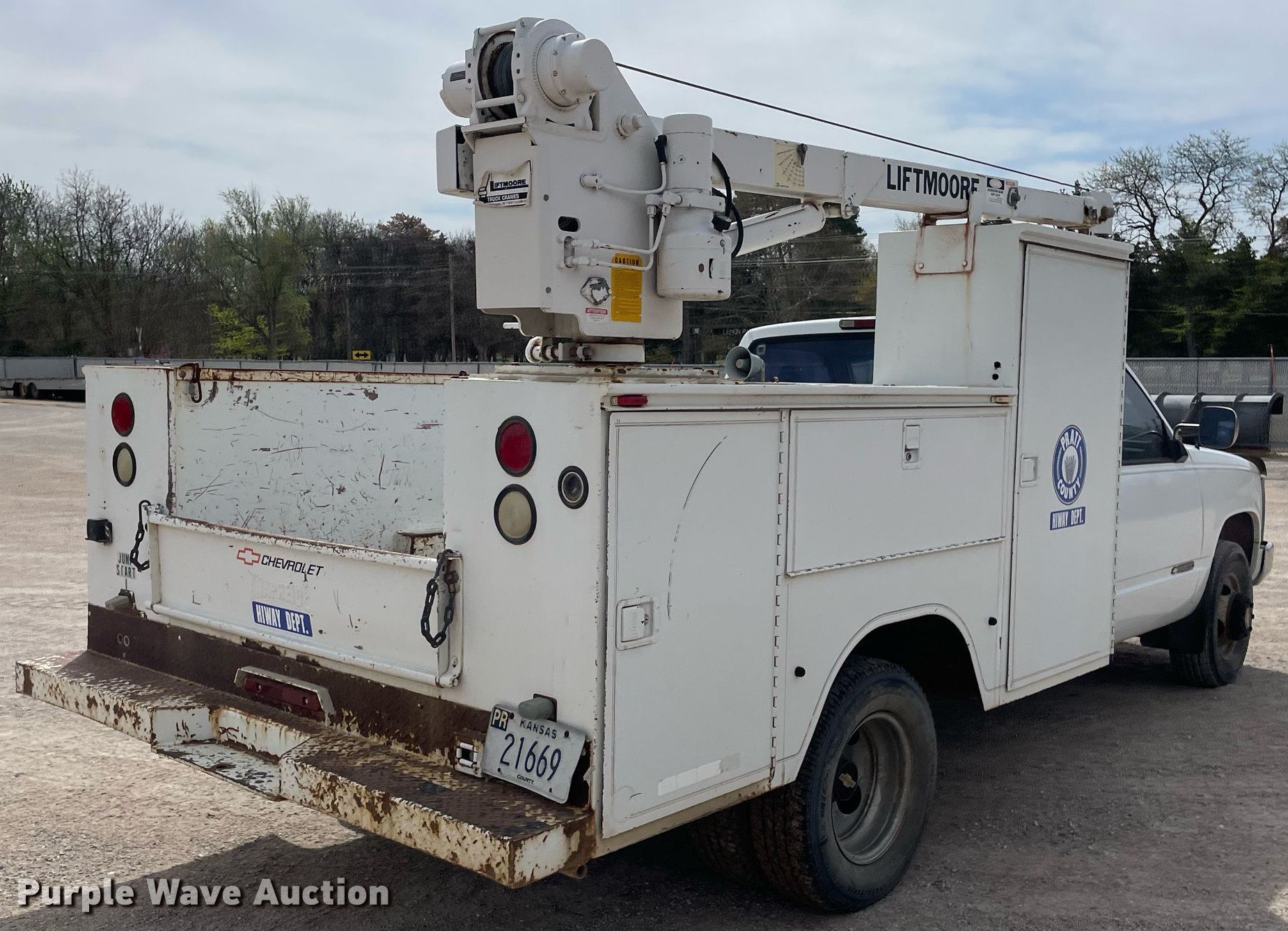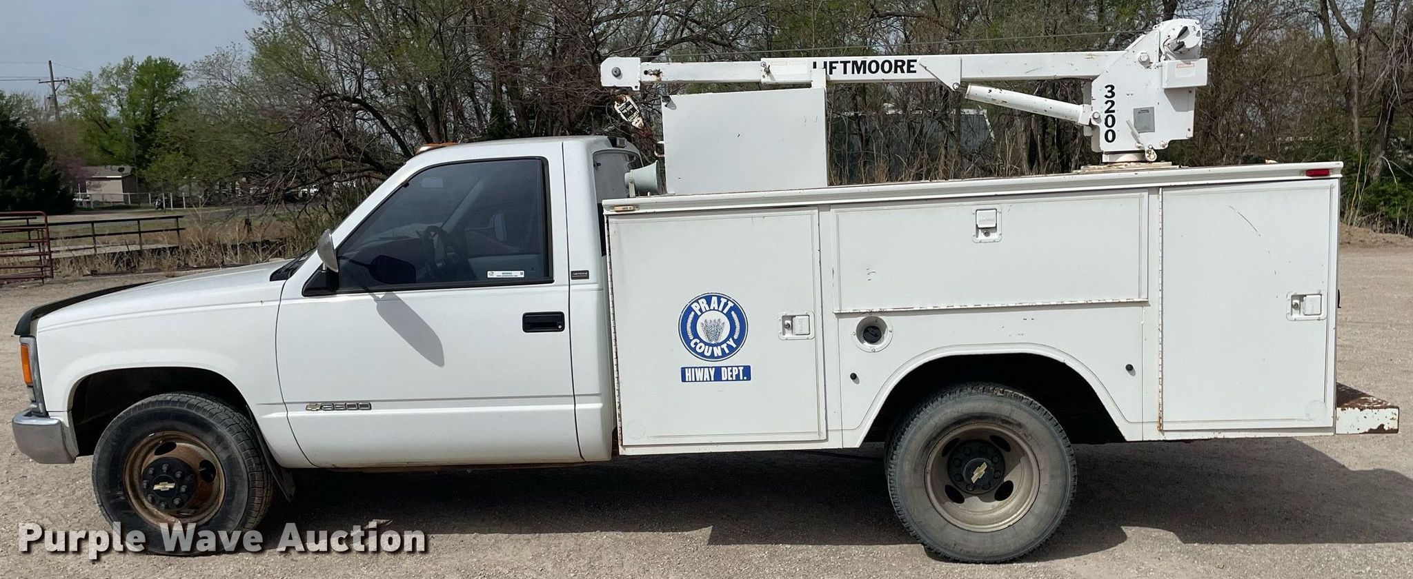 1994 Chevrolet C3500 utility bed pickup truck. Miles: 230,686 on odometer, VIN: 1GBJC34NXRE125045. Engine Displacement: 7.4L V8 OHV, Cylinders: 8, Fuel type: Gas. Transmission Manual, Speed: 5. Interior AC, Heat. Features Utility bed Knapheide, 9' 8" L x 89" W, Crane Liftmore 3200, Air compressor Iowa Mold Tooling HD300. Tires Size: 225/75R16. Notes Dead battery, Clutch issues. Kansas title. Title distribution may be delayed up to 14 days from verification of funds. Pratt County Road Department. Pratt, KS 67124