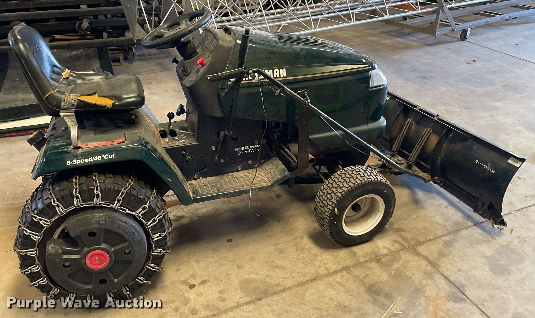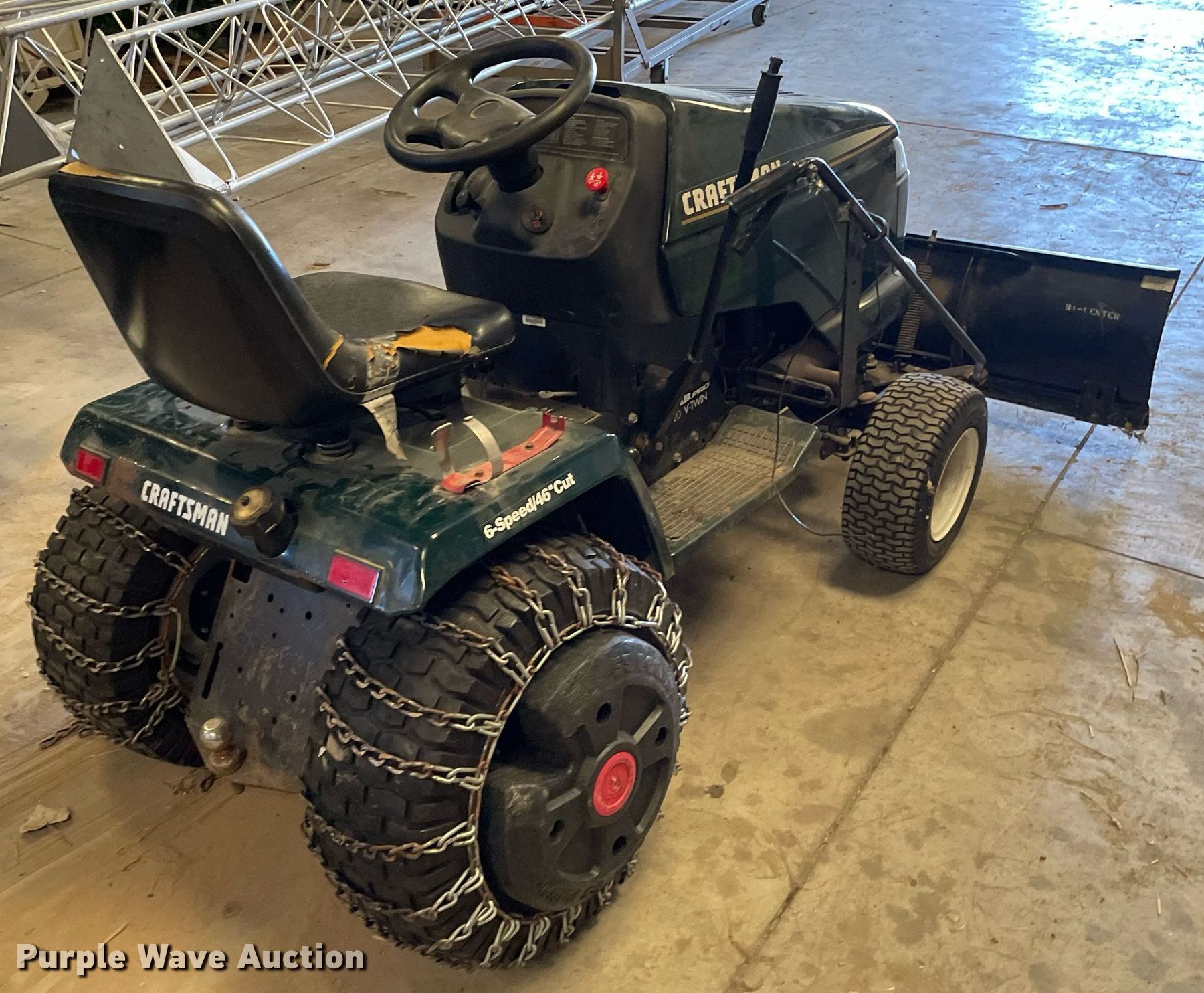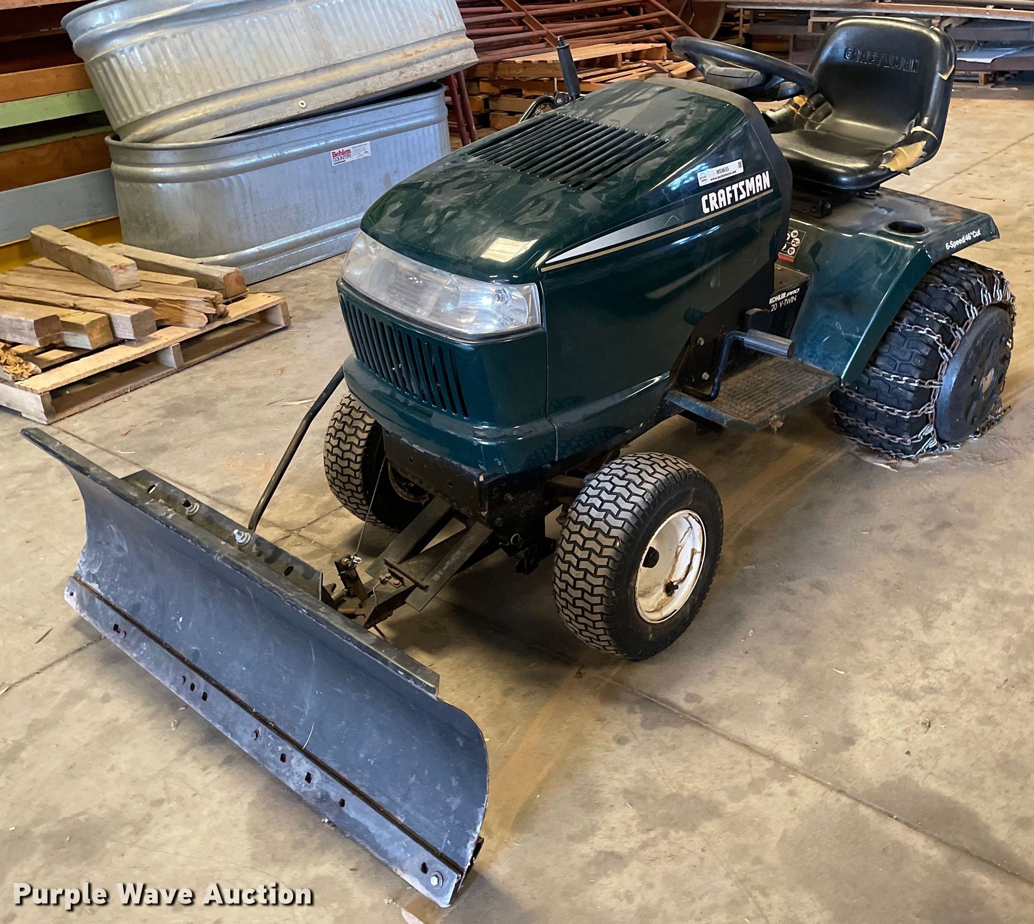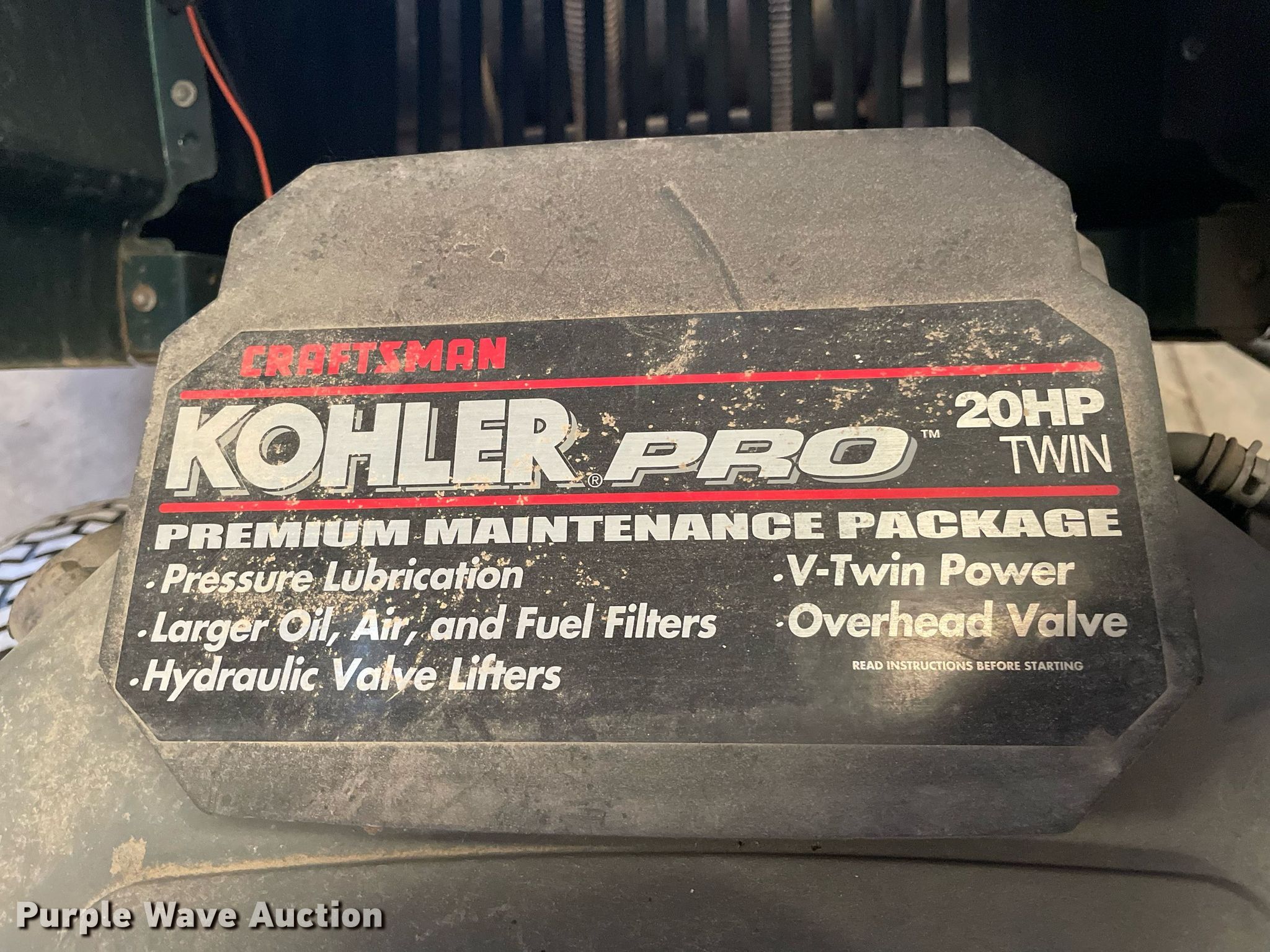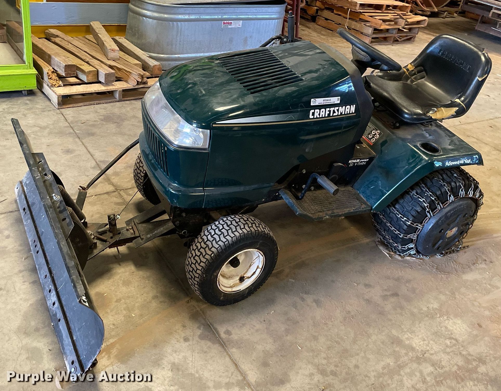 Craftsman 917273013 lawn mower. Serial: 070699A001779. Engine Kohler, Cylinders: 2, Fuel type: Gas, HP: 20. Transmission Manual, 6F - 2R. Features 48" W Craftsman snow plow. Tires Front: 16x8.50-8, Wheel weights. Notes Flat tire, Unknown operating condition. Salina, KS 67401