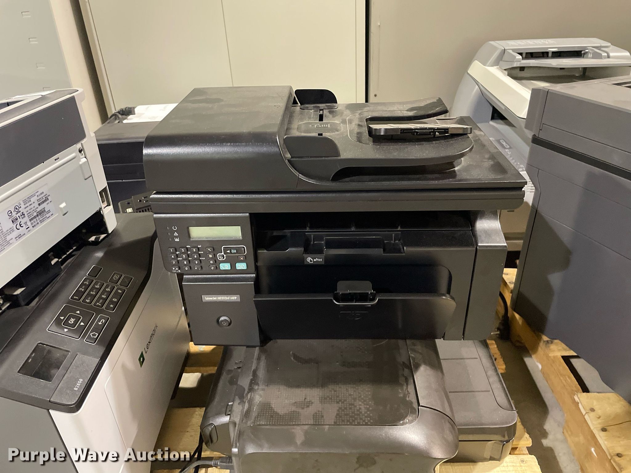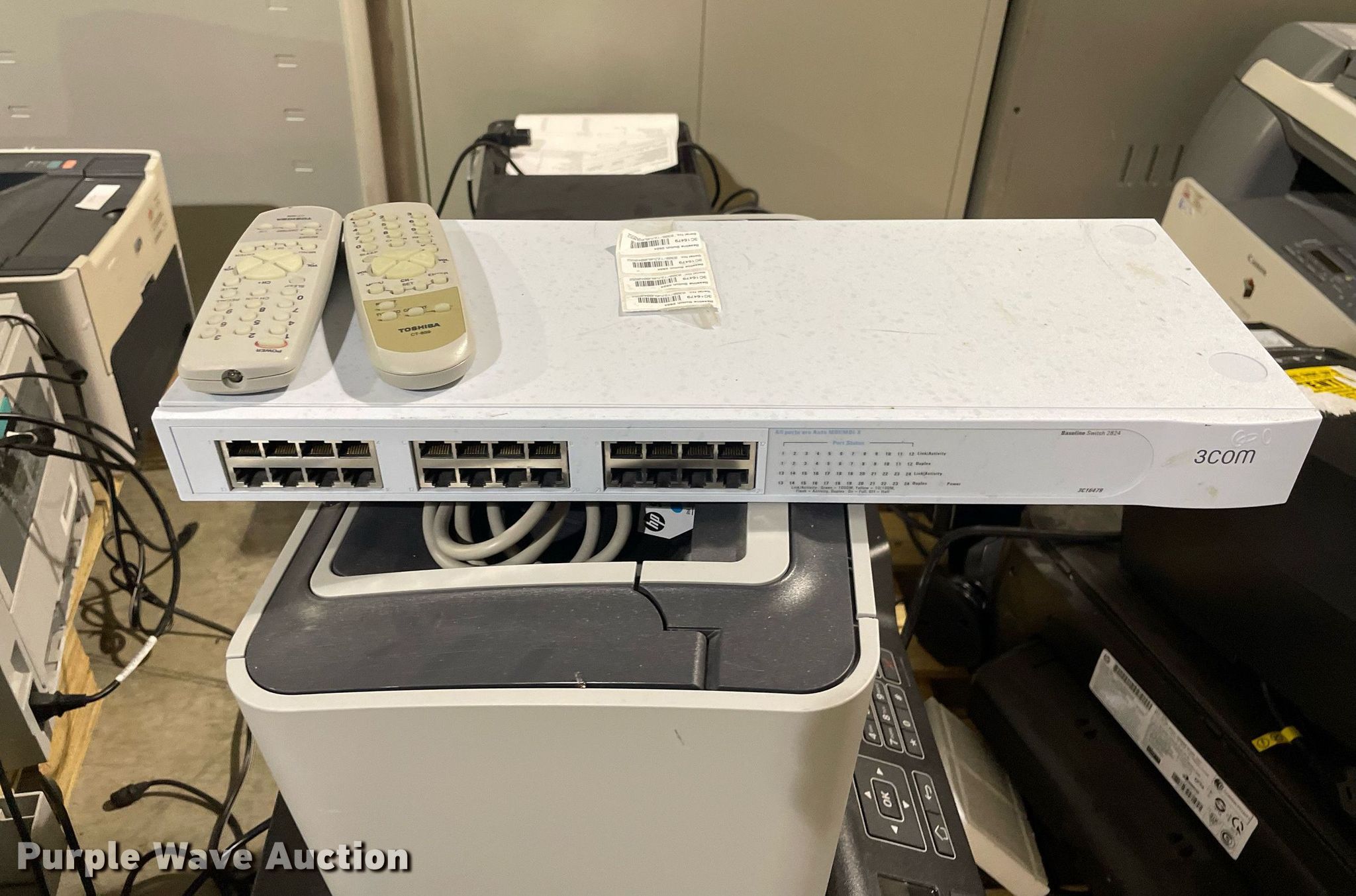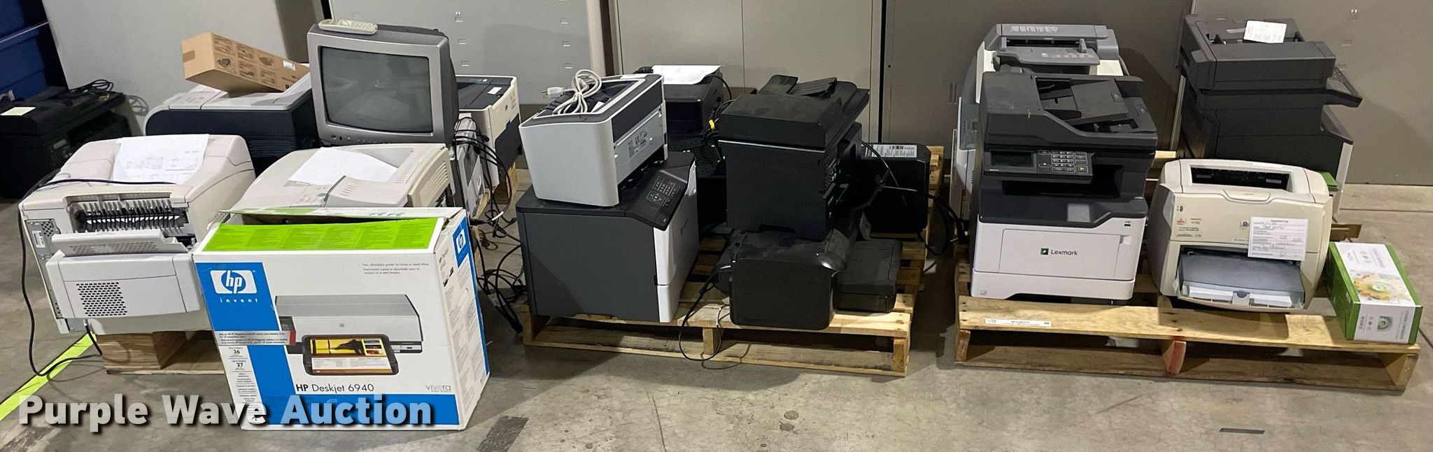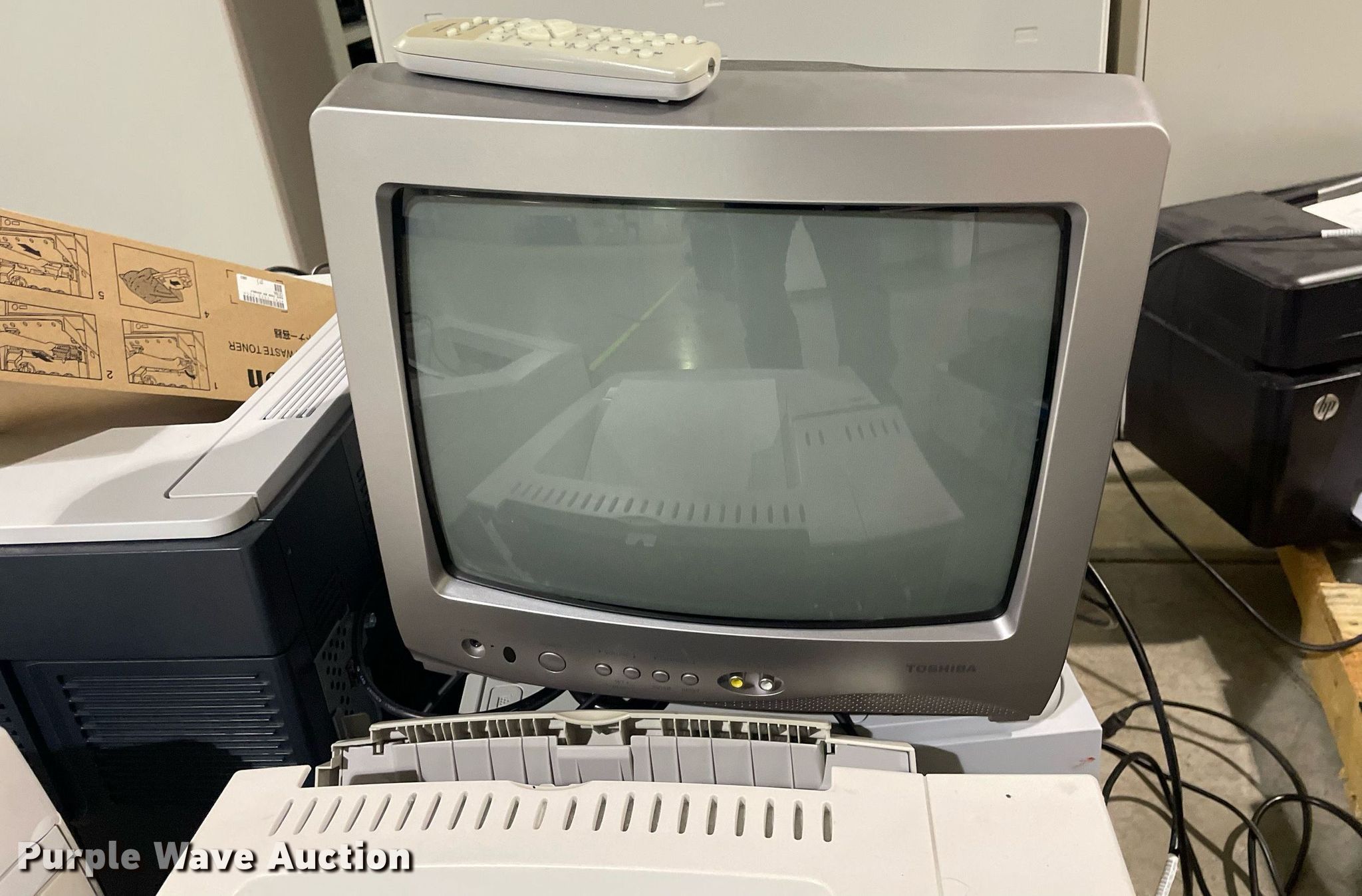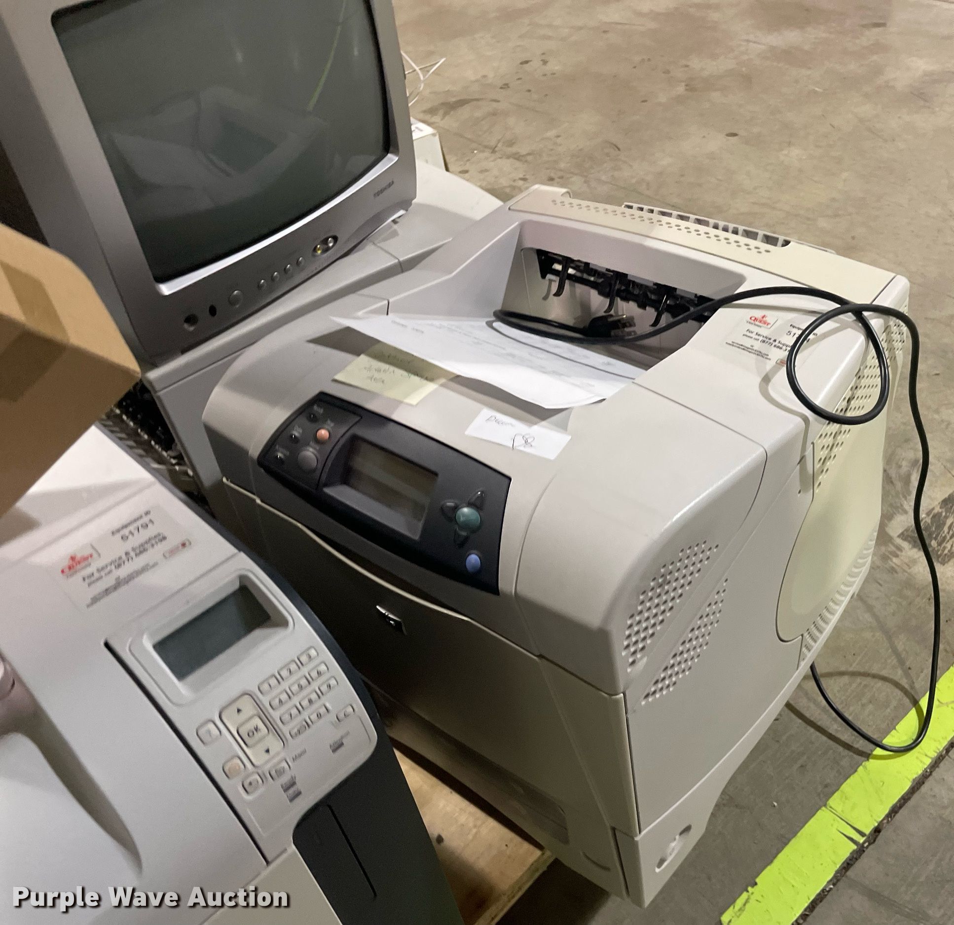 Purple Wave is selling a used Electronics in Kansas. This item is a Electronics with the following: HP LaserJet 1300n printer, Lexmark MB2442 printer, Canon ImageRunner 1025N printer, Lexmark MB2442 printer, HP LaserJet M1212nf MFP printer, HP Pro 8100 printer, APC Smart-Ups 1500 battery backup, Lexmark B2650 printer, HP Laserjet P1505 printer, Tripp-Lite APC battery backup, Linksys wireless-G internet home monitoring camera, 3Com switch, HP LaserJet Pro MFP M127fn printer, HP Deskjet 6940 printer, HP Laserjet 4100n printer, Toshiba 13A25 television, HP Laserjet P2035n printer, HP Laserjet 1320n printer, HP Laserjet P2035n printer, HP Laserjet P4015n printer, HP Laserjet 4240n printer, Canon waste toner bottle, (2) boxes of monitor arms