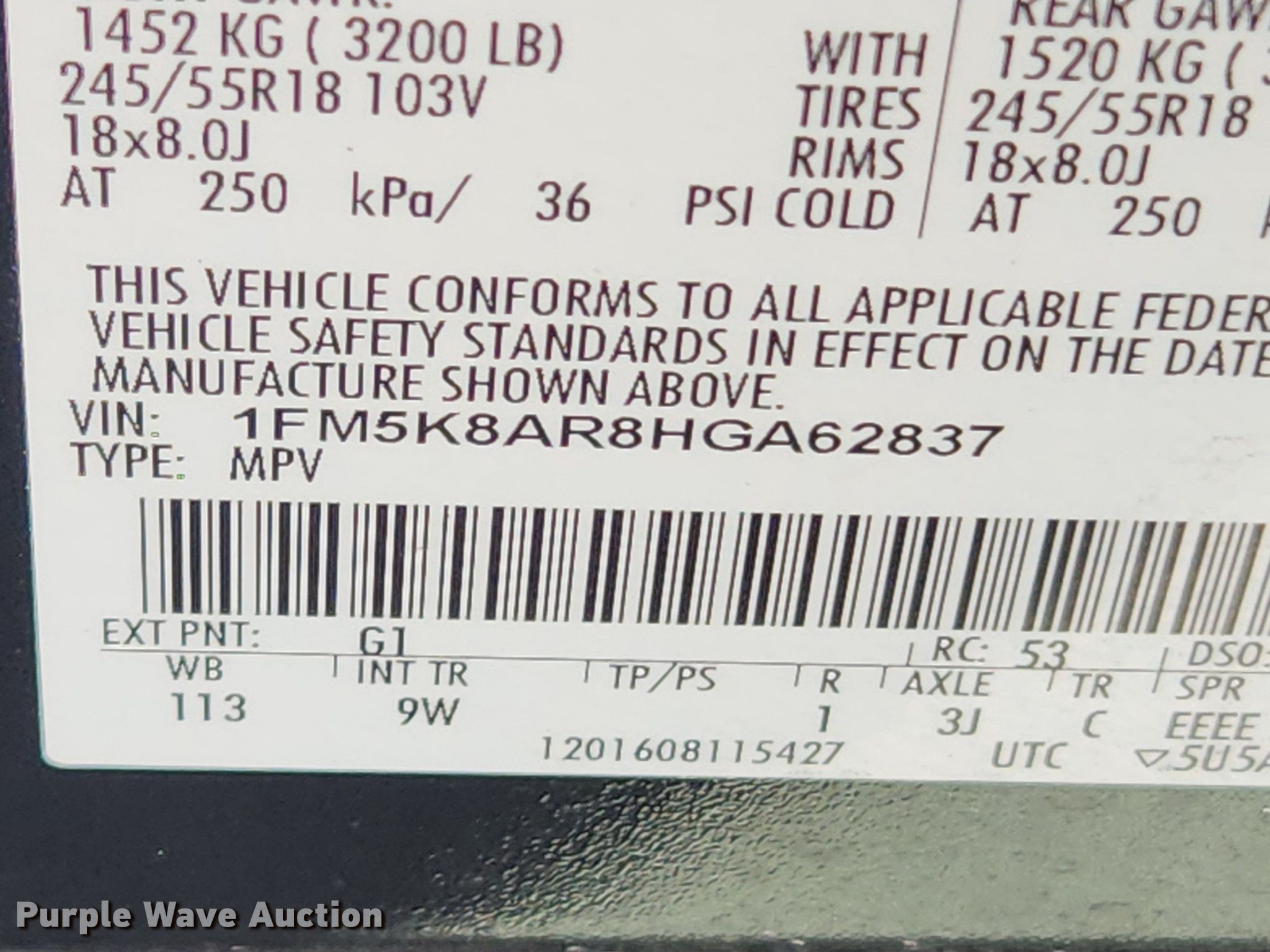 - VIN: 1FM5K8AR8HGA62837
