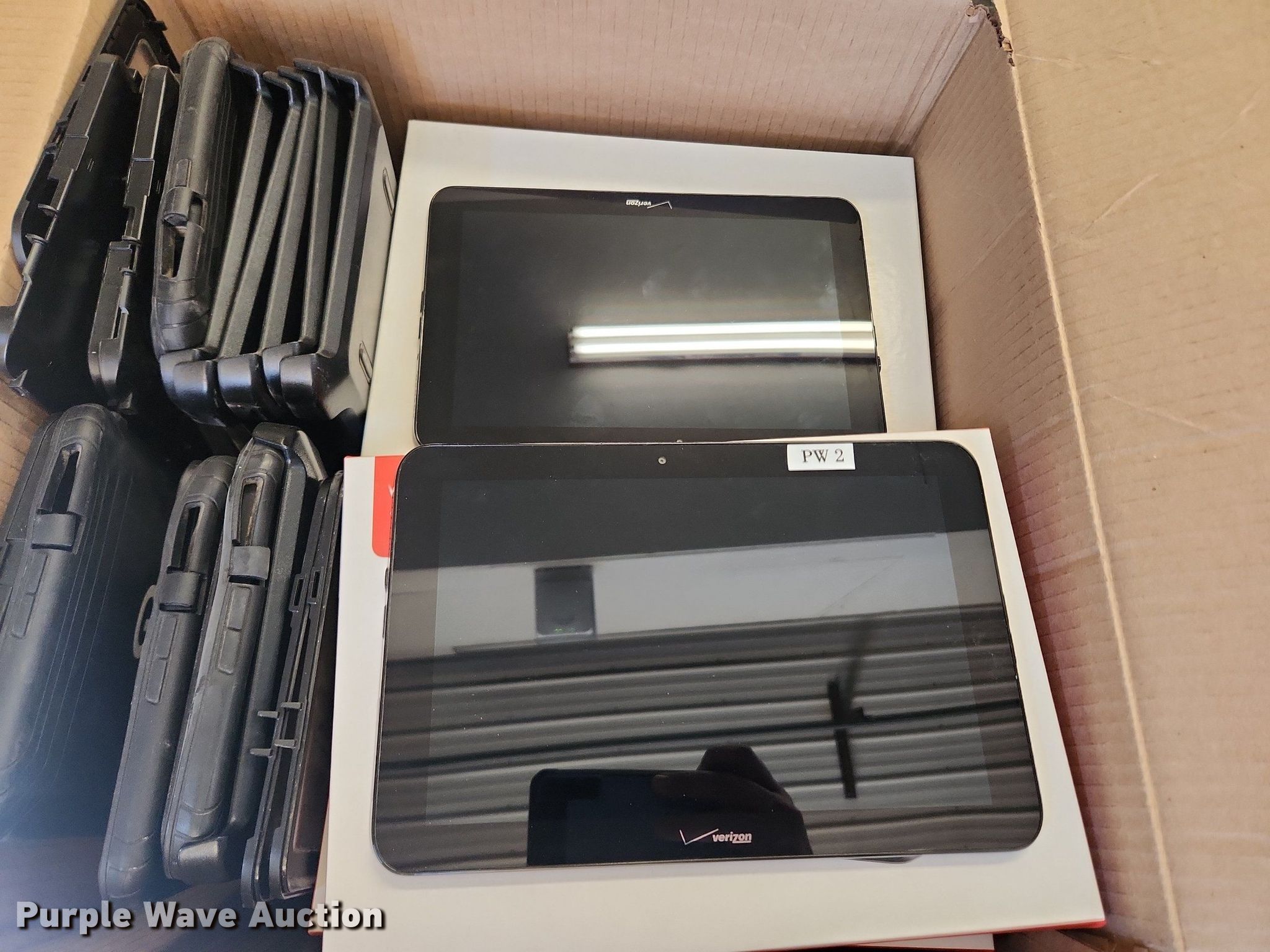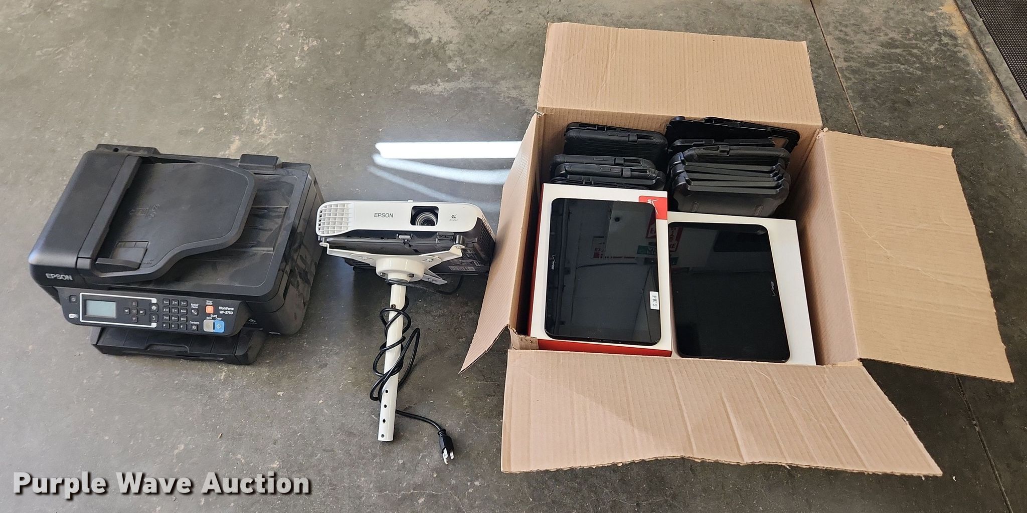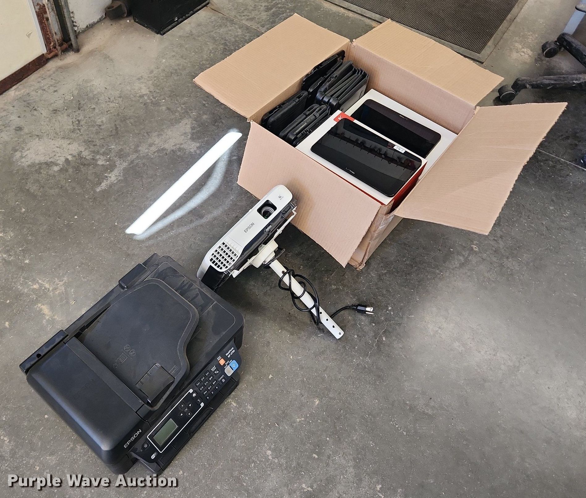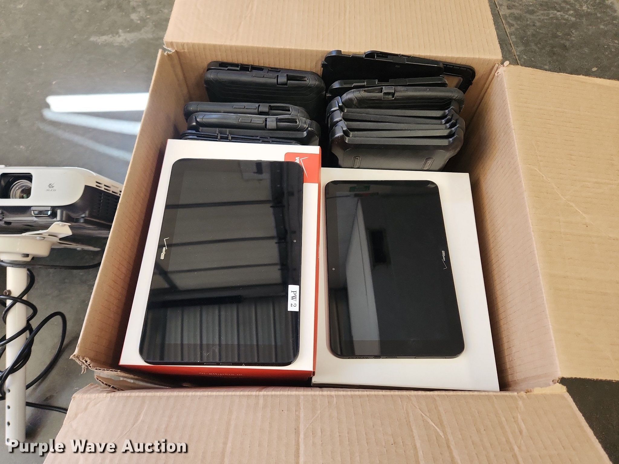 Purple Wave is selling a used Electronics in Missouri. This item is a Electronics with the following: (9) Verizon Ellipsis tablets, Tablet cases, Epson printer, Epson projector, Projector screen, (3) display boards