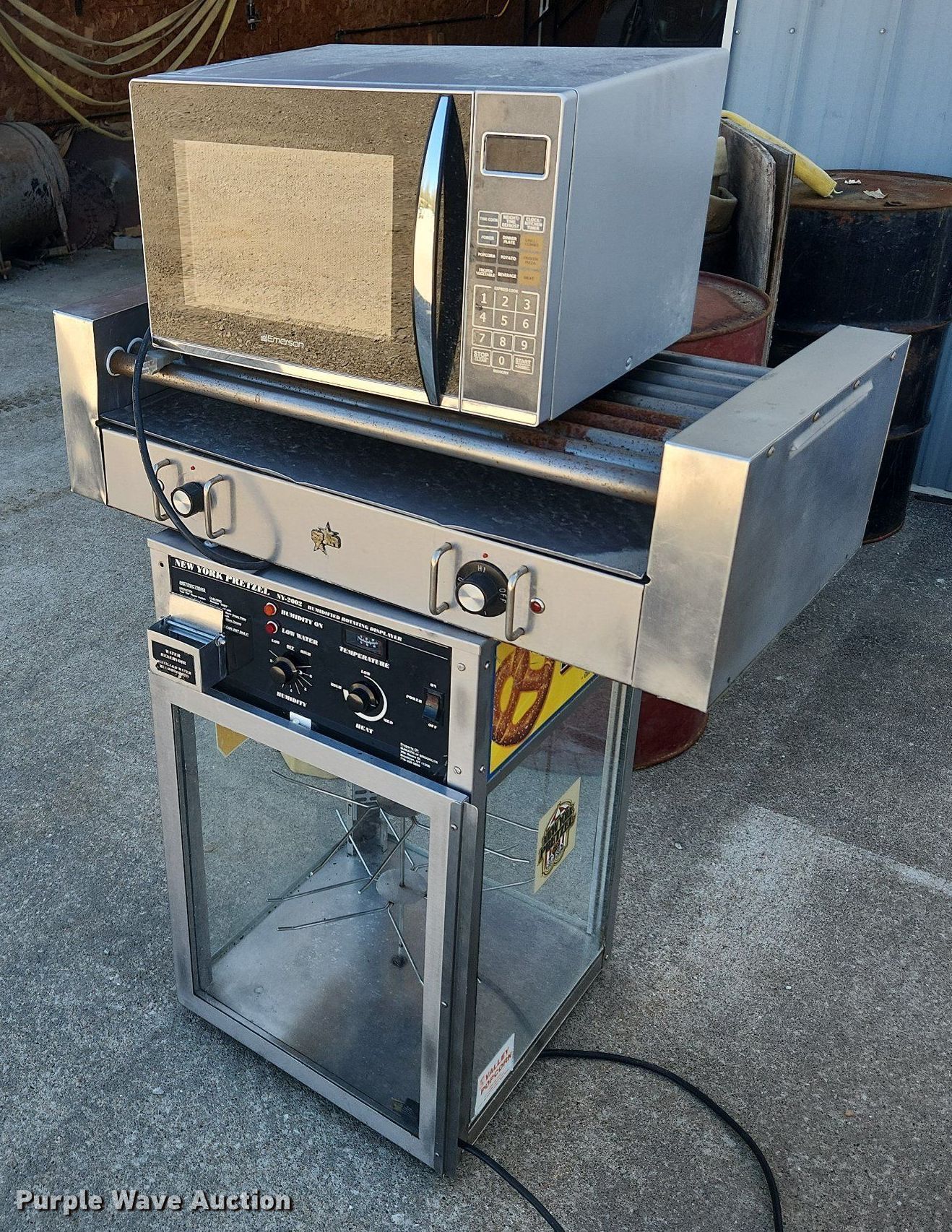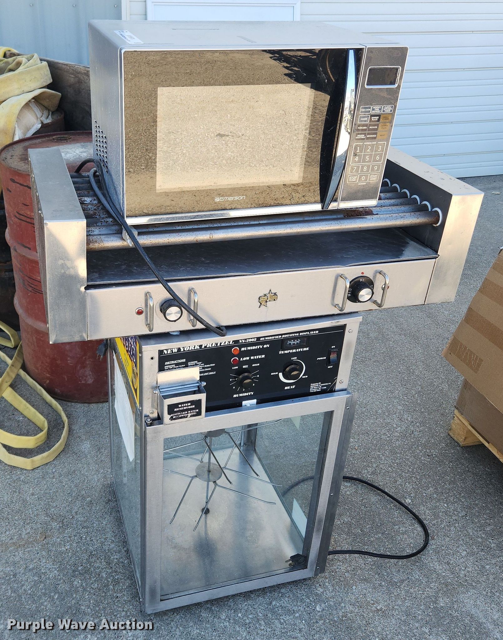Purple Wave is selling a used Restaurant Equip. in Missouri. This item is a Restaurant equipment with the following: Emerson microwave, Humidified rotating display, Star hot dog roller, Unknown operating conditions