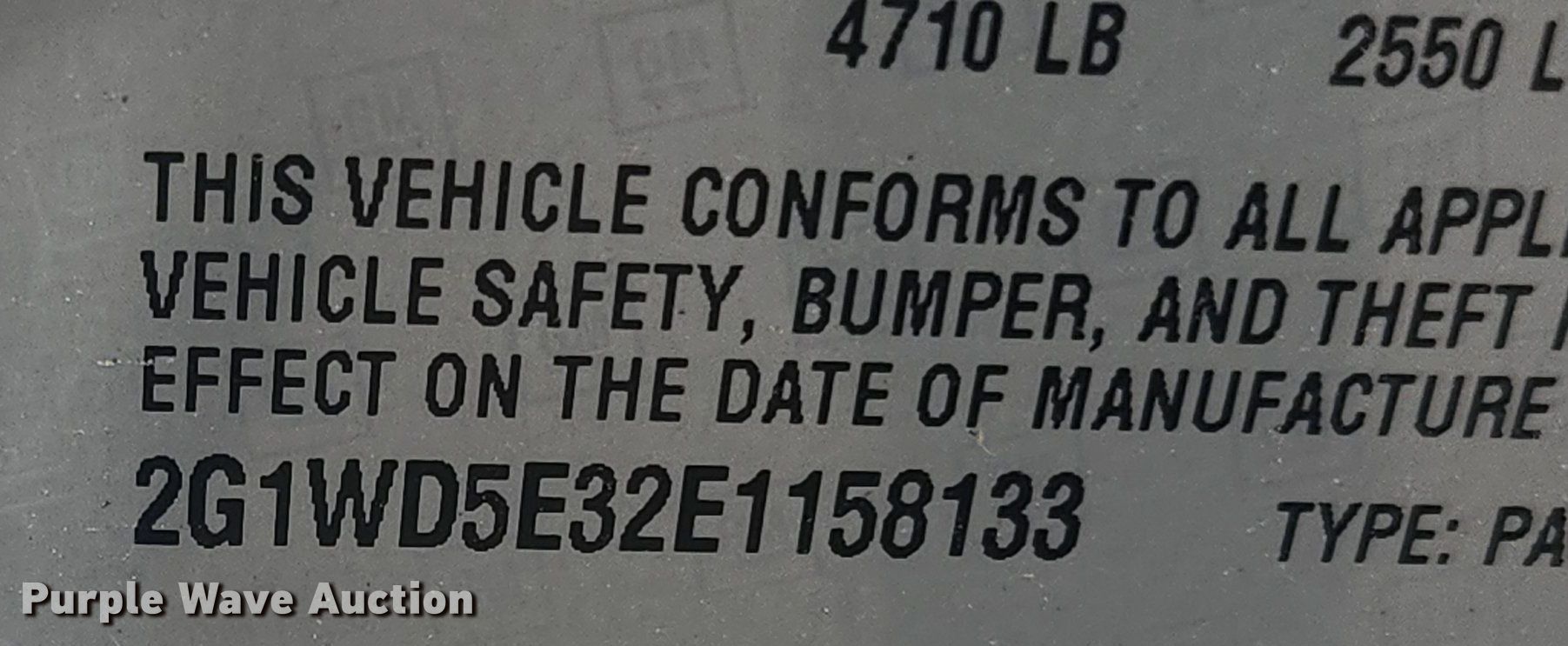 2014 Chevrolet Impala Police Cruiser. Miles: 73,460 on odometer, VIN: 2G1WD5E32E1158133. Engine Displacement: 3.6L V6 DOHC, Cylinders: 6, Fuel type: Gas. Transmission Automatic. Interior AC, Heat, Seat: Power driver, Power passenger, Power windows, Power locks, Cruise control. Tires Size: P235/55R17. Notes Dash warning indicator: TPMS, Dead battery. Missouri title. Seller is a government entity who will be assigning and distributing the title. Please contact the seller for distribution questions. Mileage has not been verified. Odometer discrepancy will be marked on the title. City of Washington. 301 Jefferson Street. Washington, MO 63090