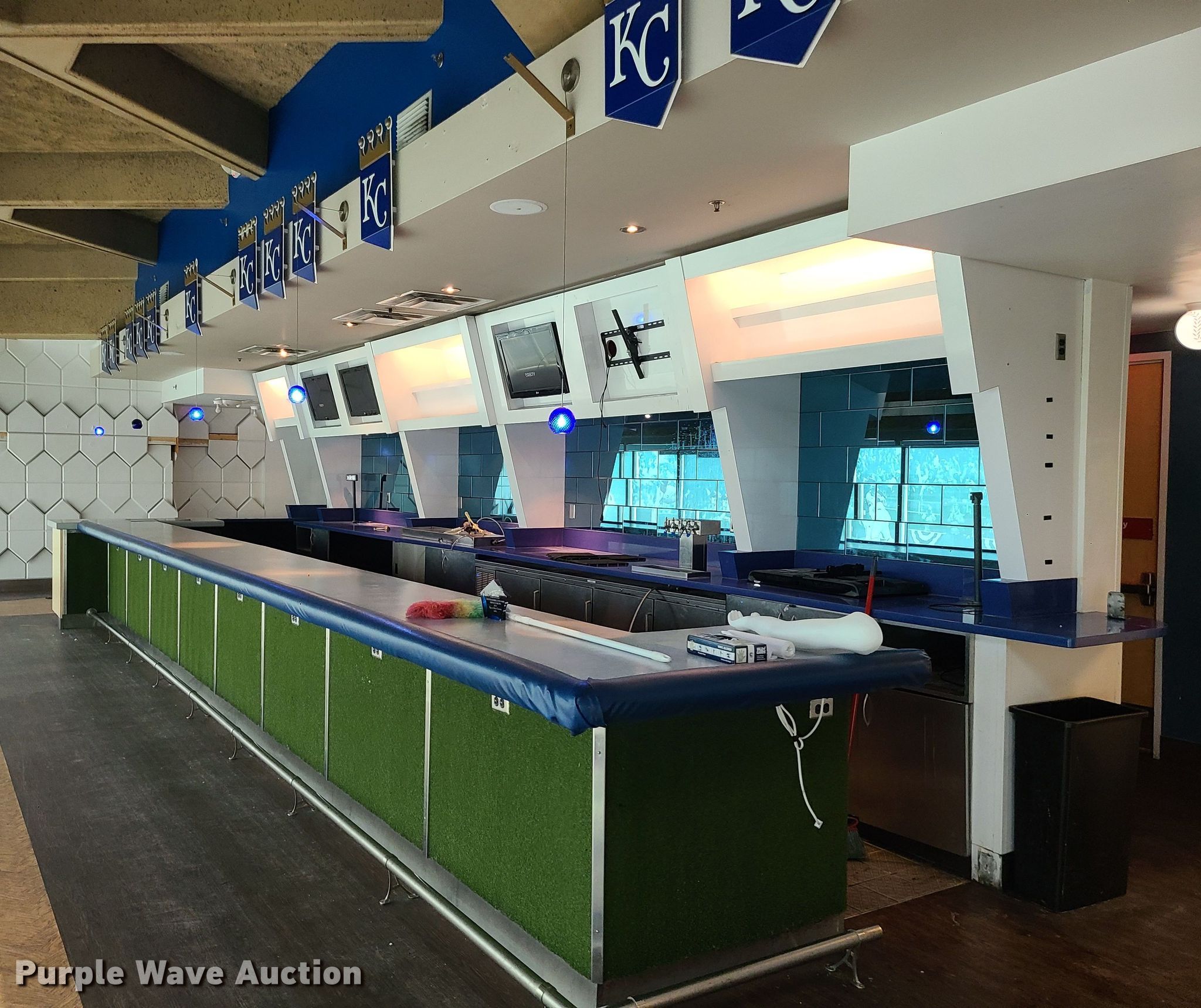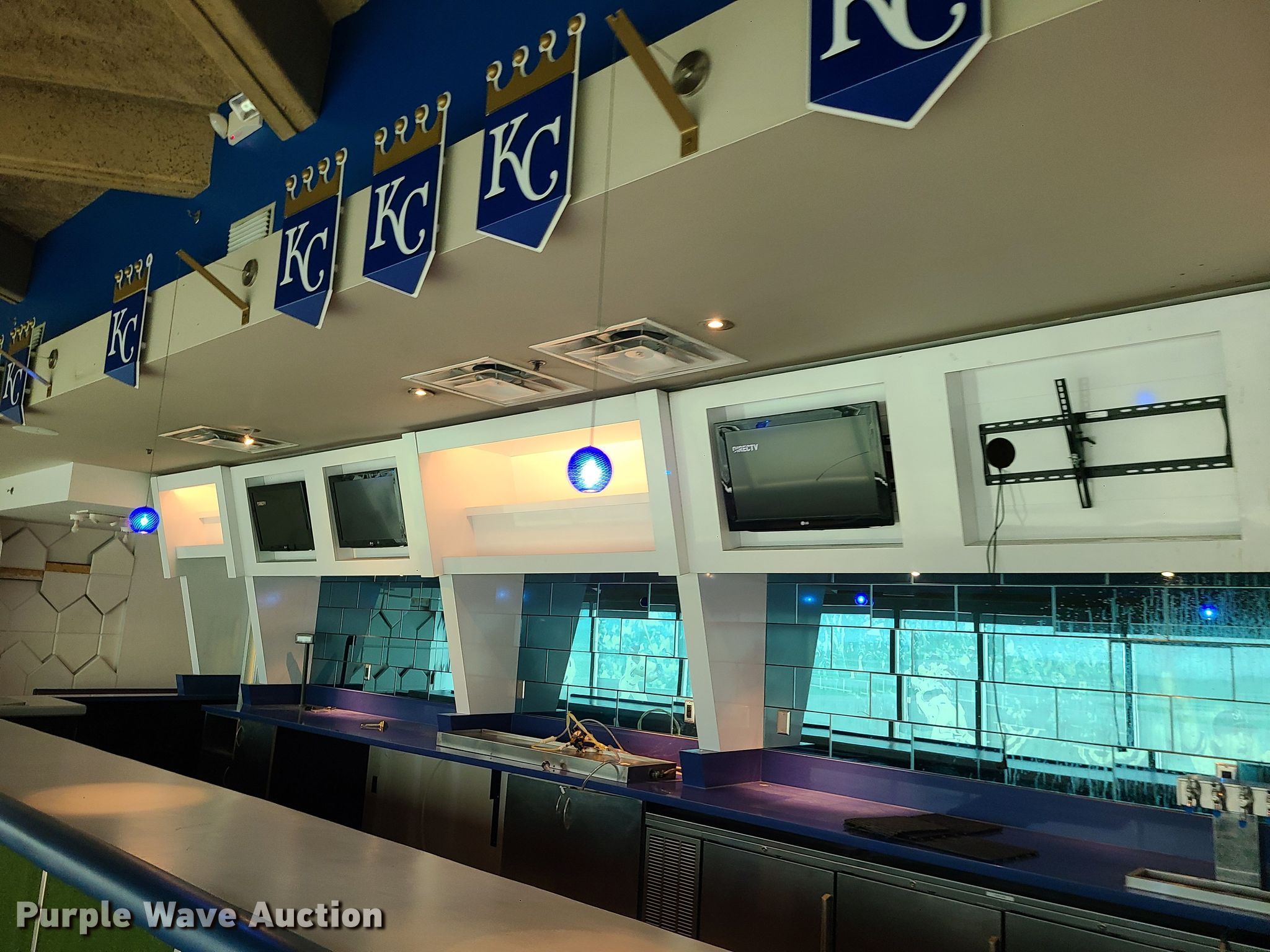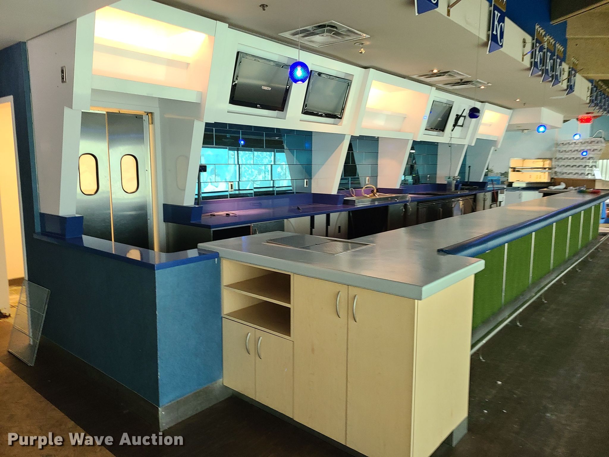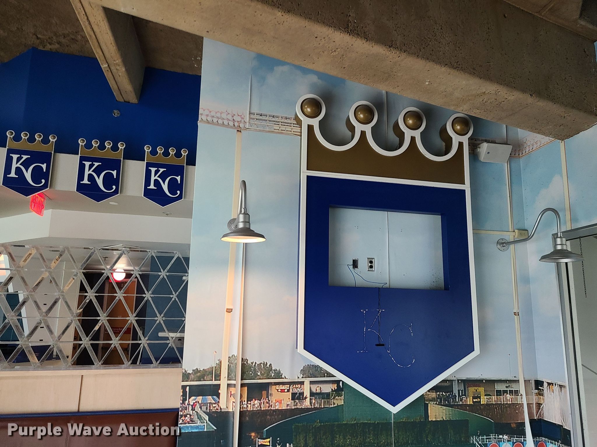 Purple Wave is selling a used Restaurant Equip. in Missouri. This item is a Restaurant equipment with the following: Kansas City Royals signs, Monitors, Shelving and more