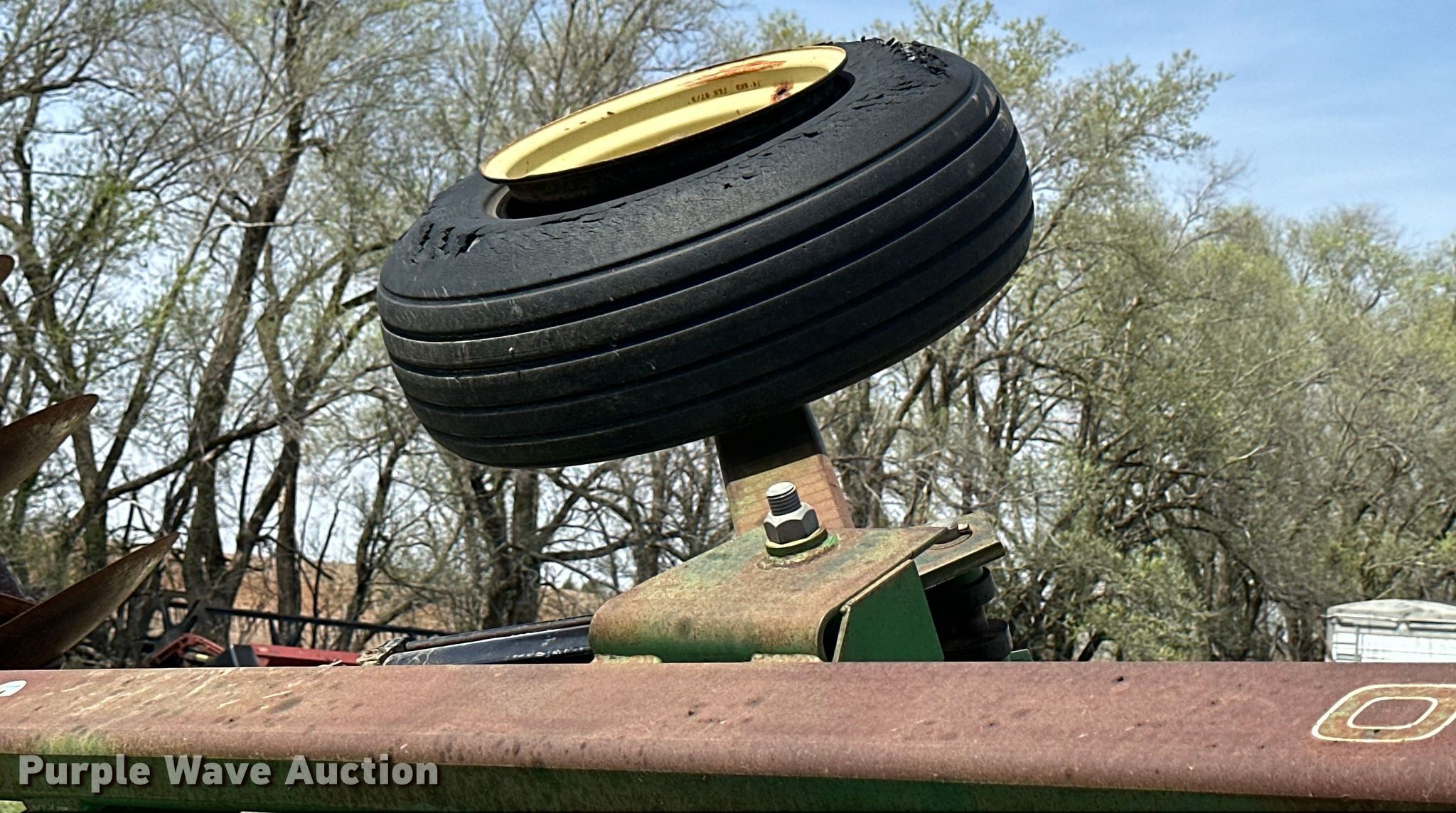 John Deere 630 tandem disk. Overall width: 21', Serial: N00630X010293. Features Front blades Diameter: 22", Spacing: 9", Rear blades Diameter: 20", Spacing: 9", Operation Hydraulic lift, Hydraulic fold, Leveler: Hydraulic. Tires Tire size: 9.5L-14. Notes Hydraulic lift cylinder leak, Tire damage. Miltonvale, KS 67466