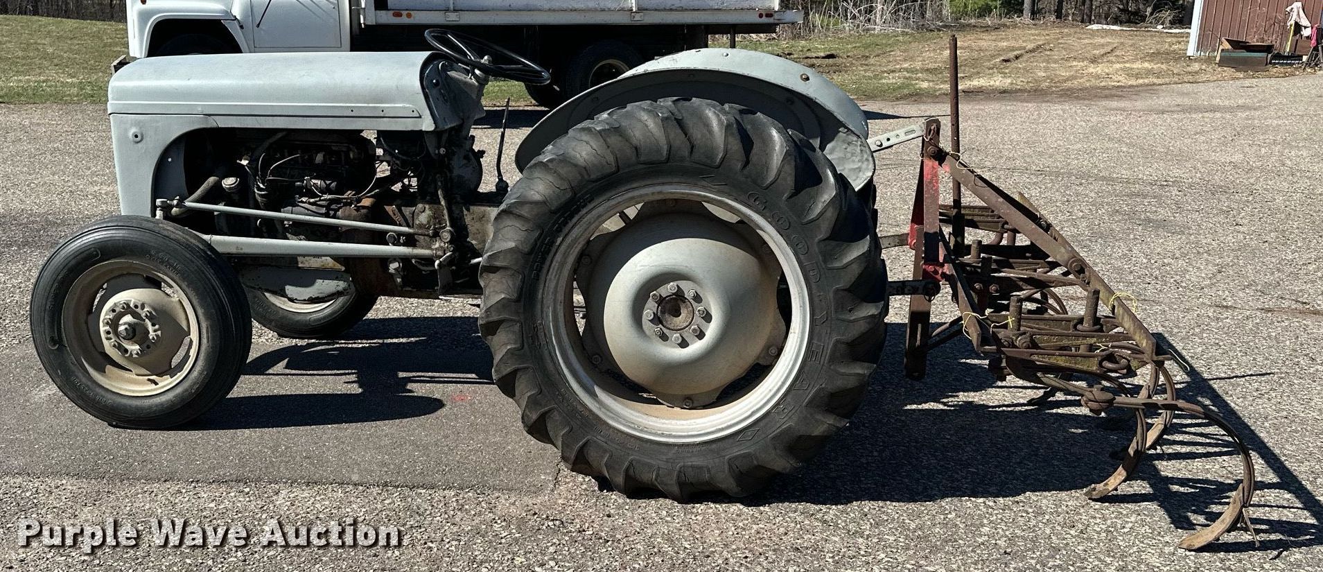 1951 Ferguson TO-20 tractor. Serial: 45230. Engine Cylinders: 4, Fuel type: Gas. Transmission Manual 4F - 1R. Features PTO: 540, Three point, Rake Width: 6', Rotary mower Width: 6'. Tires Front: 5.5-16, Rear: 12.4-38. 10555 140 Th St. E. Hastings, MN 55033