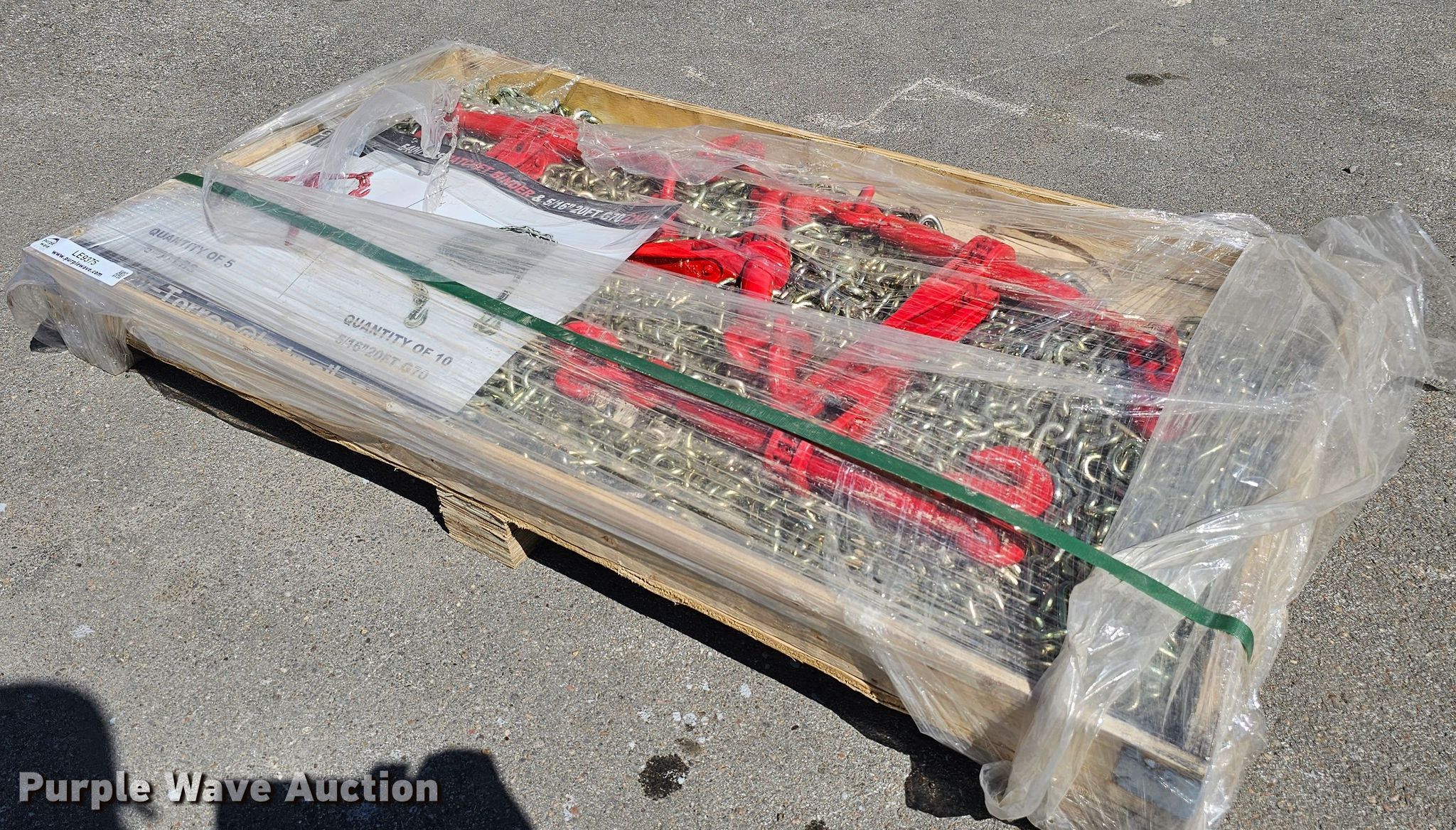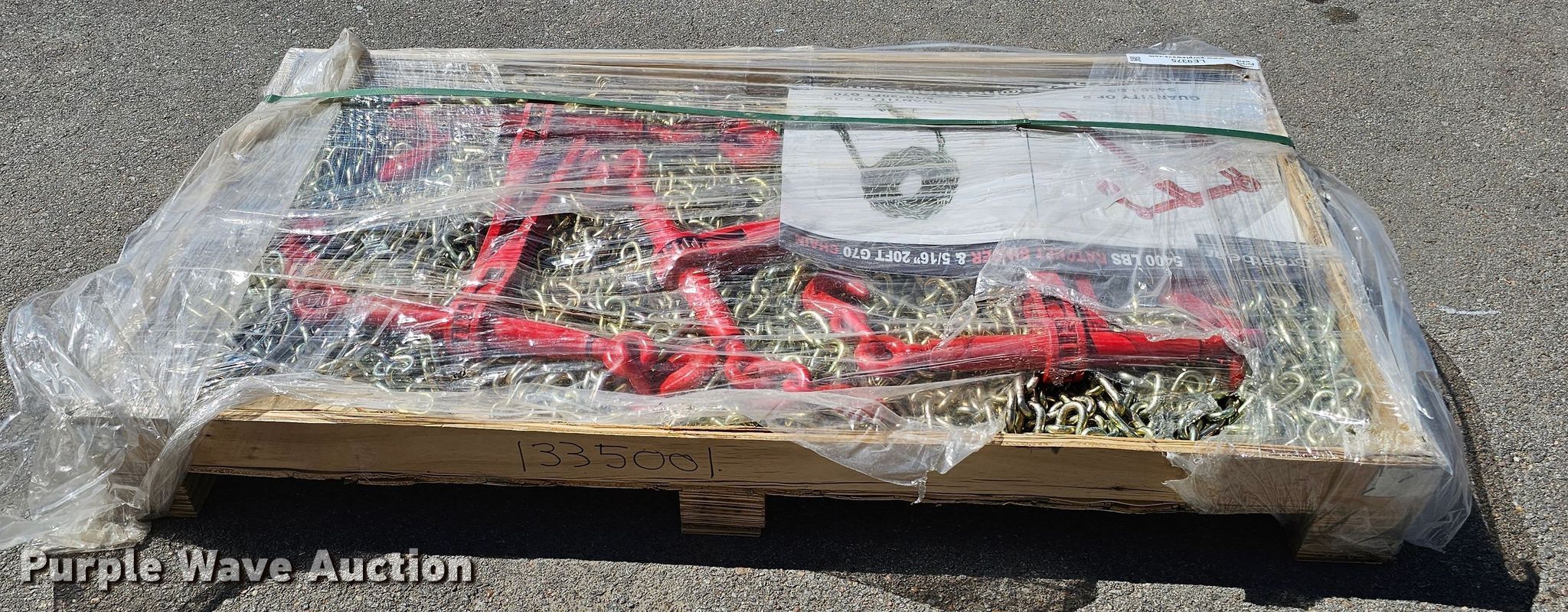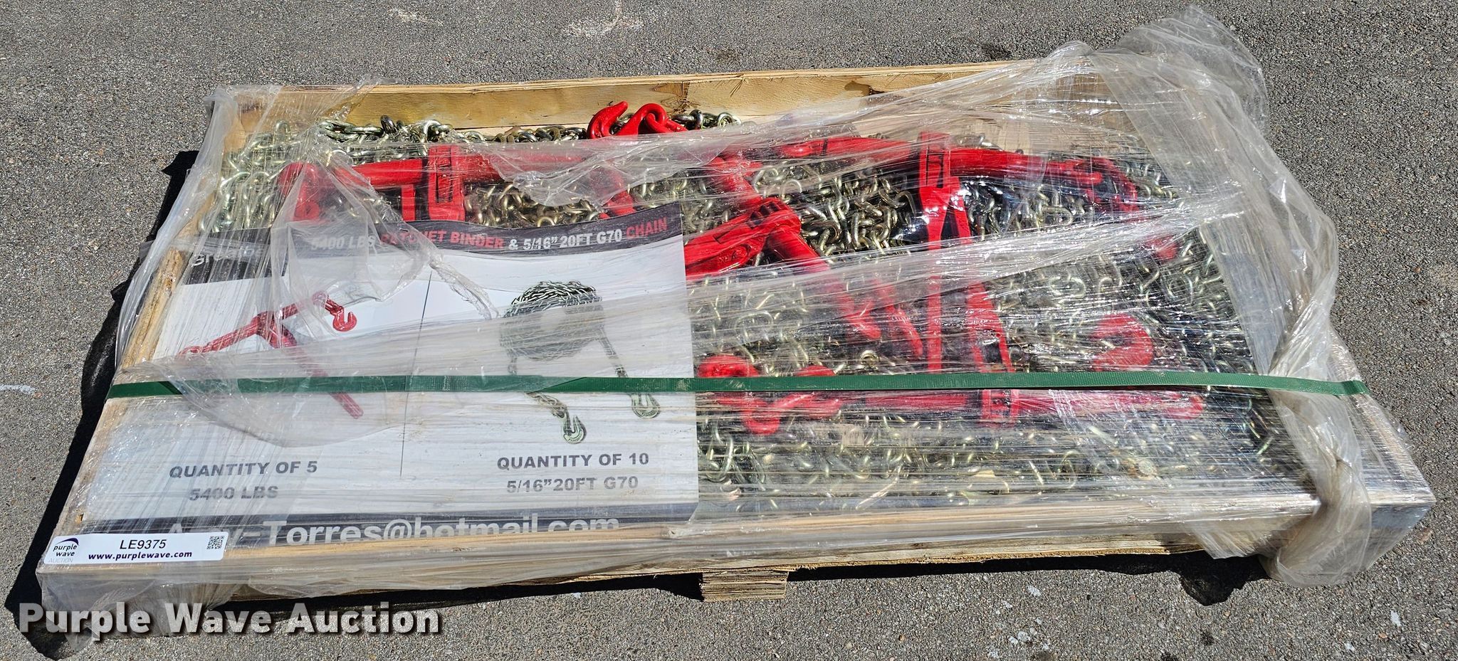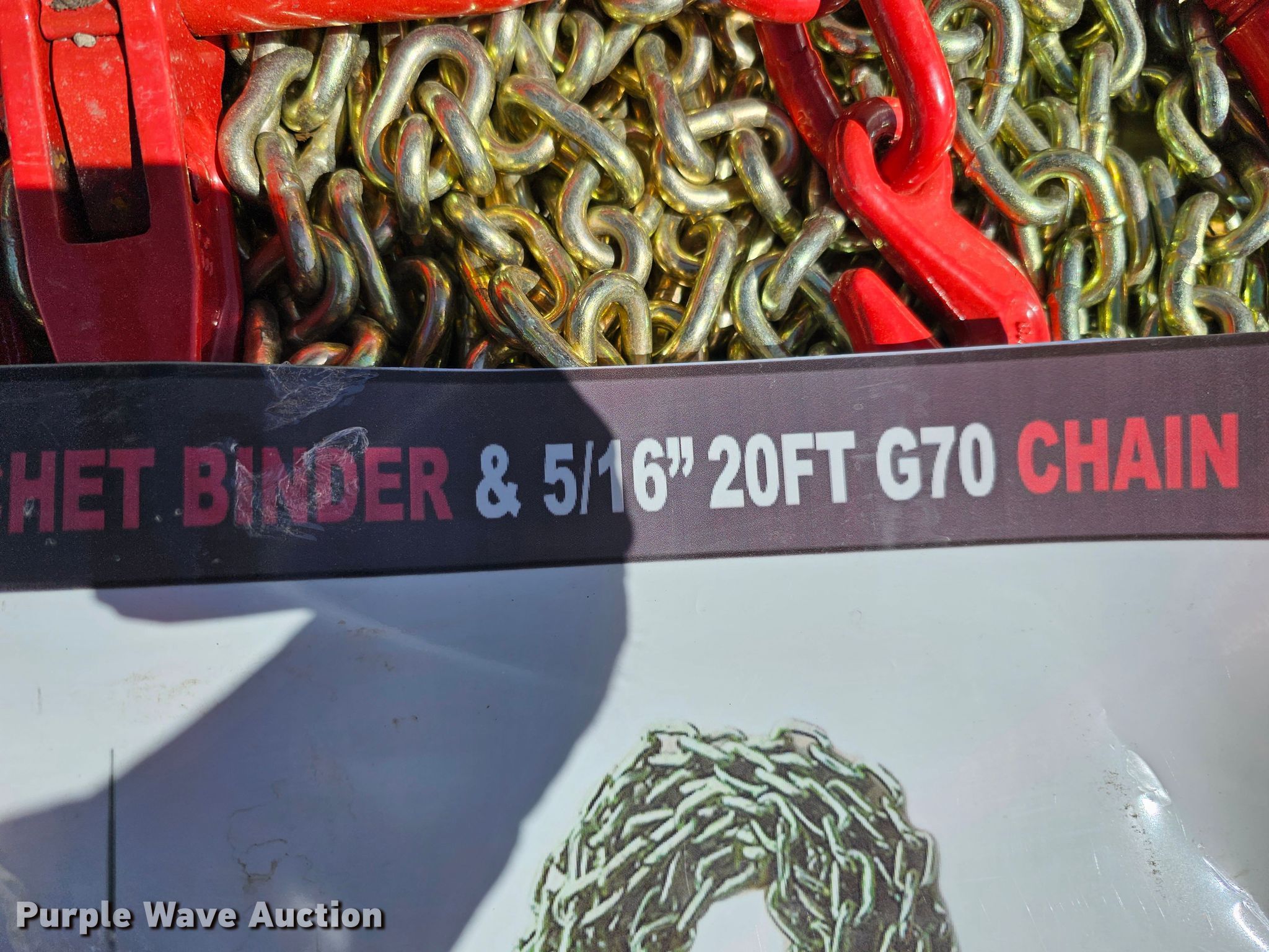 (5) GreatBear ratchet binders. Capacity: 5,400 lbs, (10) chains 20' L x 5/16", Unused. Jordan Machinery /S & N Auto Sales. 25050 US Hwy 275. Waterloo, NE 68069