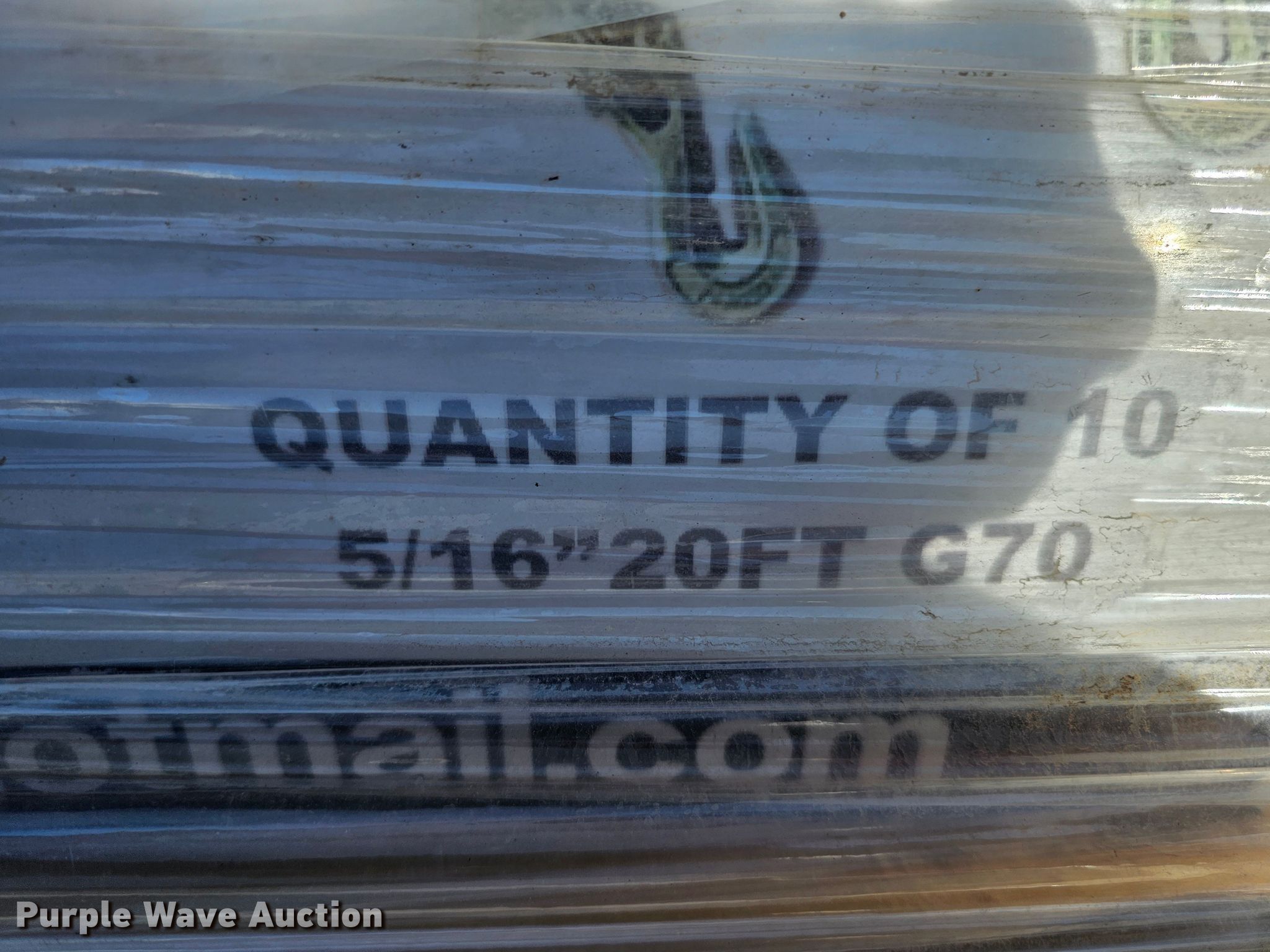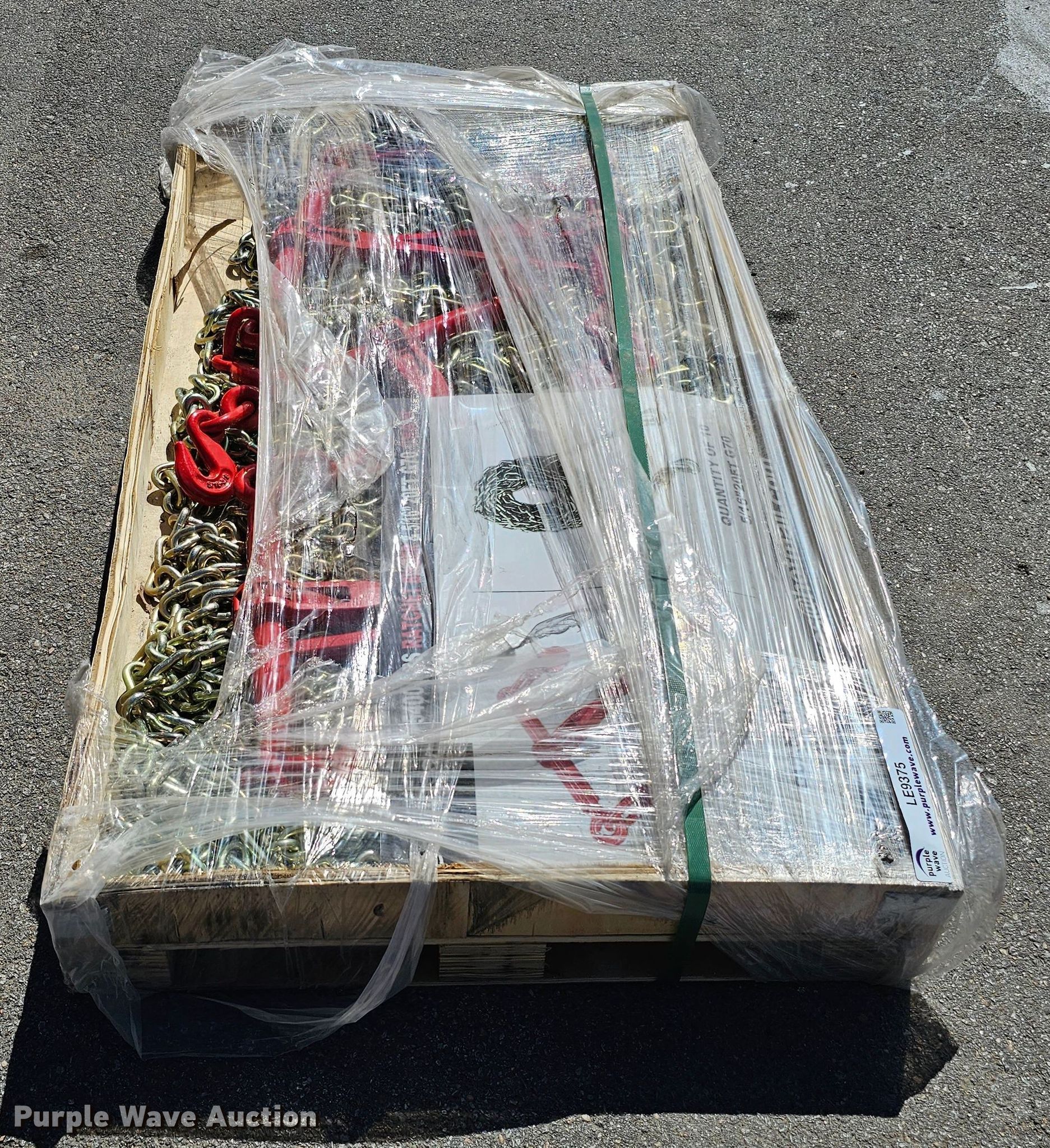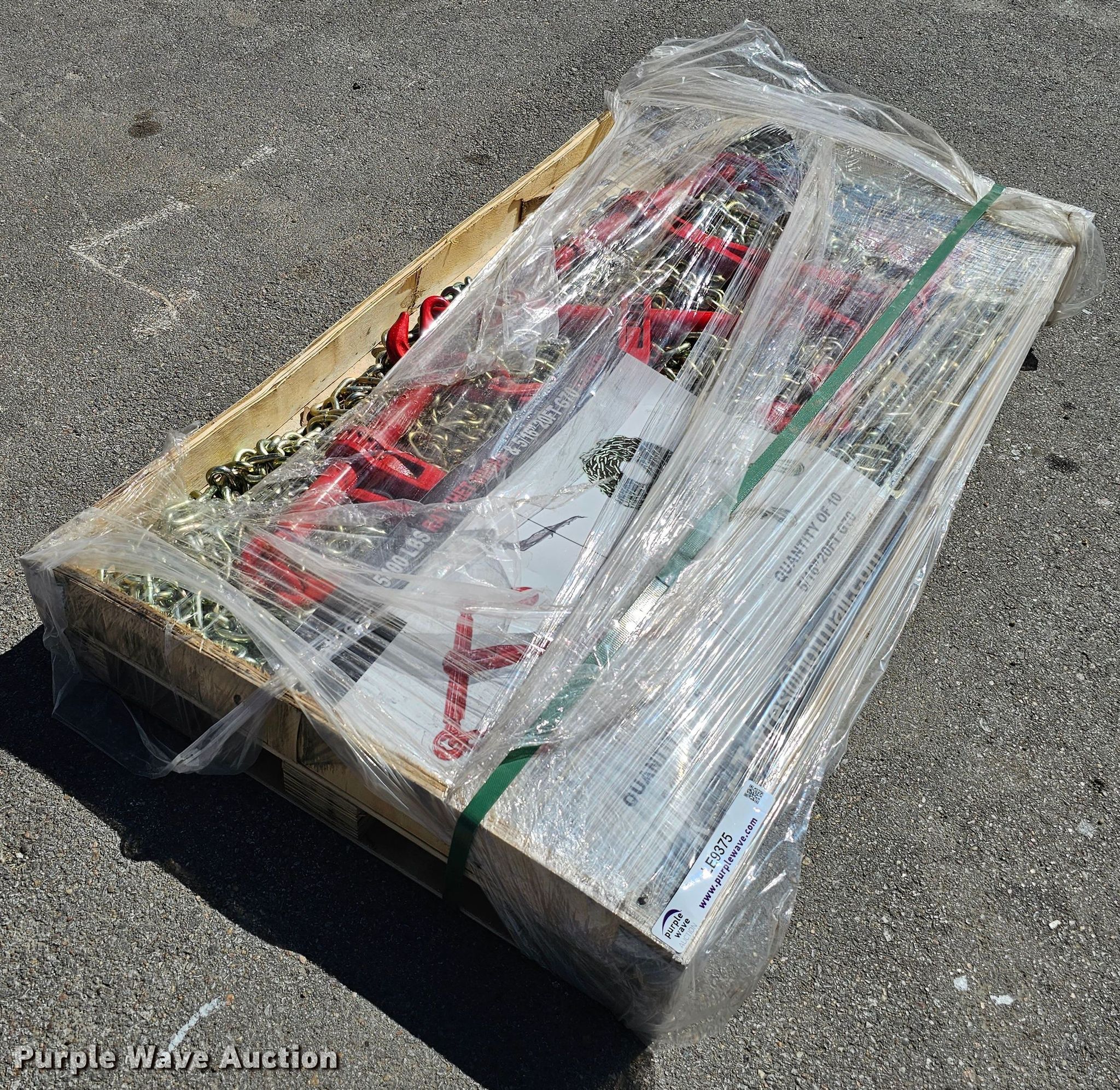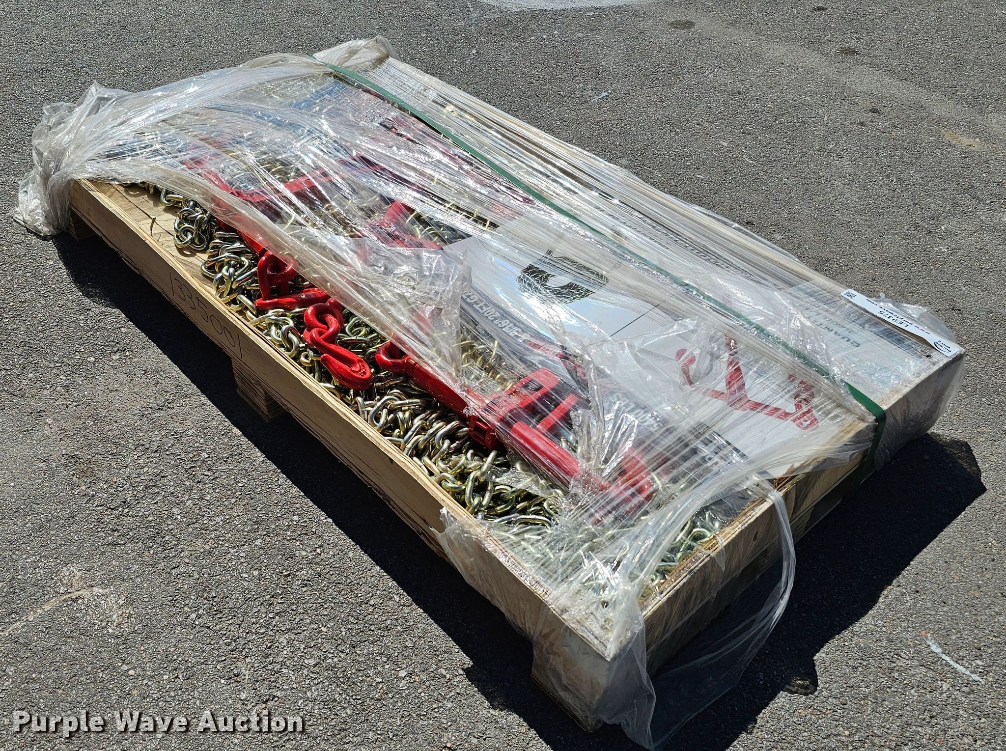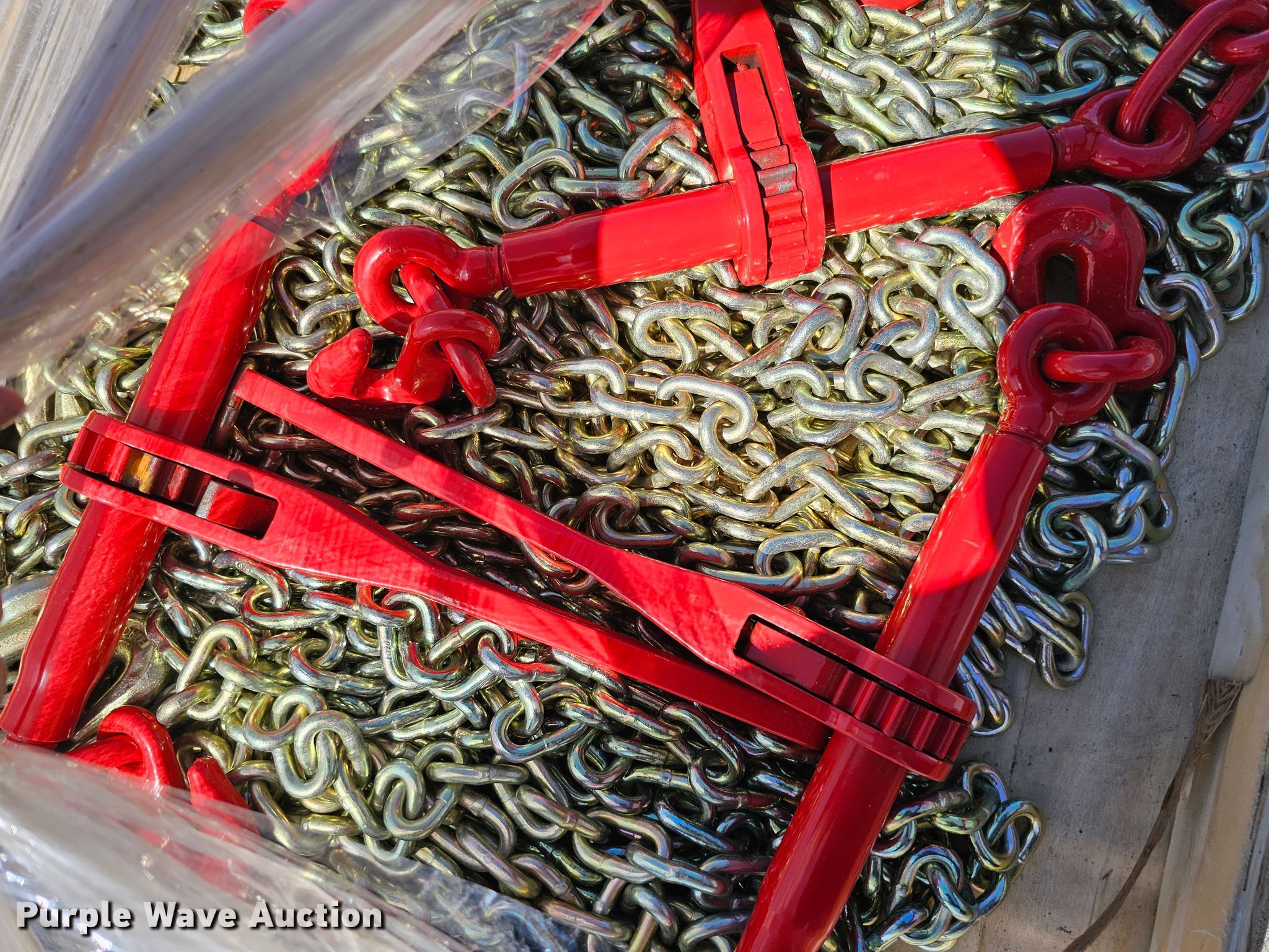 (5) GreatBear ratchet binders. Capacity: 5,400 lbs, (10) chains 20' L x 5/16", Unused. Jordan Machinery /S & N Auto Sales. 25050 US Hwy 275. Waterloo, NE 68069