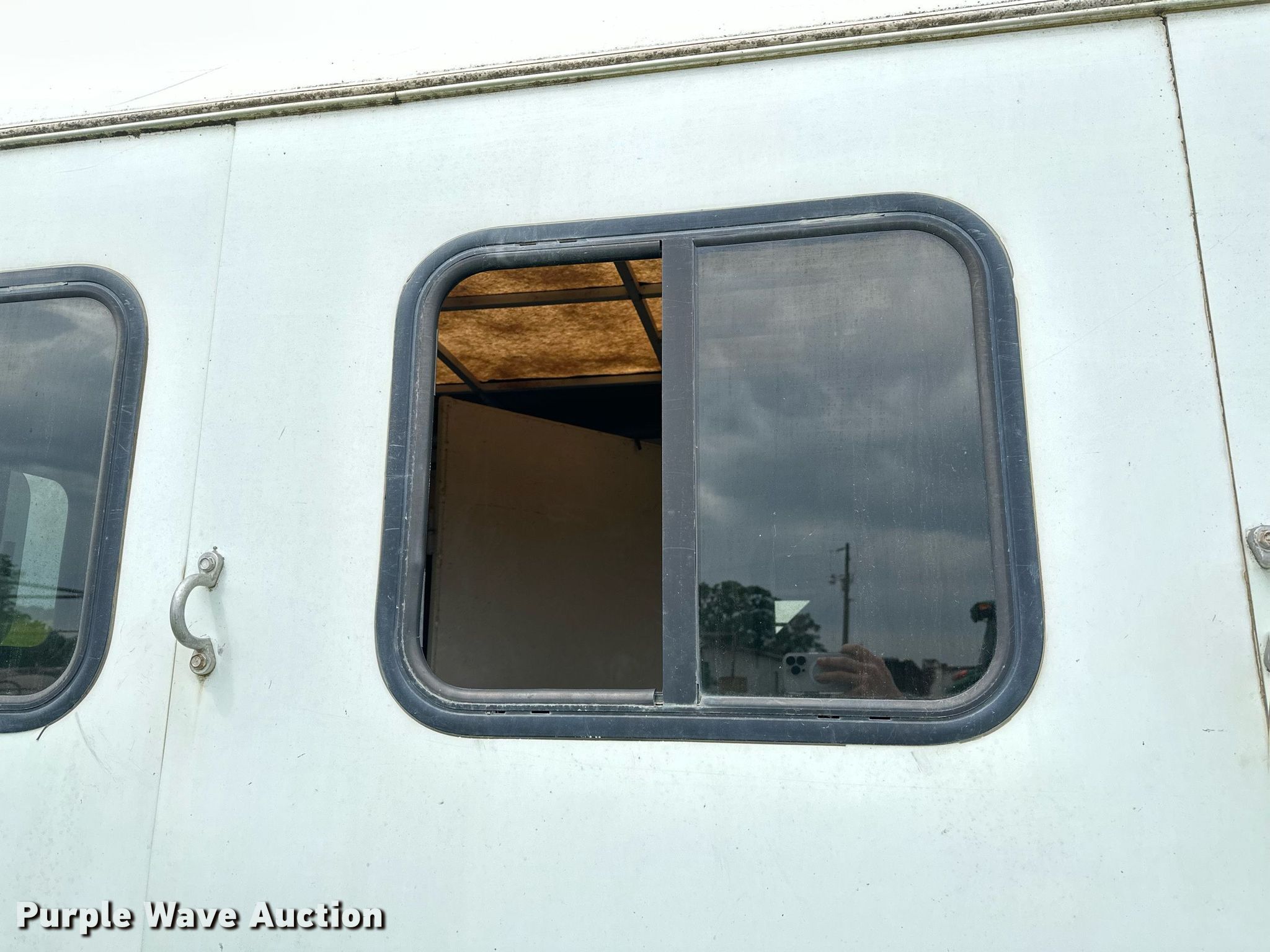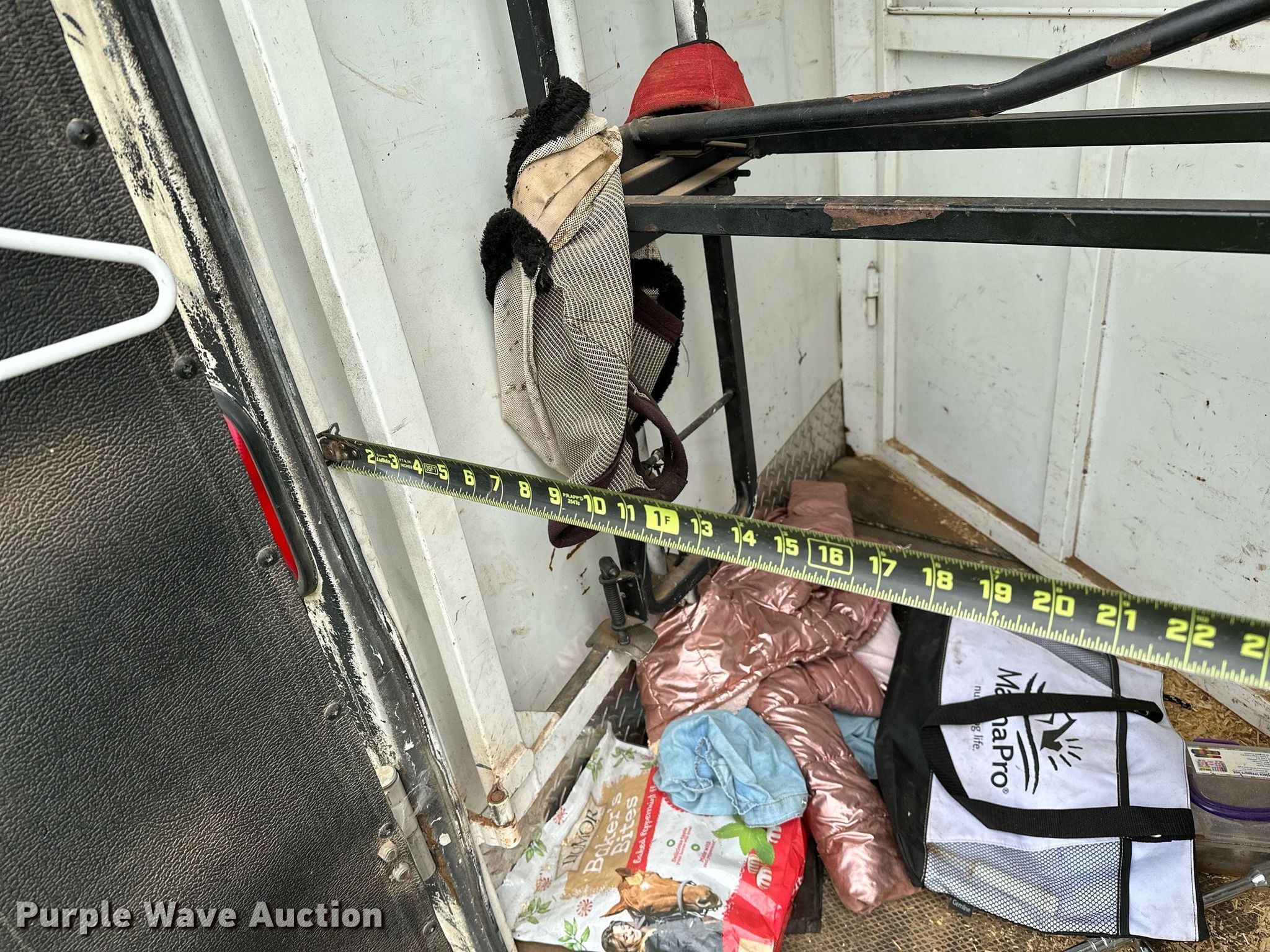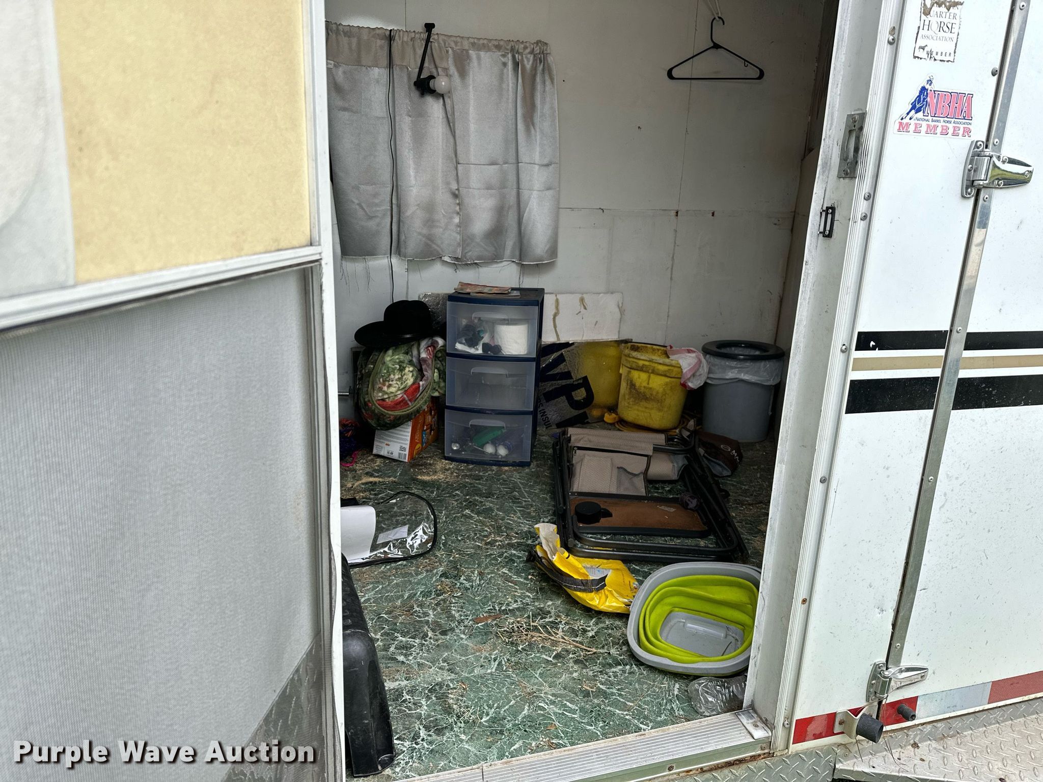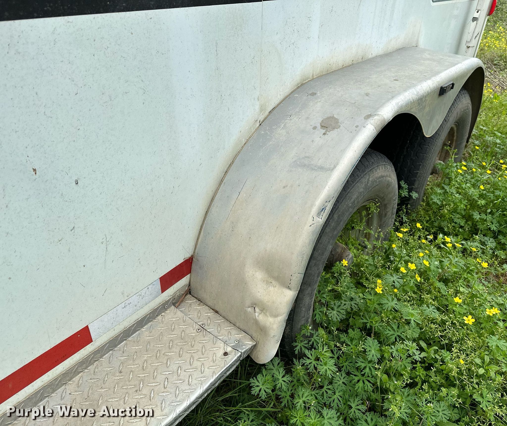 2003 Bison AlumaSport livestock trailer. VIN: 43B68182231005498. Dimensions Overall: 25' 6" L x 102" W, Body: 18' L x 80" W, Side height: 7' 6". Features Horse capacity: 3, Center gates: 2, Rubber floor mat. Chassis Hitch: Gooseneck, Landing gear: Single, Suspension: Spring, Brakes: Electric, Axles: Tandem. Tires Steel wheels, Size: 225/75R15. Notes Contents included. Transfer of ownership documentation will be a bill of sale. Firstar Bank. 458129 East 1080 Road. Sallisaw, OK 74955