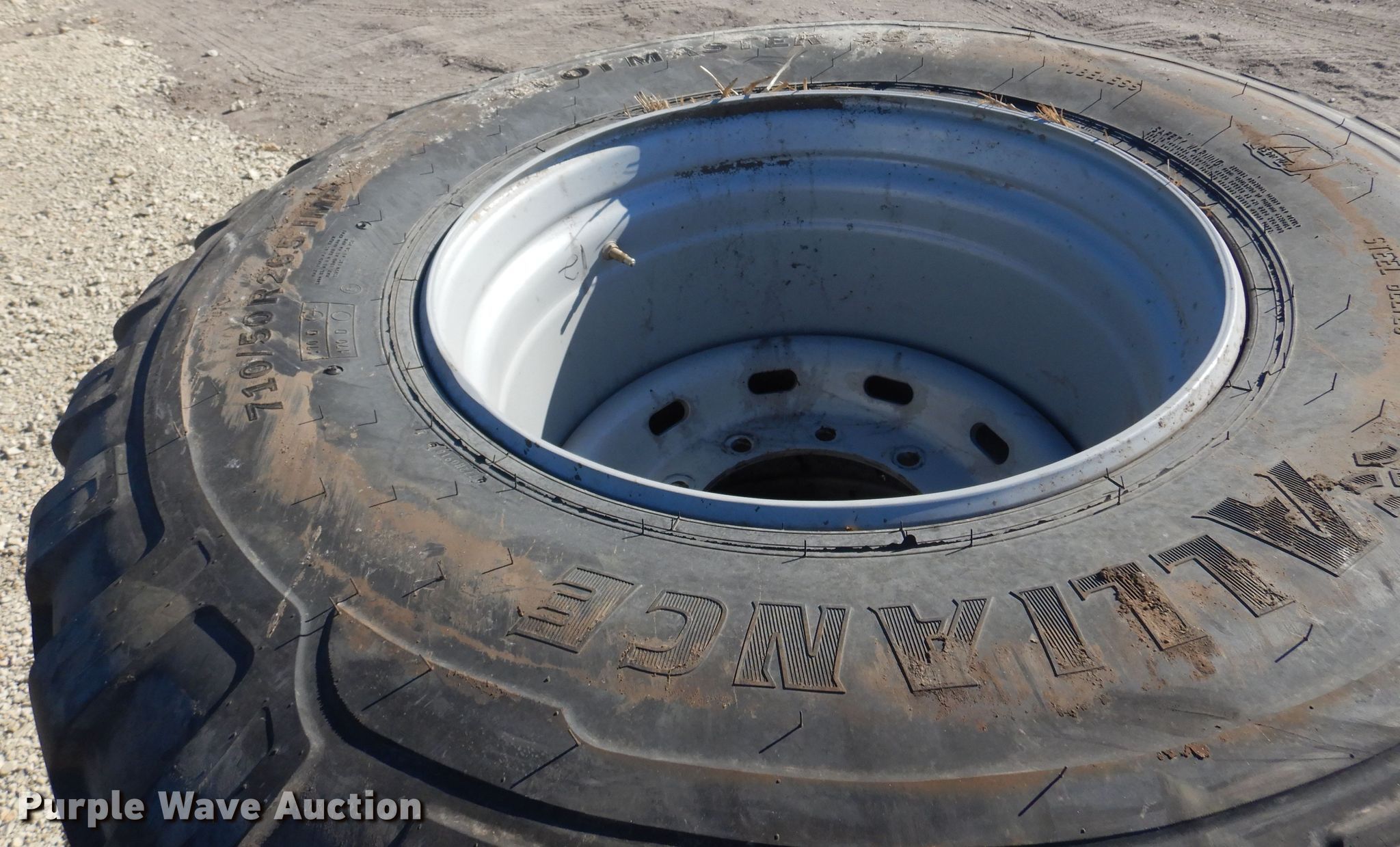 Purple Wave is selling a used Industrial Tires or Tracks in Kansas. This item is a (2) Alliance 710/50R26.5 tires and wheels with the following: 11" pilot hole, 10 bolt wheels