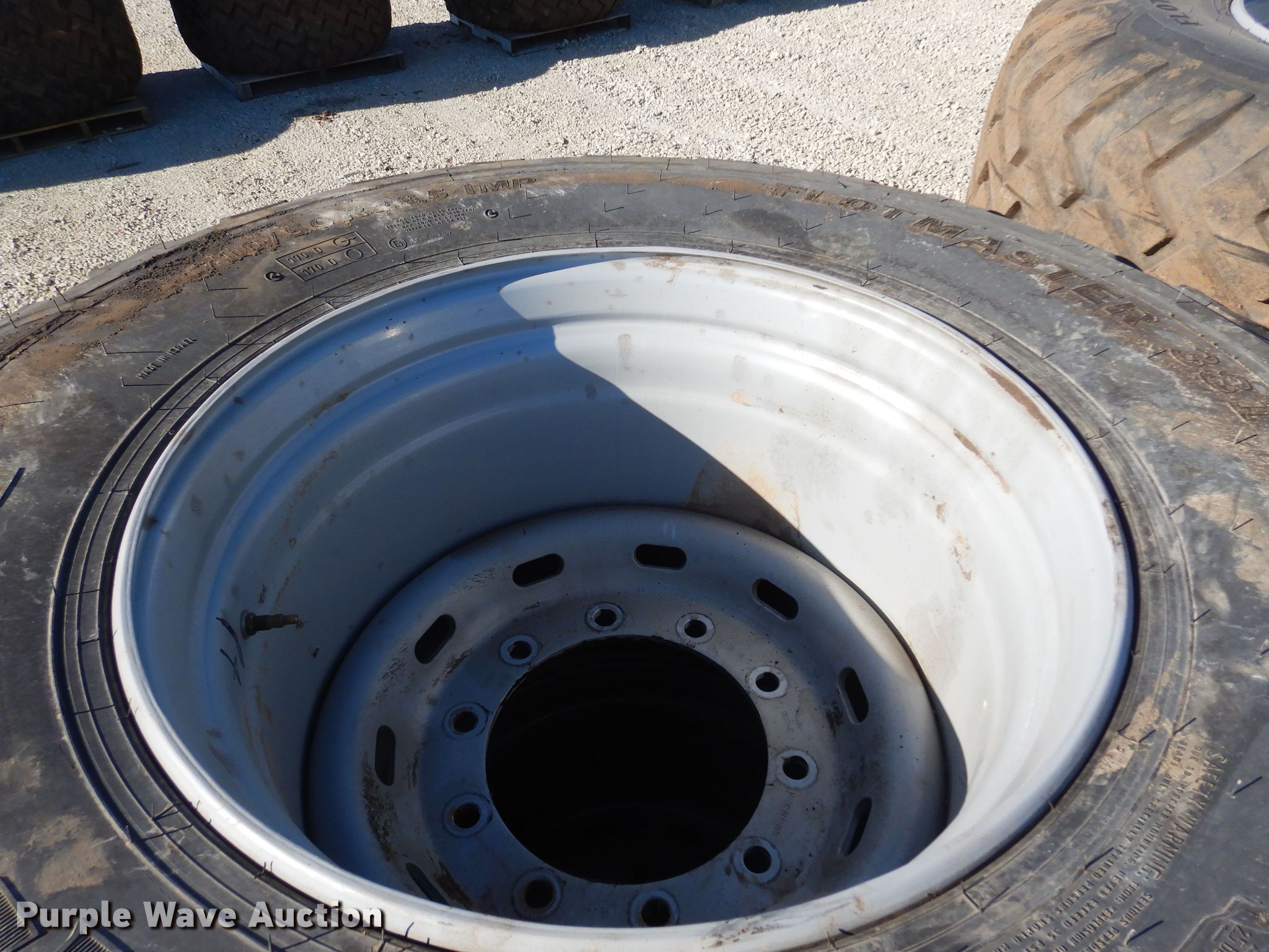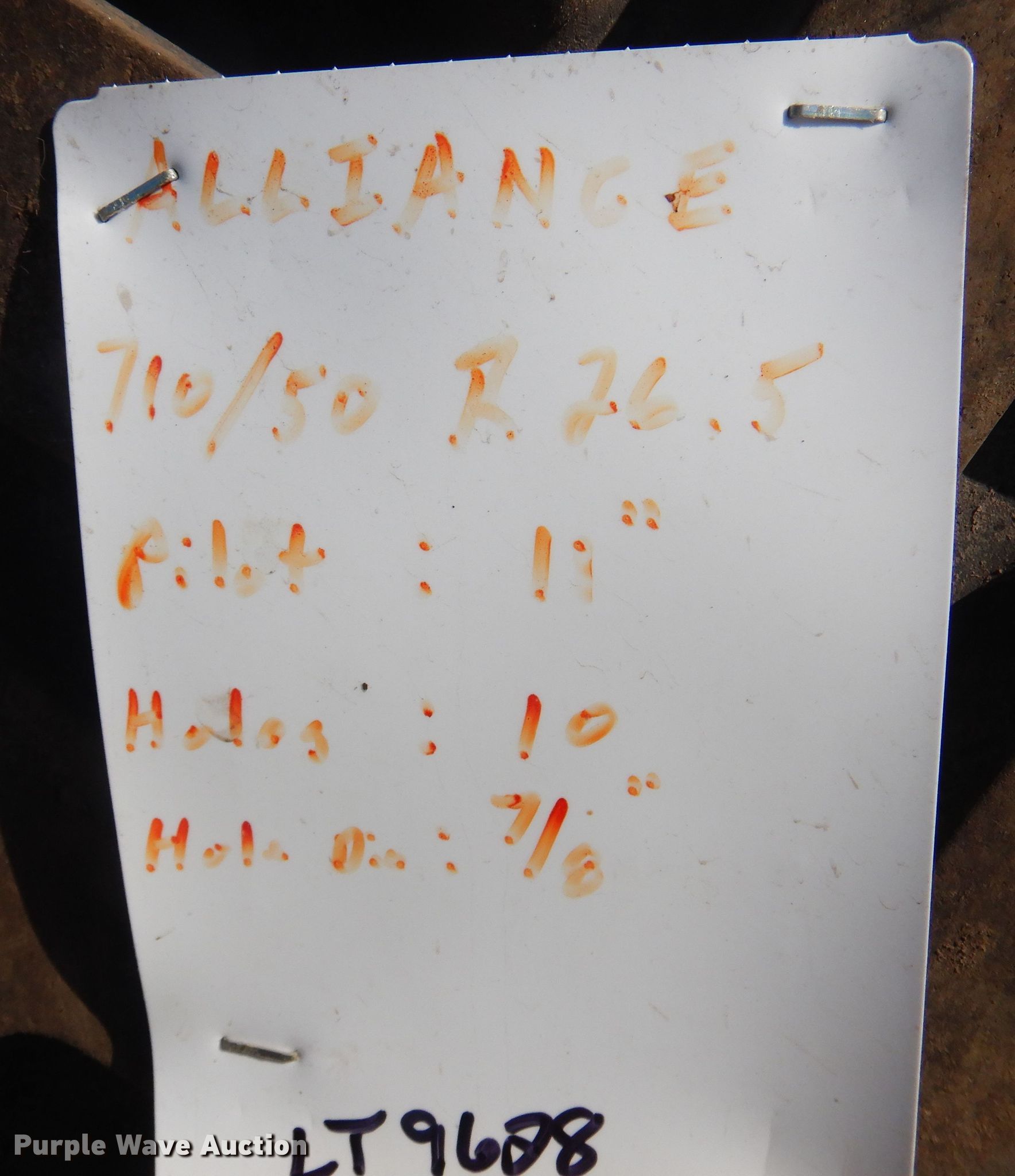 Purple Wave is selling a used Industrial Tires or Tracks in Kansas. This item is a (2) Alliance 710/50R26.5 tires and wheels with the following: 11" pilot hole, 10 bolt wheels