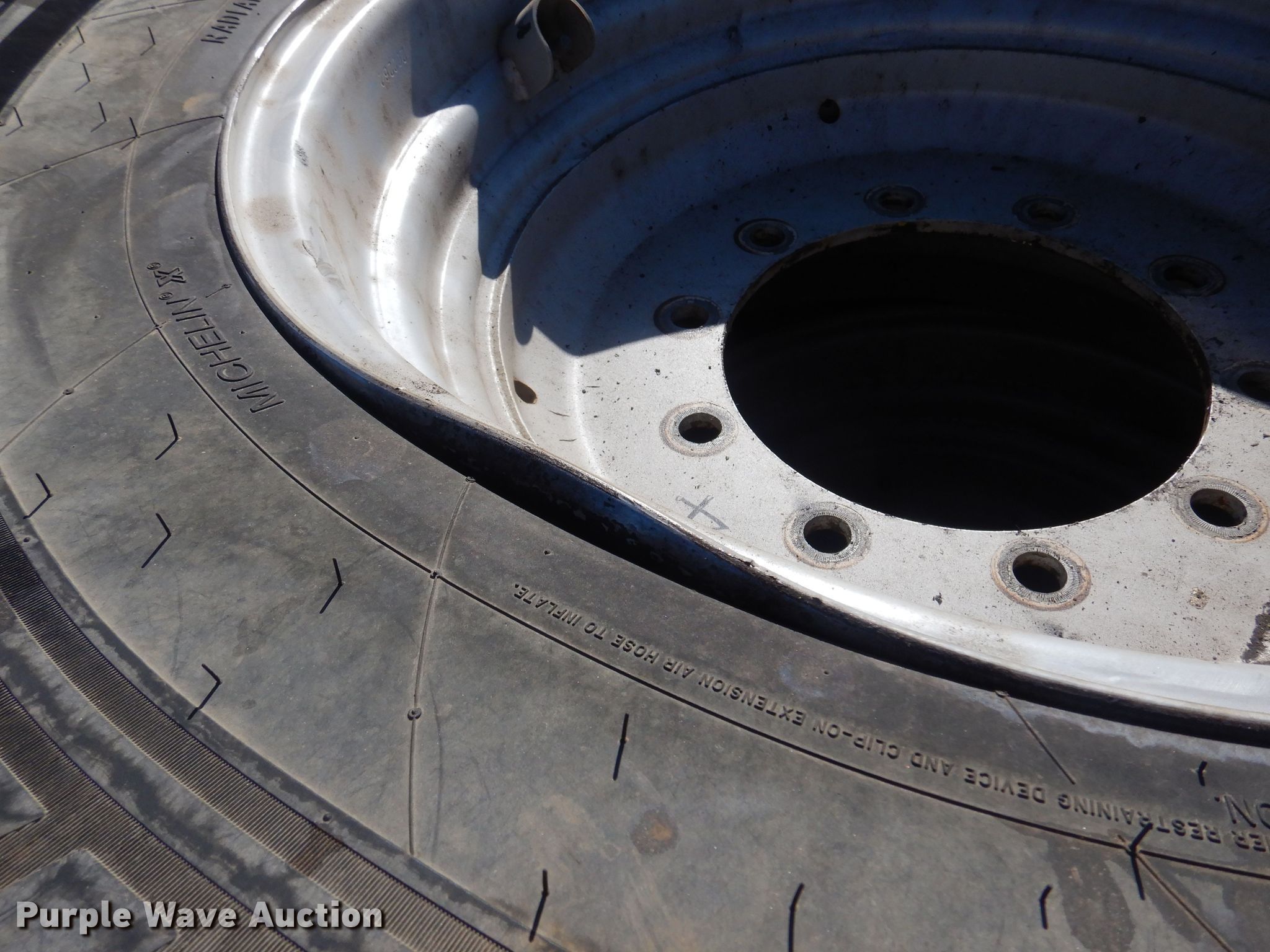 Purple Wave is selling a used Industrial Tires or Tracks in Kansas. This item is a (2) Michelin 510/80R26 tires and wheels with the following: 11" pilot hole, 10 bolt wheels, Wheels damaged