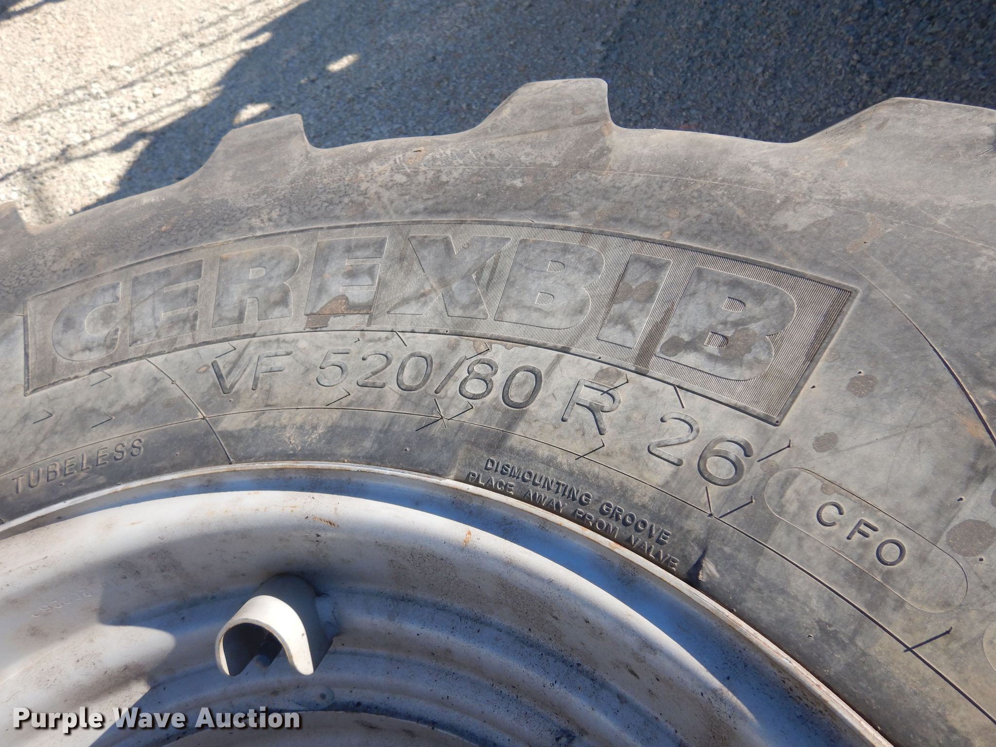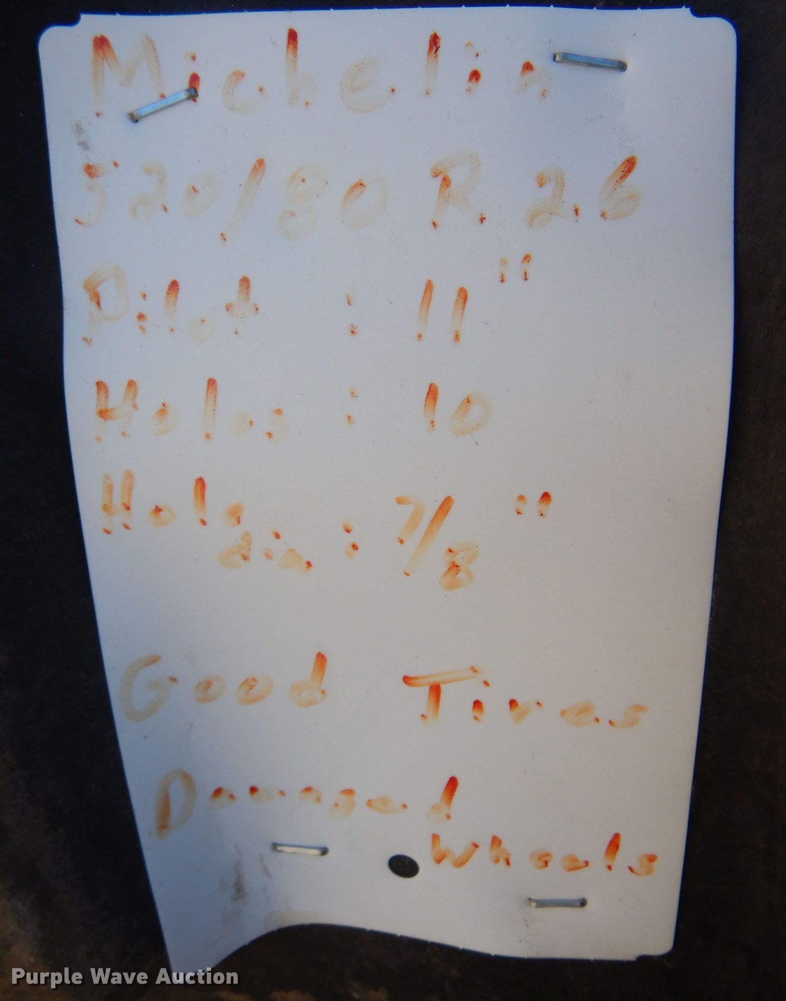 (2) Michelin 510/80R26 tires and wheels. 11" pilot hole, 10 bolt wheels, Wheels damaged. AGCO Corp. 420 W Lincoln Blvd. Hesston, KS 67062