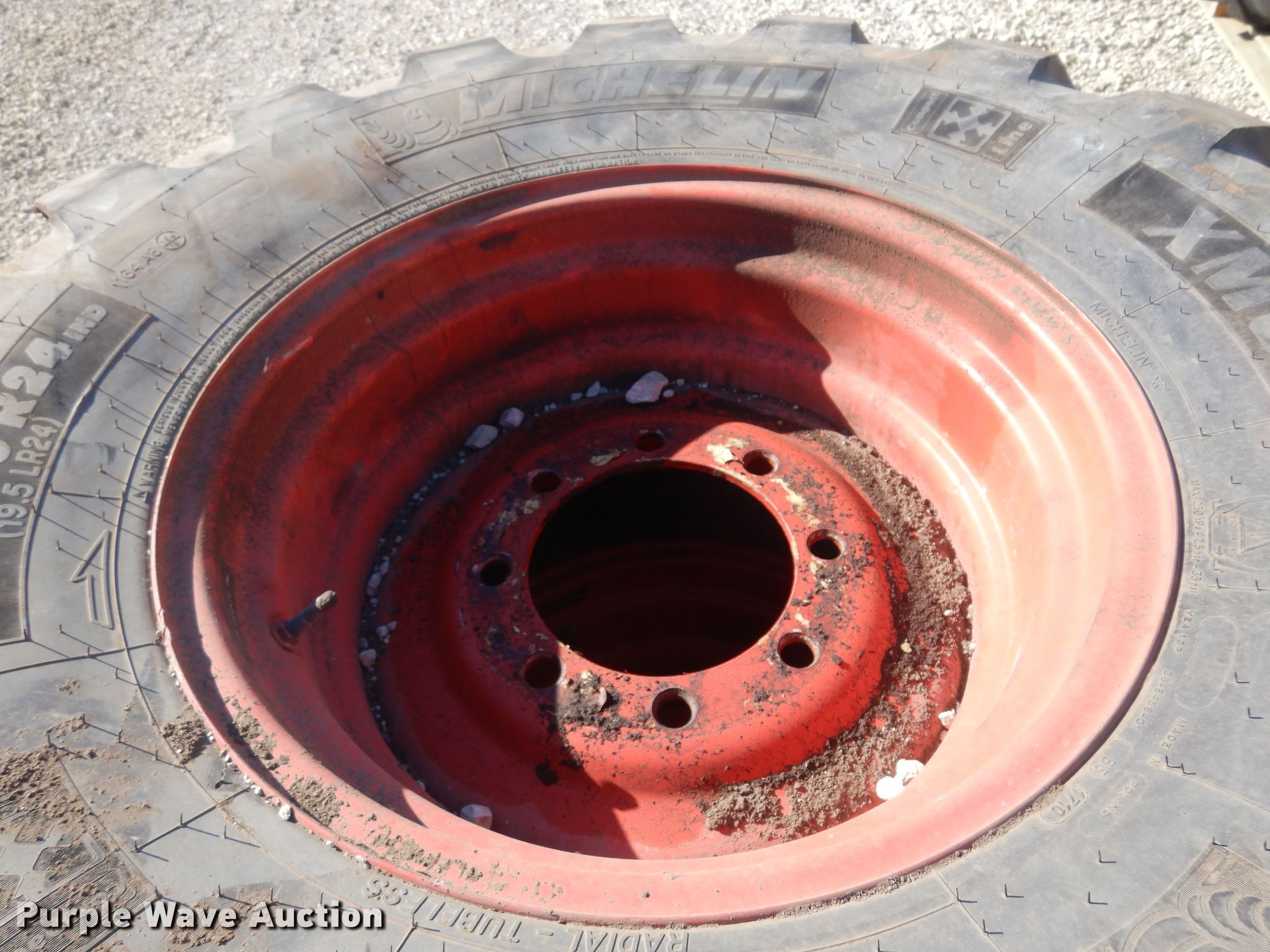 Purple Wave is selling a used Industrial Tires or Tracks in Kansas. This item is a (2) Michelin 500/R70R24 tires and wheels with the following: 8 3/4" pilot hole, 8 bolt wheels