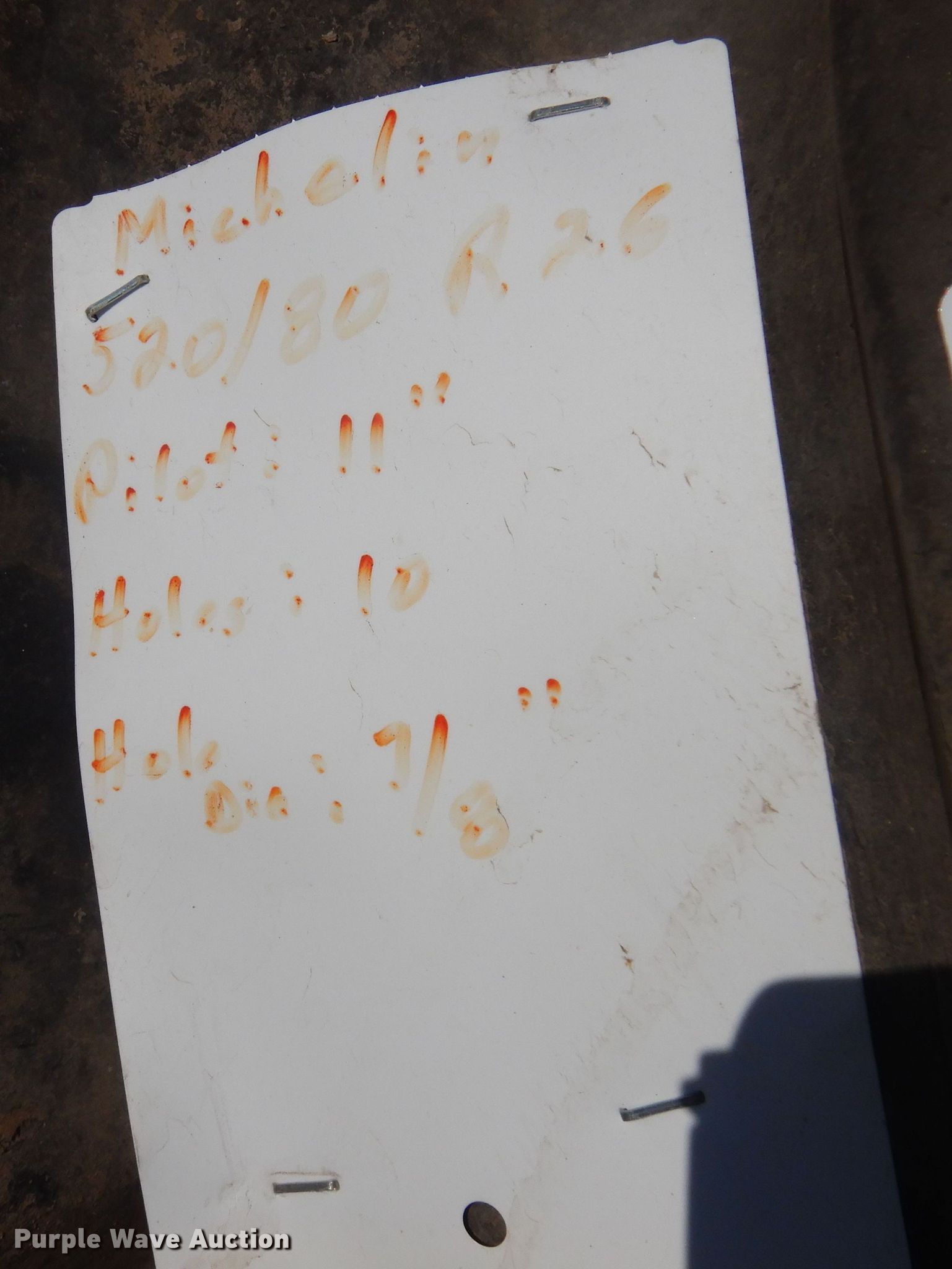 Purple Wave is selling a used Industrial Tires or Tracks in Kansas. This item is a (2) Michelin 510/80R26 tires and wheels with the following: 11" pilot hole, 10 bolt wheels