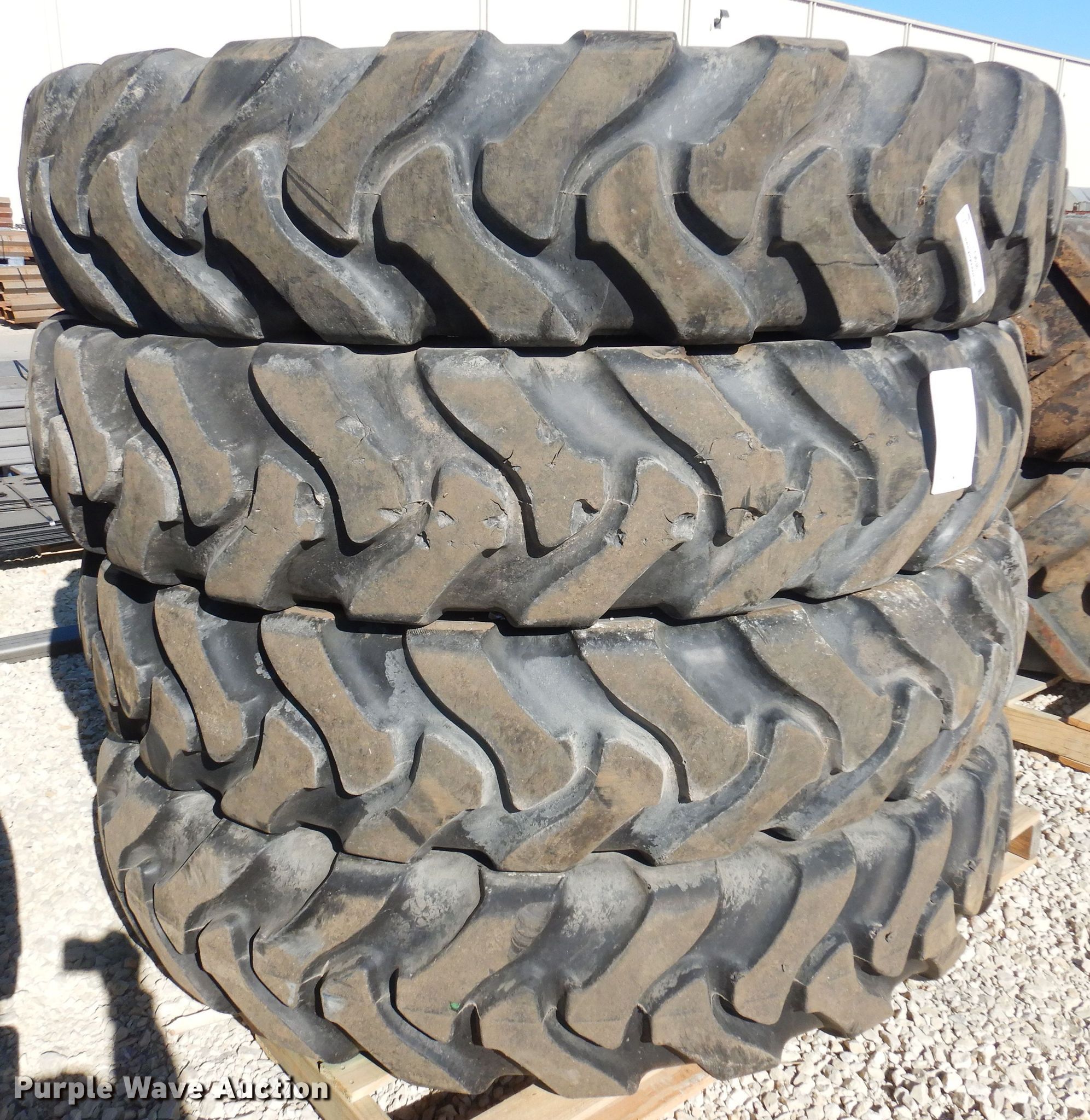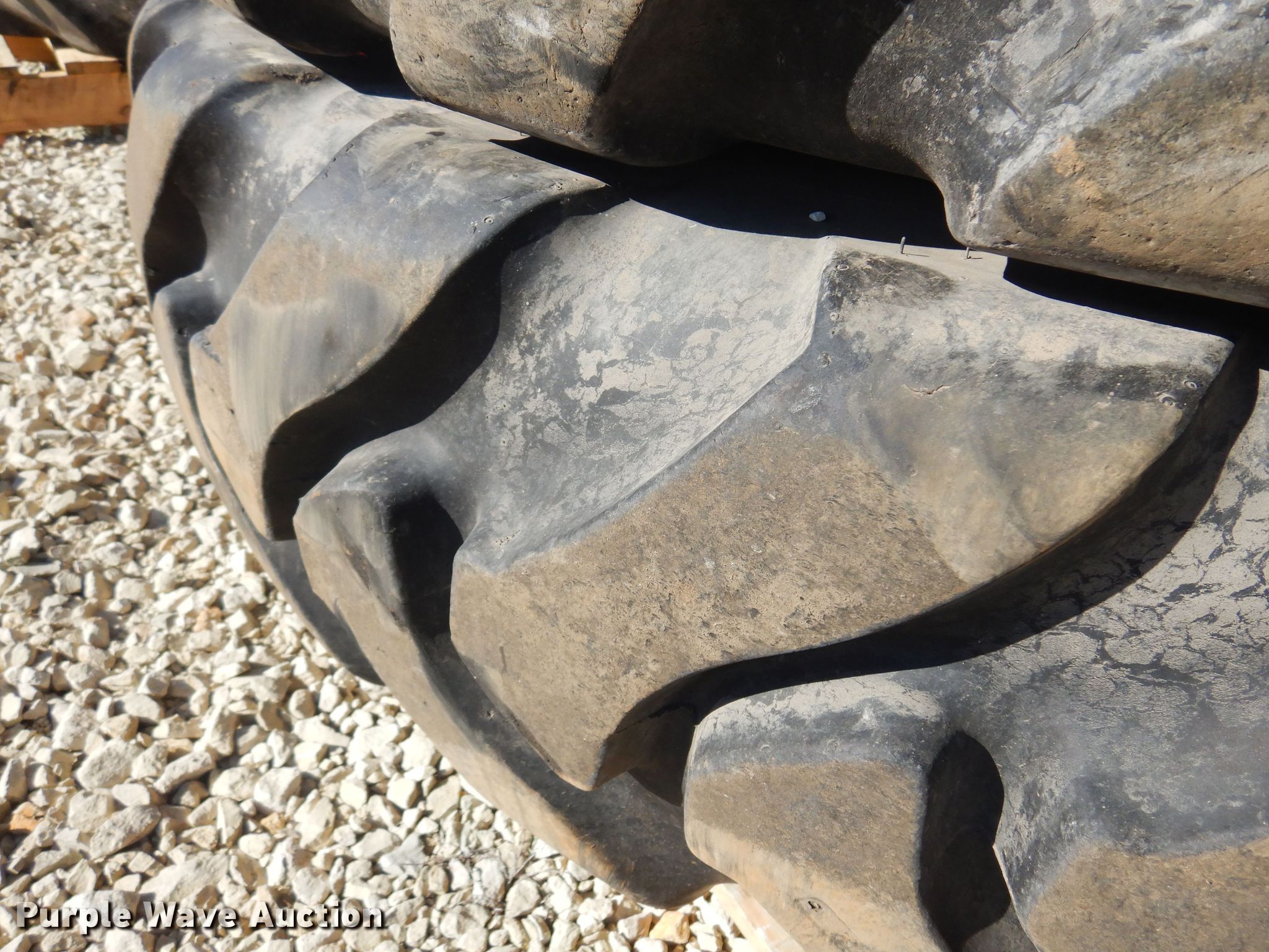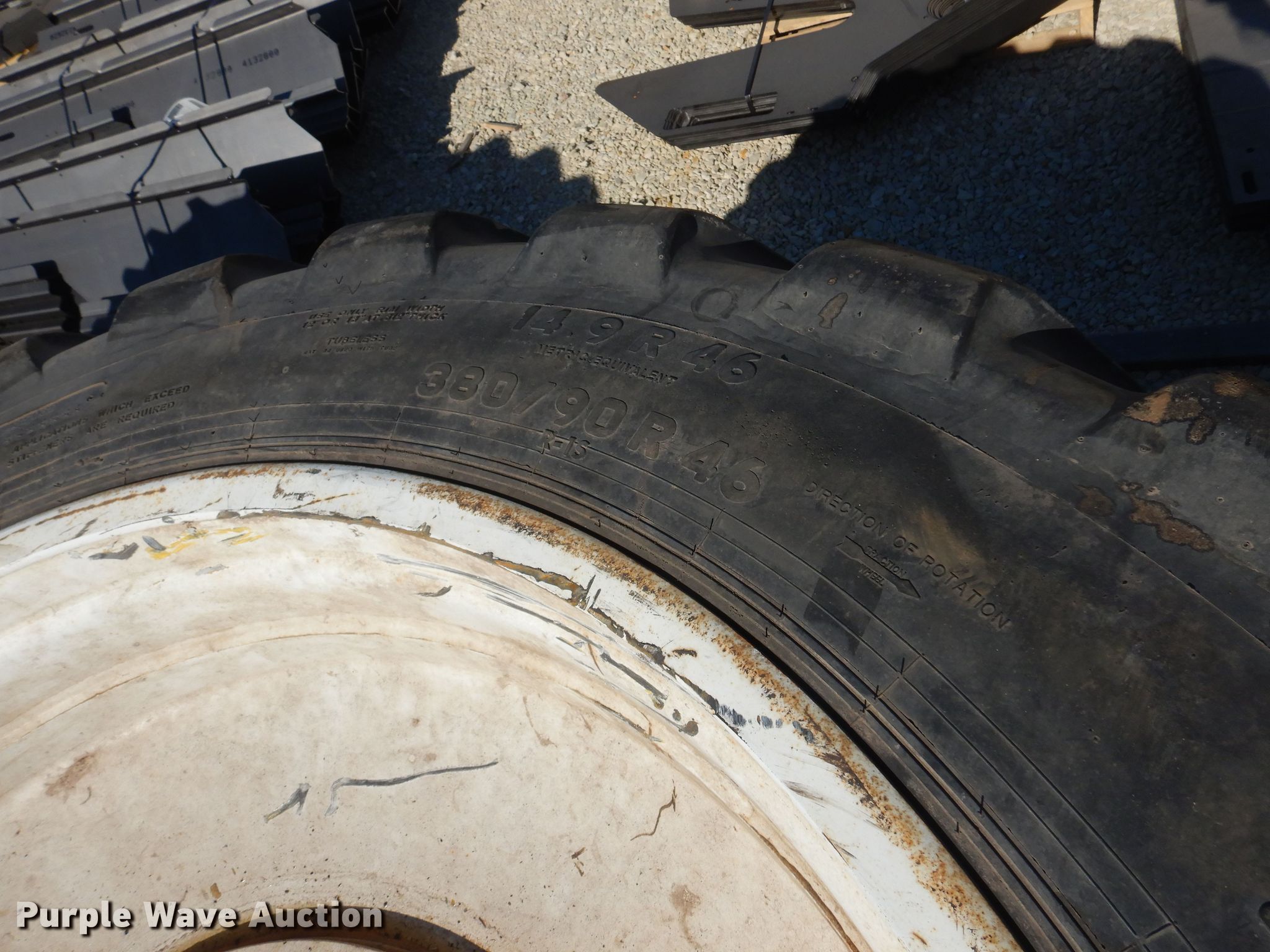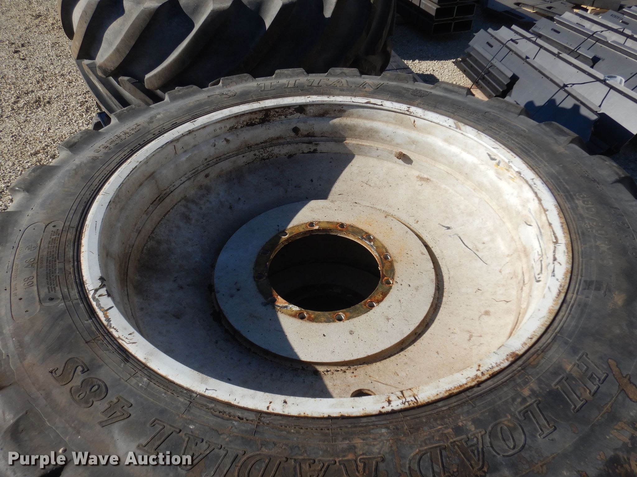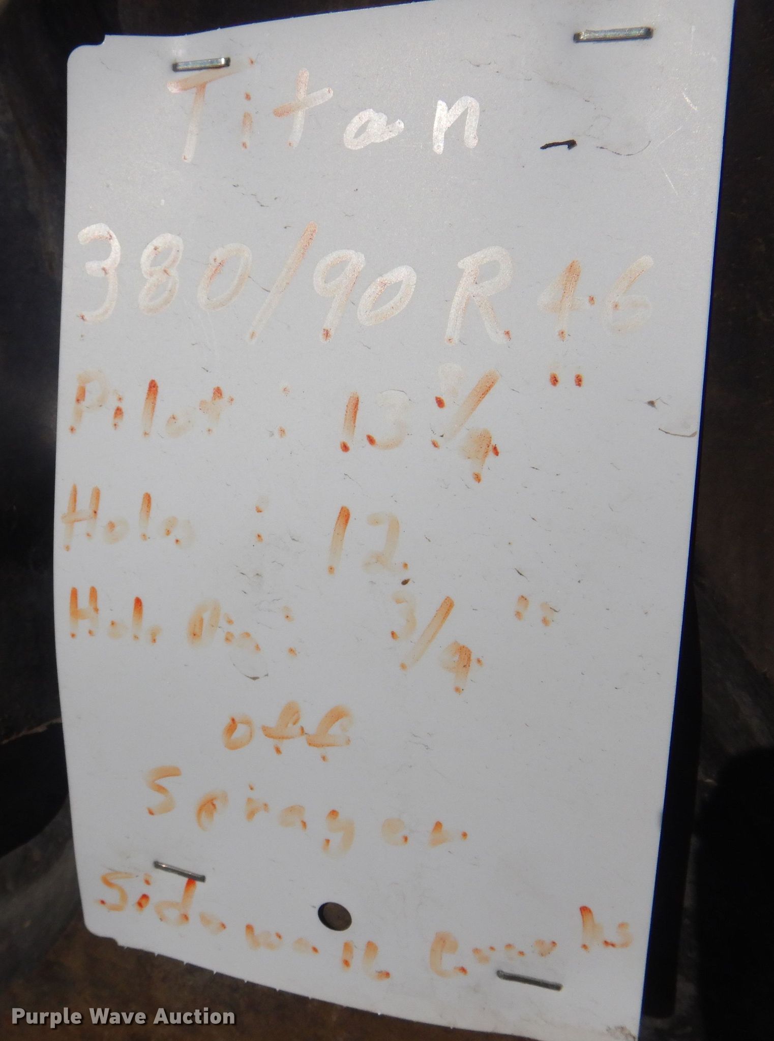 Purple Wave is selling a used Industrial Tires or Tracks in Kansas. This item is a (4) Titan 380/90R46 tires and wheels with the following: 13 3/4" pilot hole, 12 bolt wheels, Sidewalls cracked, Removed from a sprayer