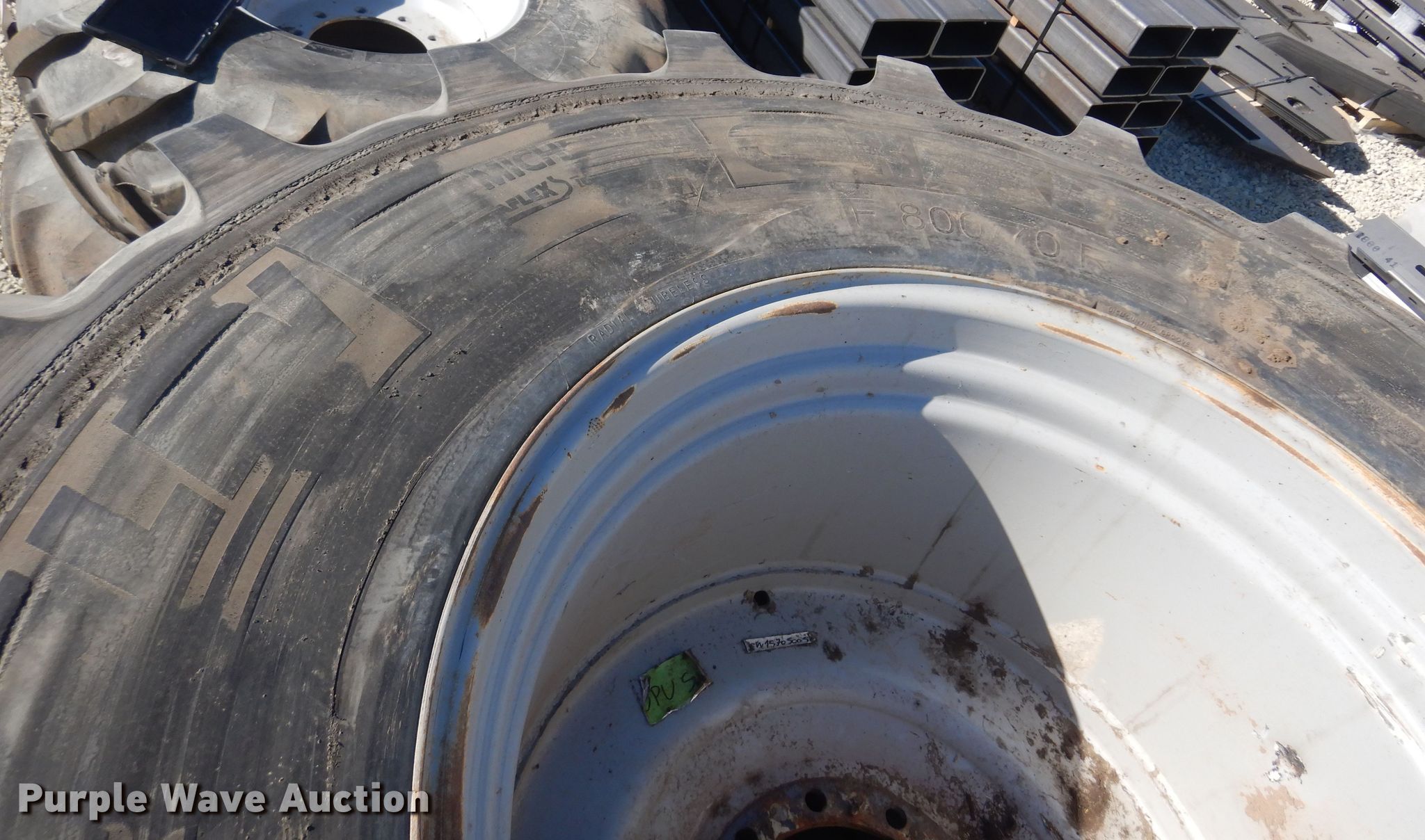 (2) Michelin 800/70R38 tires and wheels. 11" pilot hole, 10 bolt wheels, Sidewalls damaged. AGCO Corp. 420 W Lincoln Blvd. Hesston, KS 67062