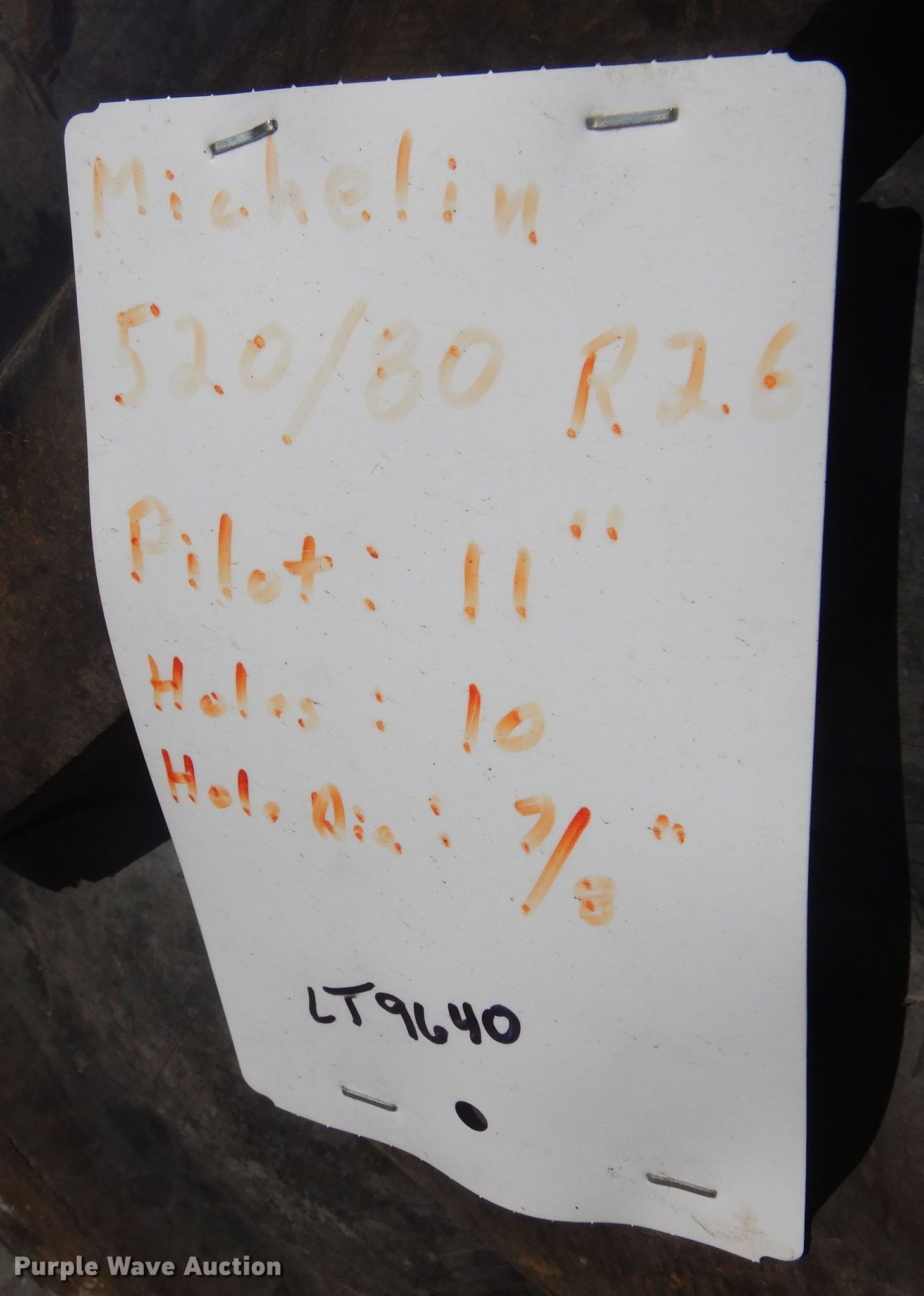 Purple Wave is selling a used Industrial Tires or Tracks in Kansas. This item is a (2) Michelin 520/80R26 tires and wheels with the following: 11" pilot hole, 10 bolt wheels