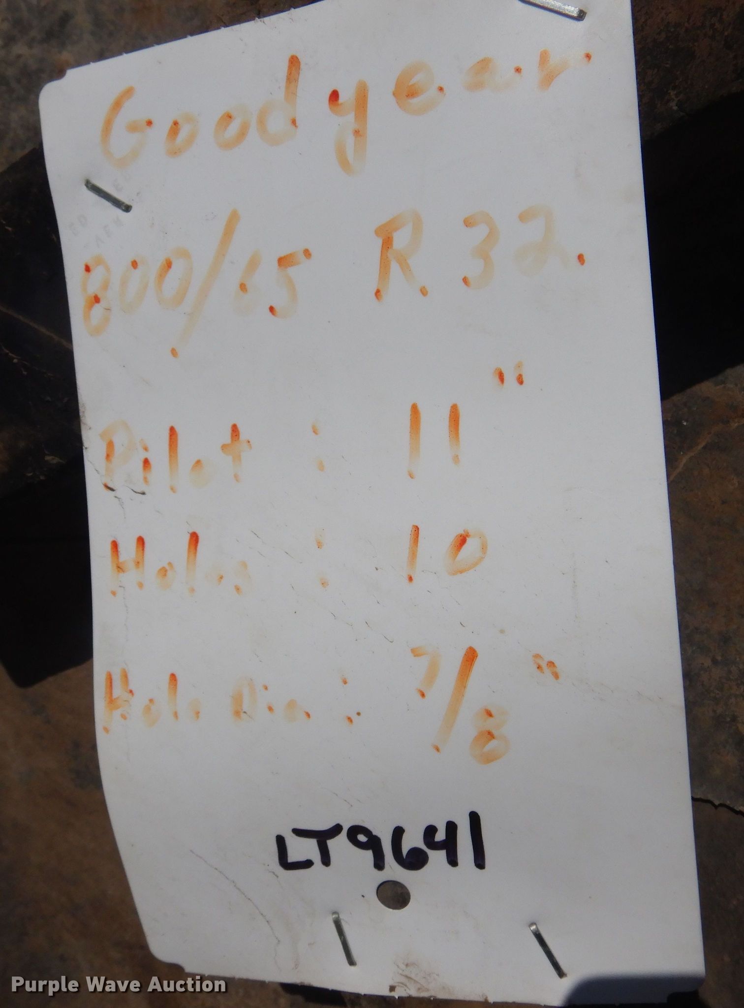 Purple Wave is selling a used Industrial Tires or Tracks in Kansas. This item is a (2) Goodyear 800/65R32 tires and wheels with the following: 11" pilot hole, 10 bolt wheels