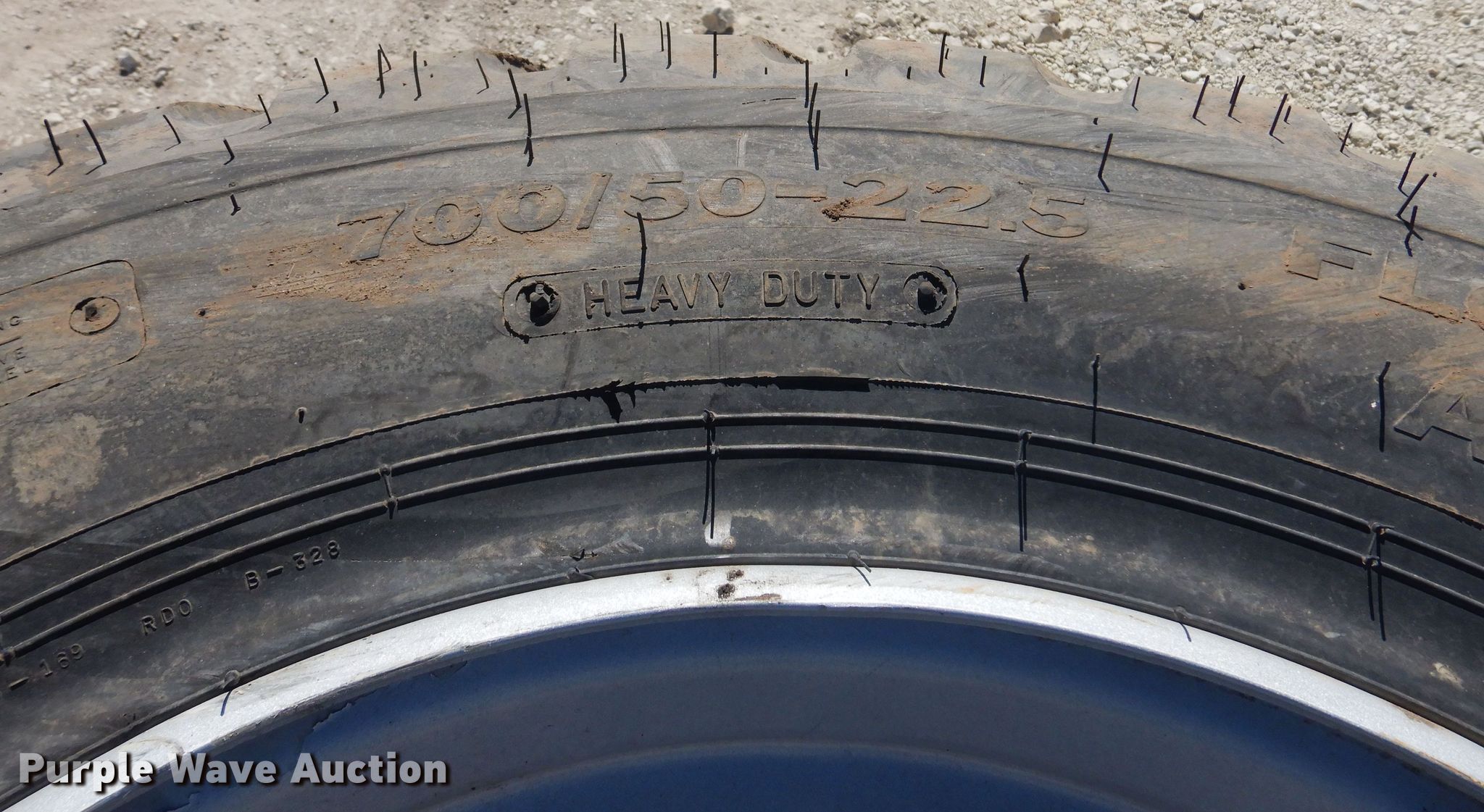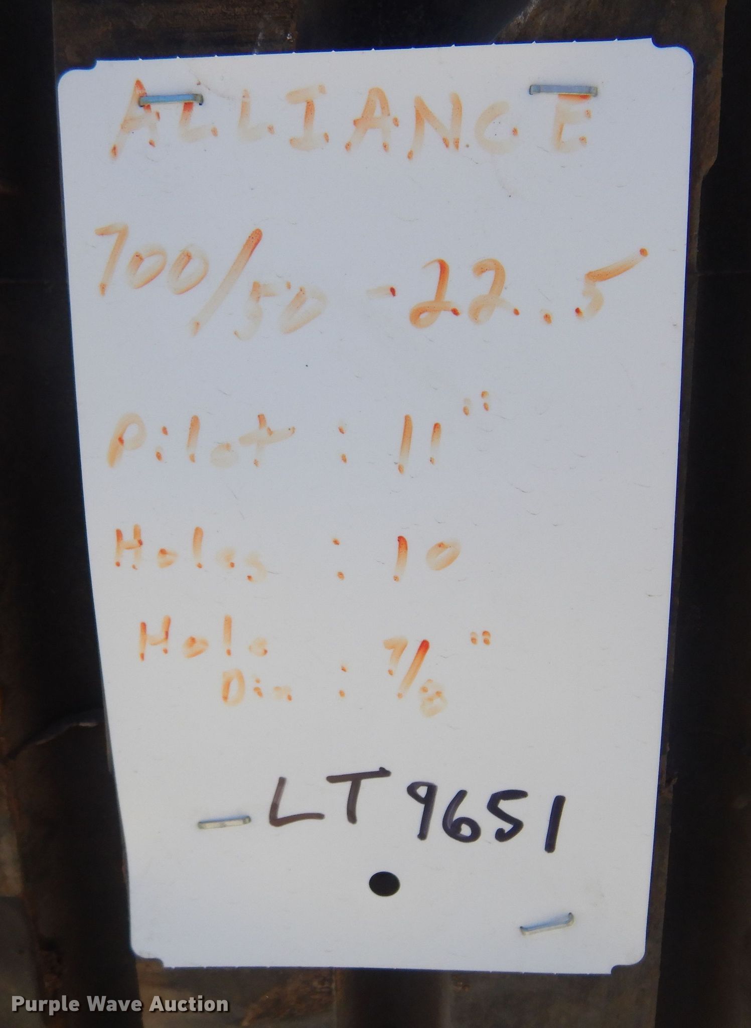 Purple Wave is selling a used Industrial Tires or Tracks in Kansas. This item is a (2) Alliance 700 /50-22.5 tires and wheels with the following: 11" pilot hole, 10 bolt wheels