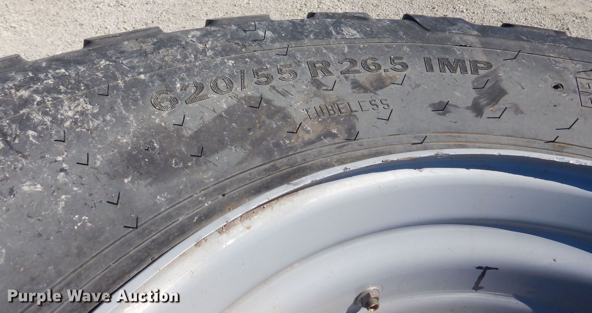 Purple Wave is selling a used Industrial Tires or Tracks in Kansas. This item is a (2) Alliance 620/55R26.5 tires and wheels with the following: 11" pilot hole, 10 bolt wheels, Valve stem missing