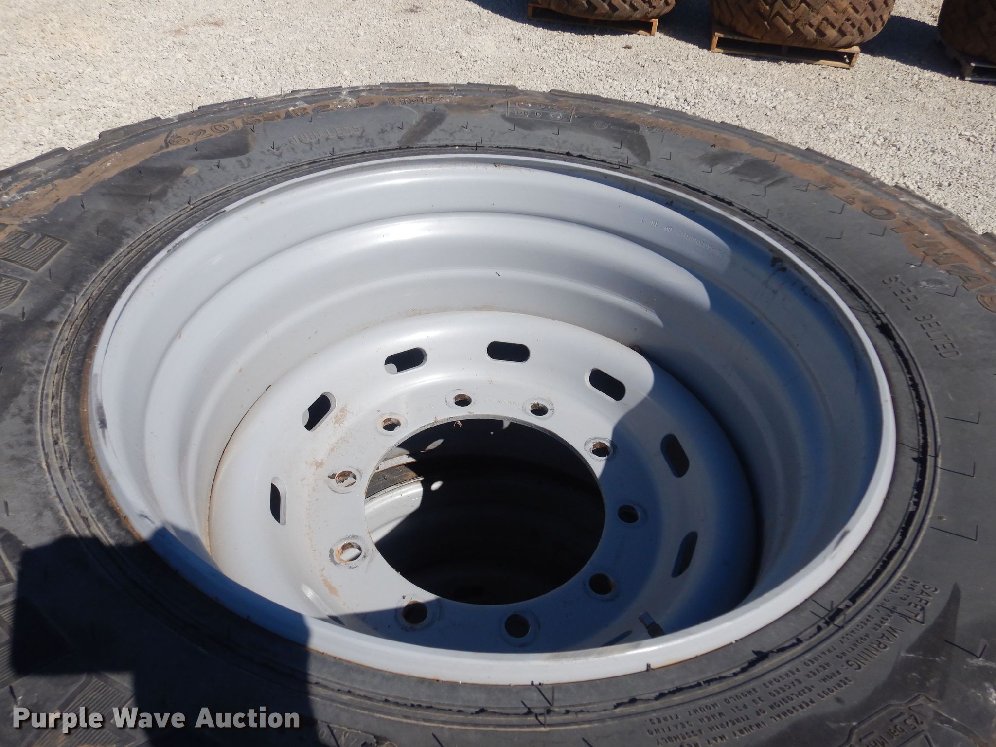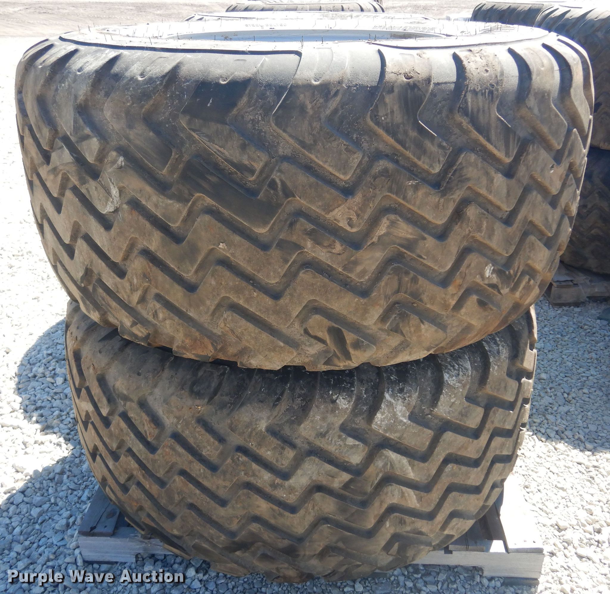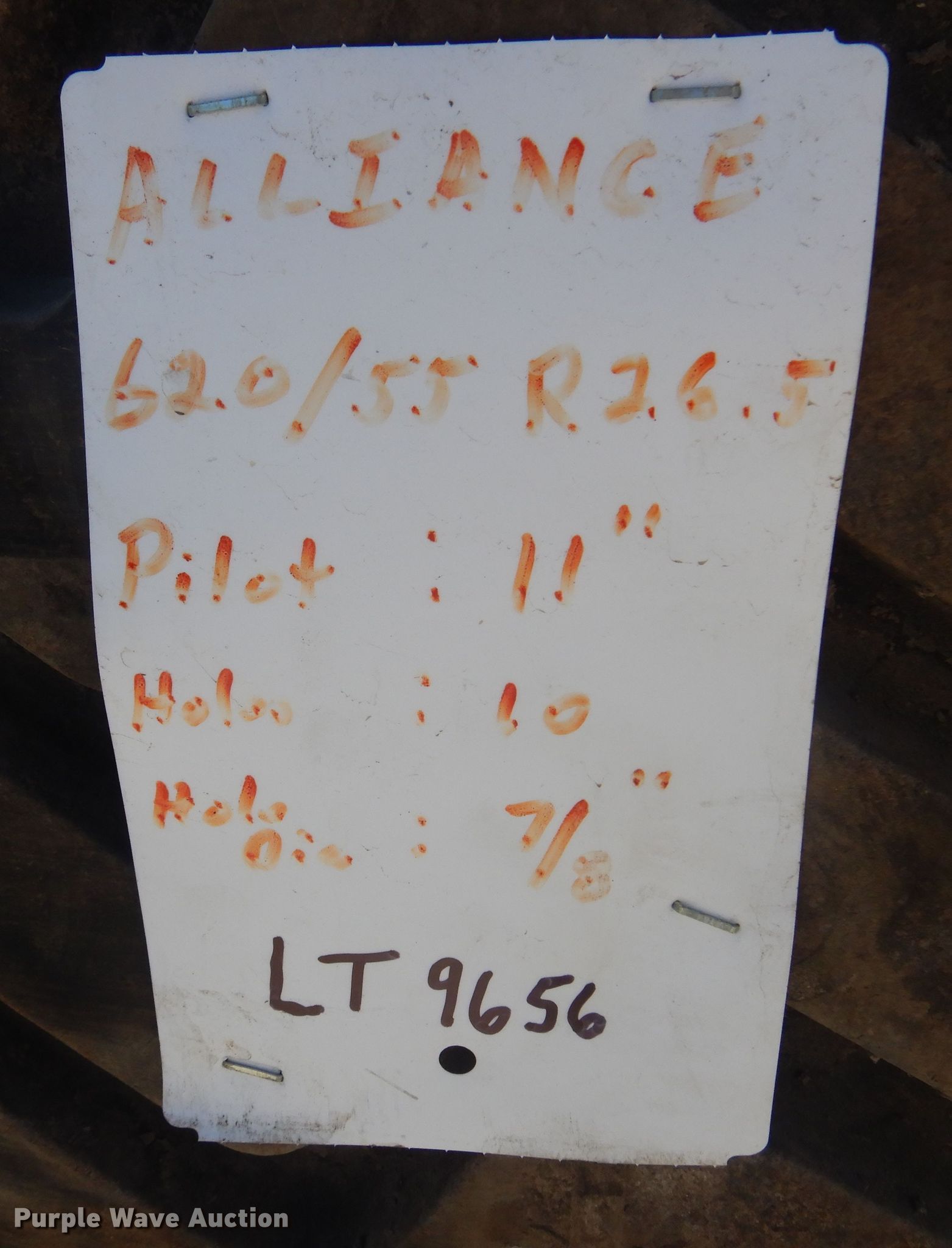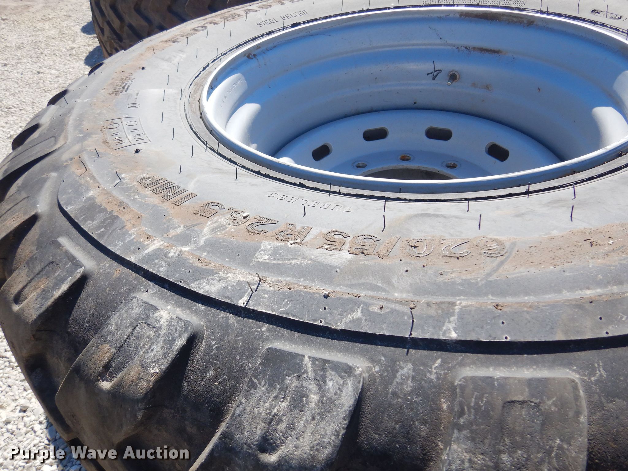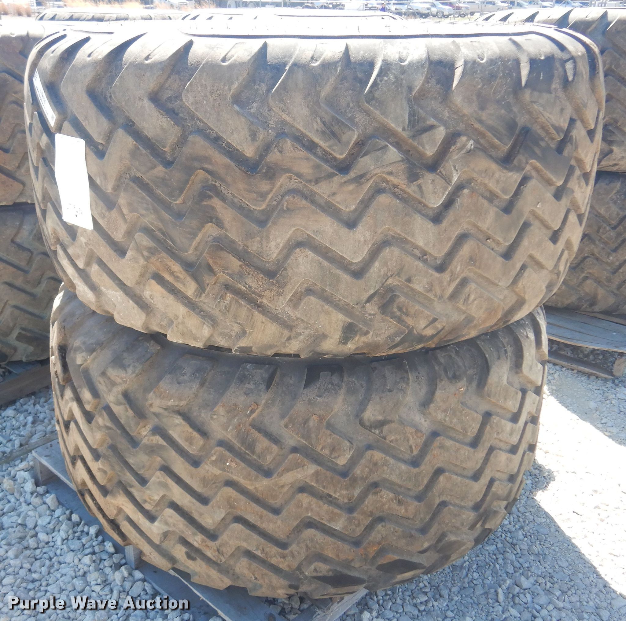 Purple Wave is selling a used Industrial Tires or Tracks in Kansas. This item is a (2) Alliance 620/55R26.5 tires and wheels with the following: 11" pilot hole, 10 bolt wheels