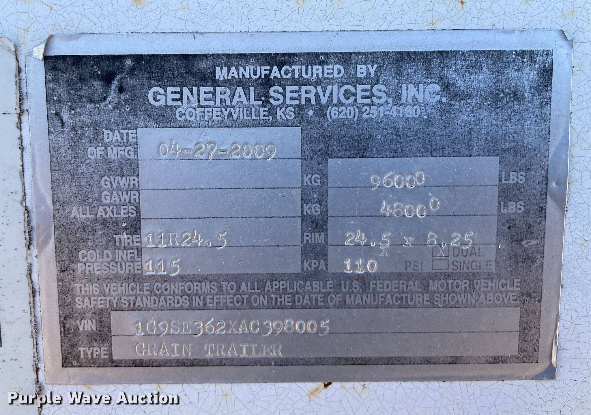 Purple Wave is selling a used Grain or Commodity Trailer in Kansas. This item is a 2010 General Services GS136 grain trailer with the following: VIN: 1G9SE362XAC398005