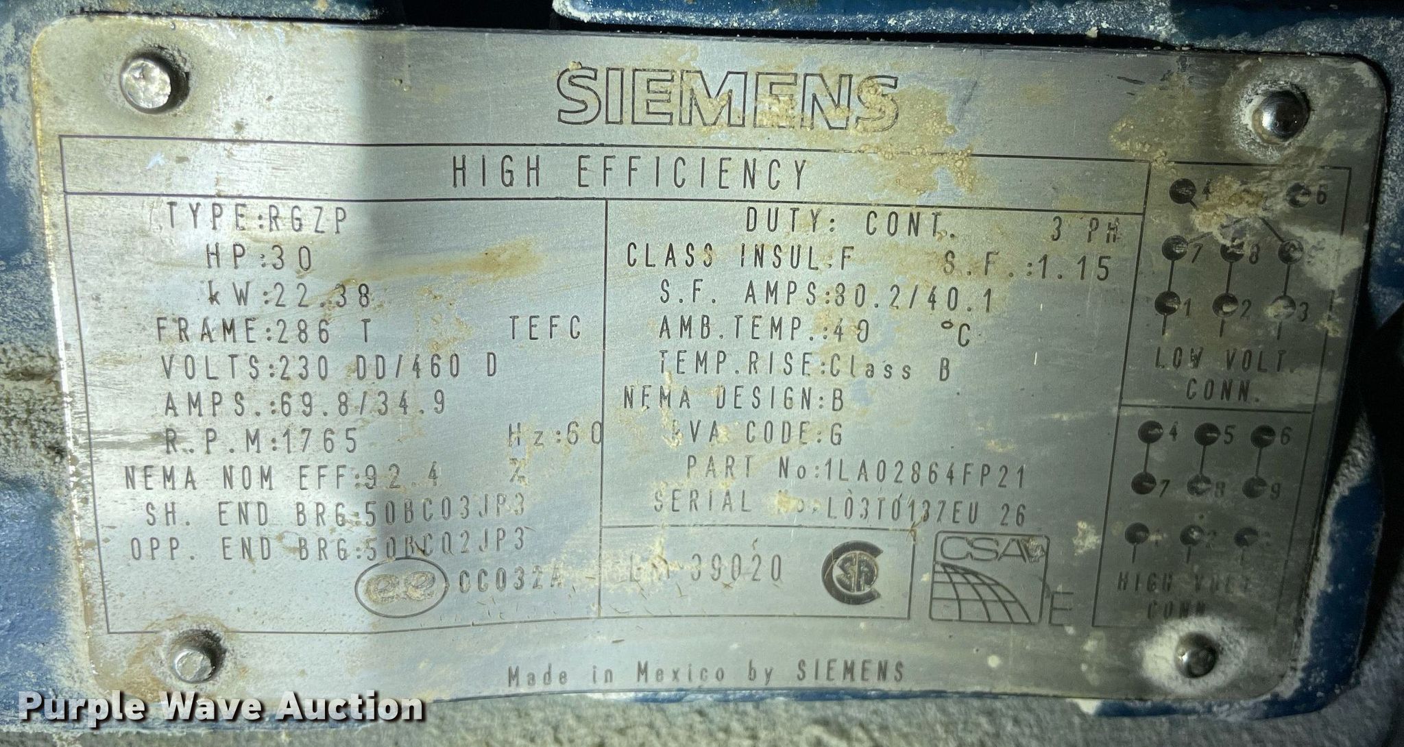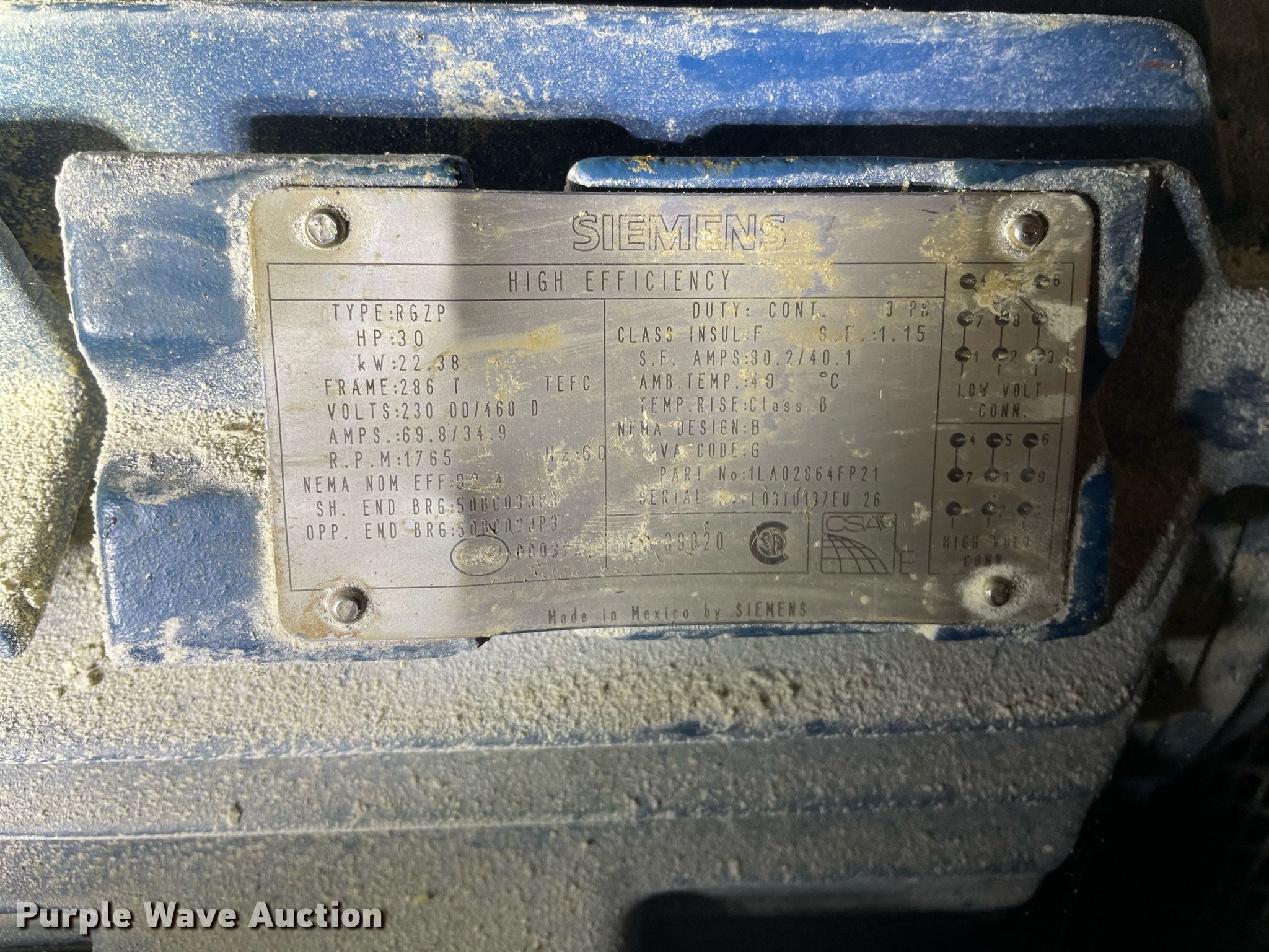 Gardner Denver GGDBADA grain blower. Serial: S502805. Electric Motor Siemens RGZP, HP: 30, kW: 22.38, Phase: Three. Features Maximum RPM: 4,000. Salina, KS 67401