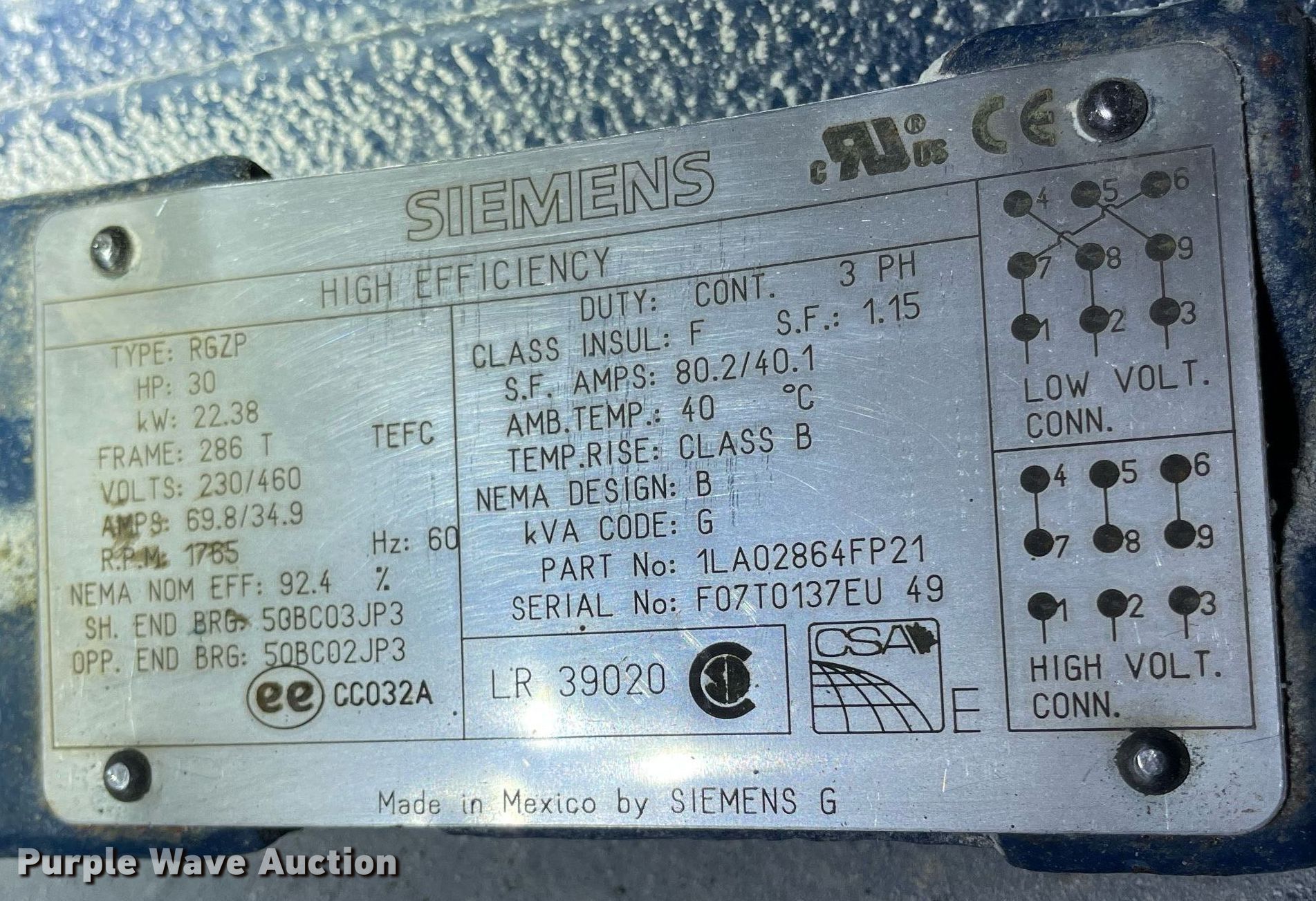 Gardner Denver GGDBADA grain blower. Serial: S504827. Electric Motor Siemens RGZP, HP: 30, kW: 22.38, Phase: Three. Features Maximum RPM: 4,000. Salina, KS 67401