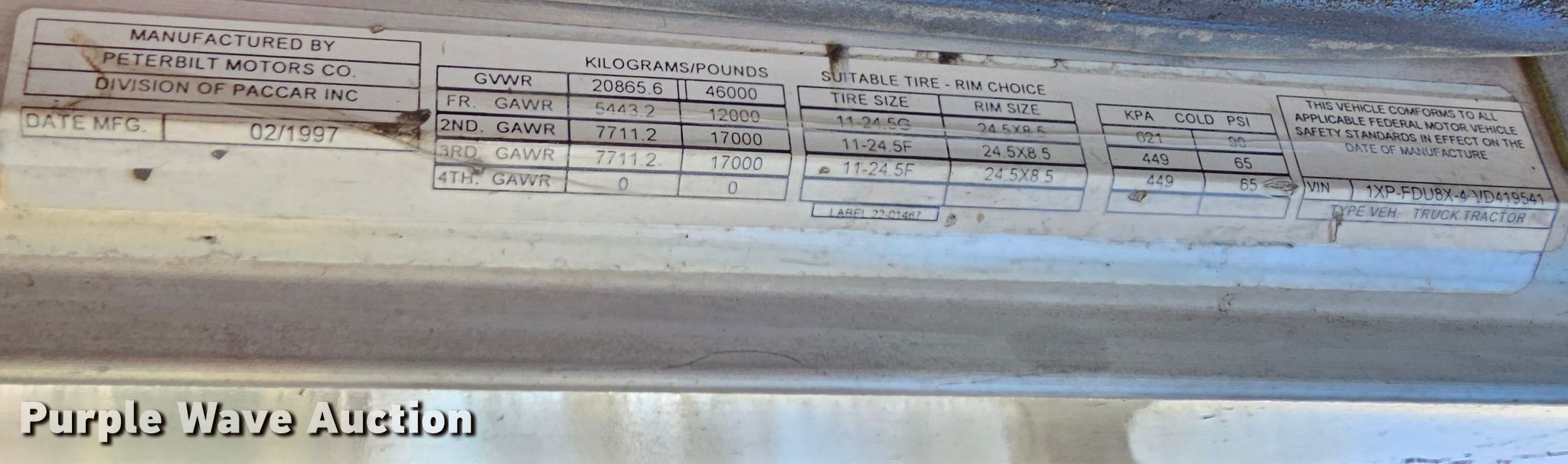 Purple Wave is selling a used Truck Tractor in Kansas. This item is a 1997 Peterbilt 378 semi truck with the following: Miles: 1,033,417 on odometer, VIN: 1XPFDU8X4VD419541, Unit #: JB197