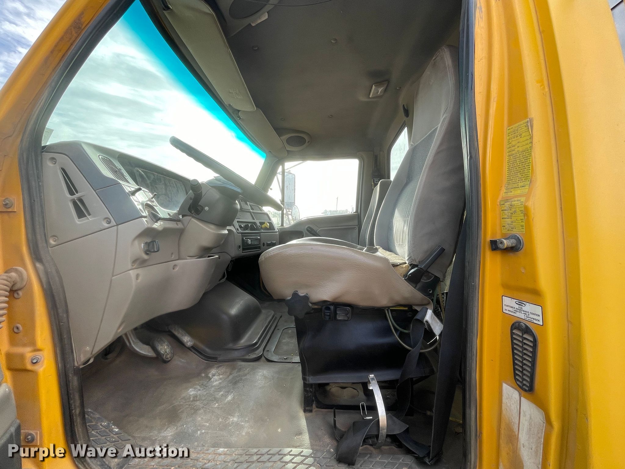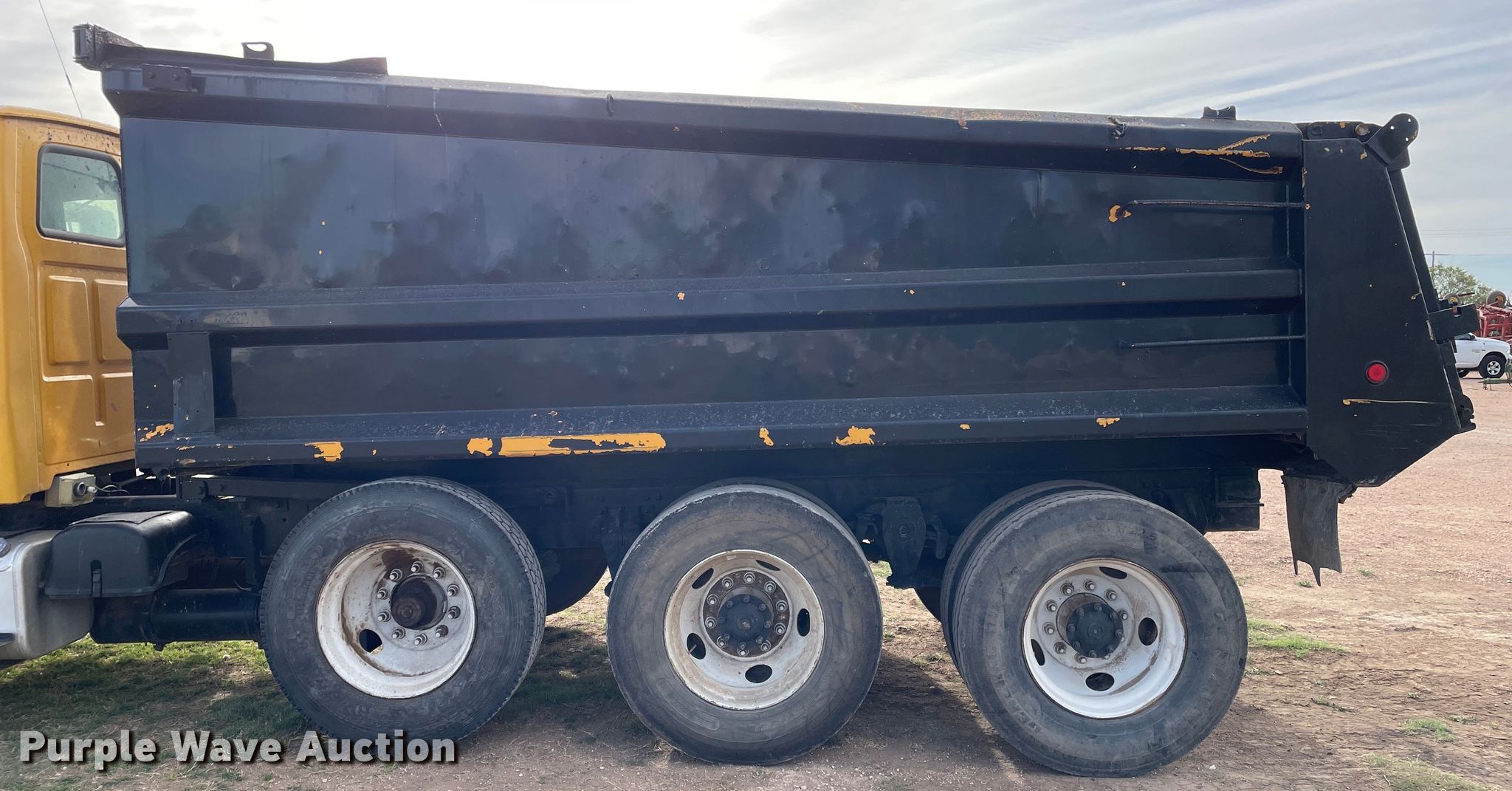 2005 Sterling Acterra dump truck. Miles: 332,173 on odometer, Hours: 18,477 on meter, VIN: 2FZHCHDC75AV37749. Engine Caterpillar, Displacement: 7.2L, Cylinders: 6, Fuel type: Diesel. Transmission Automatic. Chassis Double frame, Axles: Tandem, Pusher axle, Differential lock: Inter-axle, Suspension: Spring, Brakes: Air, PTO, GVWR: 65,200 lbs FAWR: 12,000 lbs, RAWR: 53,200 lbs. Interior AC, Heat, Cruise control. Features Dump bed Henderson, 16' L x 8' W, Side height: 44", Bed type: Steel, Ram: Single , End gate: Air operated. Tires Size: 11R22.5, Lift axle: 11R22.5. Notes Dash warning indicator: ABS, Driver side door handle broken. Texas title. Title distribution may be delayed up to 30 days from verification of funds. High Plains Hay Producers. 110 Shelton Avenue. Groom, TX 79039