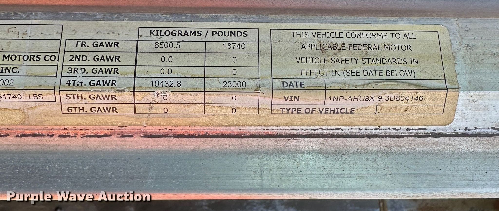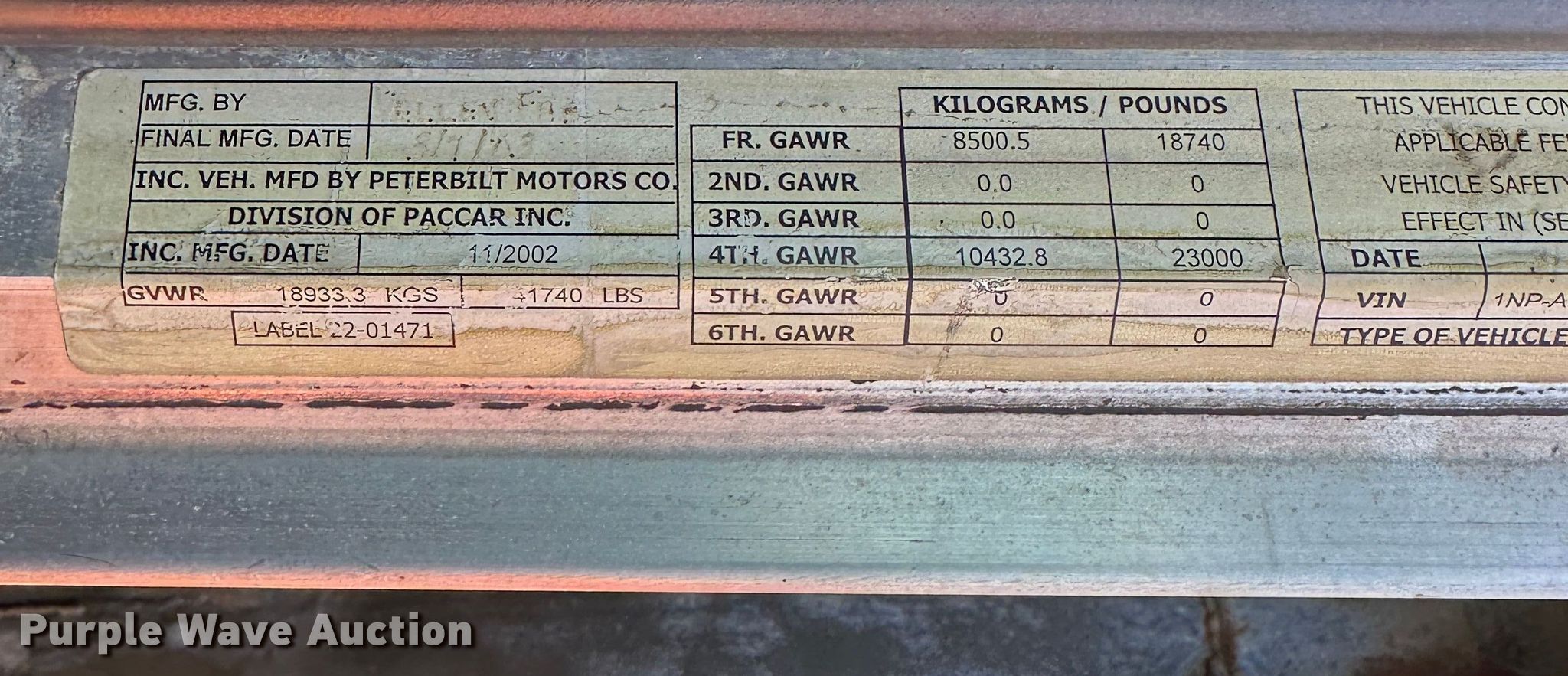 2003 Peterbilt 357 dump truck. Miles: 55,784 on odometer, Hours: 4,186 on meter, VIN: 1NPAHU8X93D804146. Engine Caterpillar C12, Displacement: 12.0L, Cylinders: 6, Fuel type: Diesel, Engine brake. Transmission Allison, Automatic. Chassis Axles: Single, Differential lock: Inter-axle, Suspension: Air, Brakes: Air, PTO, GVWR: 41,740 lbs FAWR: 18,740 lbs, RAWR: 23,000 lbs. Interior AC, Heat. Features Dump bed 10' L x 96" W, Side height: 35", Side board height: 12", Bed type: Steel, Ram: Single , End gate: Air operated. Tires Front: 385/65R22.5, Rear: 11R22.5. Notes Non-operational unit. Kansas non-hwy not intended for road use title. Title distribution may be delayed up to 14 days from verification of funds. Wamego, KS 66547
