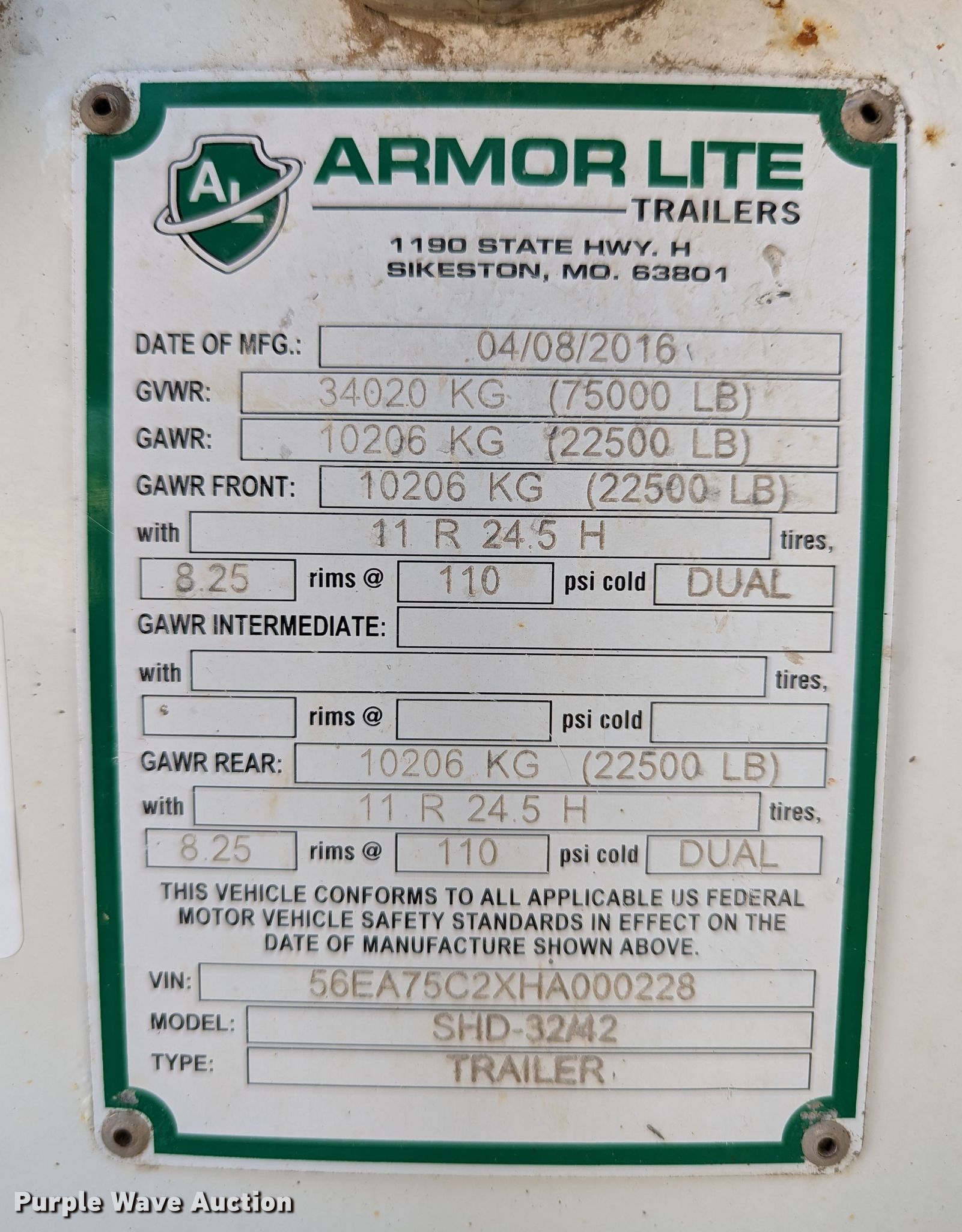 2017 Armor Lite SHD-32/42 end dump trailer. VIN: 56EA75C2XHA000228. Dimensions Overall: 32' L x 102" W, Side height: 42". Features Body type: Steel, Ram: Single, End gate: Air operated, Roll tarp. Chassis Landing gear: Dual, Suspension: Spring, Brakes: Air, Axles: Tandem, GVWR: 75,000 lbs, GAWR: 22,500 lbs. Tires Steel wheels, Size: 11R24.5. Oklahoma title. Title distribution may be delayed up to 30 days from verification of funds. Tipton Excavating. 624 North Virginia Drive. Oklahoma City, OK 73107