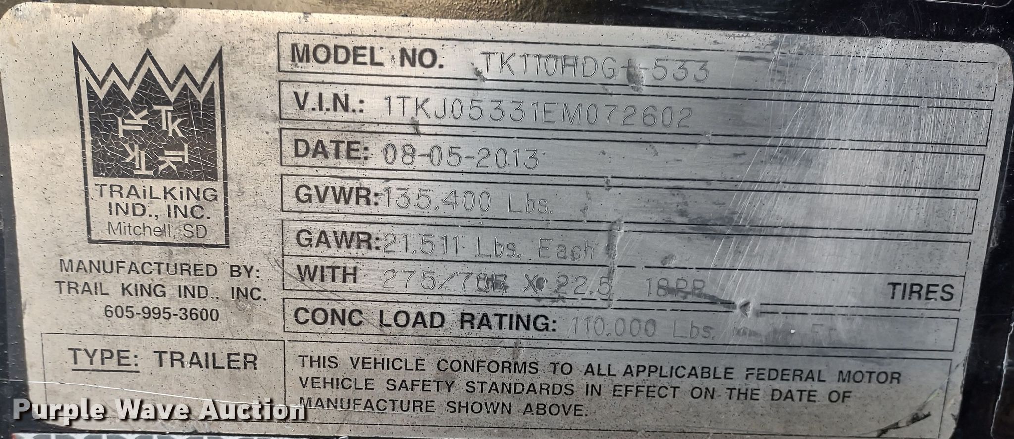 Purple Wave is selling a used Equip. Trailer in Missouri. This item is a 2014 Trail King TK110HDG-533 lowboy equipment trailer with the following: VIN: 1TKJ05331EM072602