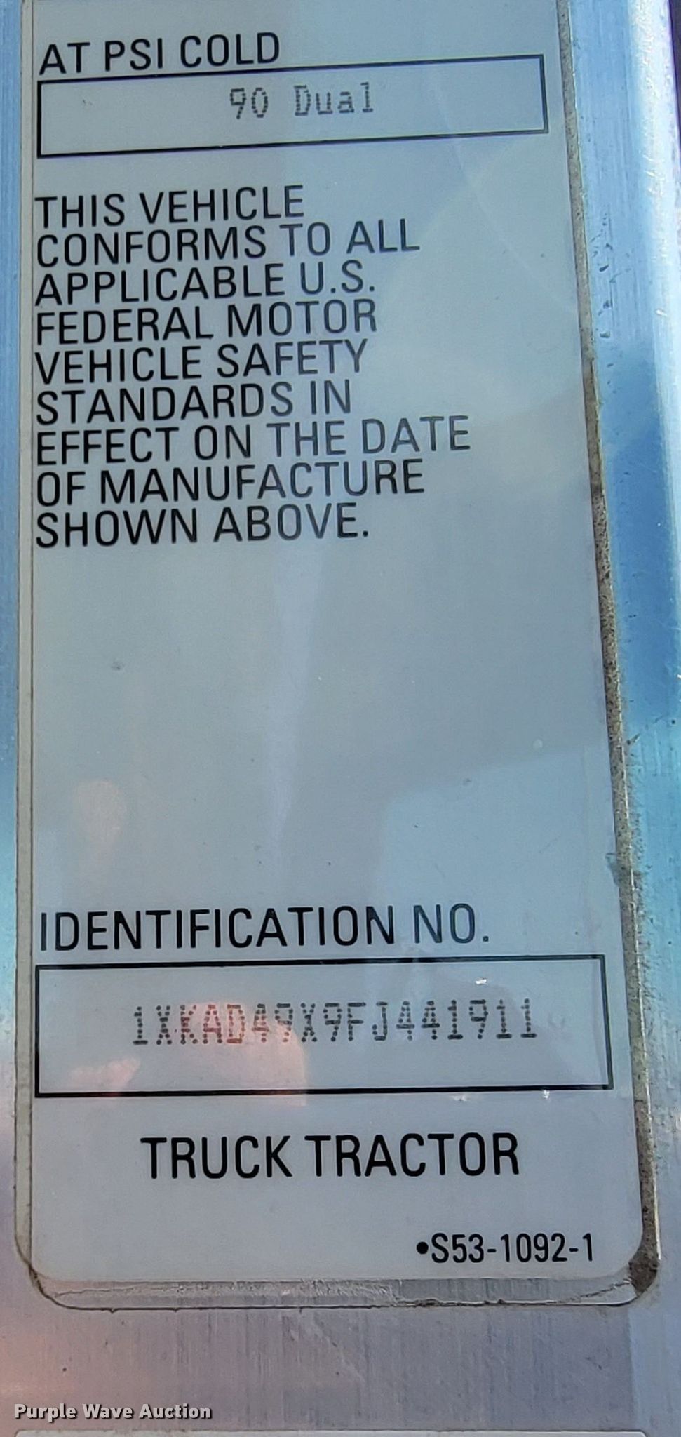 2015 Kenworth T660 semi truck. Miles: 607,334 on odometer, VIN: 1XKAD49X9FJ441911. Engine Cummins ISX15, Displacement: 14.9L, Cylinders: 6, Fuel type: Diesel, Engine brake. Transmission Eaton Fuller, Manual, Speed: 13. Chassis Axles: Tandem, Differential lock: Inter-axle, Suspension: Air, Brakes: Air, PTO, GVWR: 51,200 lbs FAWR: 13,200 lbs, IAWR: 19,000 lbs, RAWR: 19,000 lbs. Interior AC, Heat, Power windows, Power locks, Cruise control, Air ride cab, Sleeper Sleeper length: 55", Beds: Single, Rear climate control. Features Fifth wheel type: Air operated, Sliding, Fuel tank: Dual. Tires Size: 285/75R24.5. Notes DEF deleted. Oklahoma title. Title has a lien that will be released following the close of the auction. Title distribution may be delayed up to 30 days from verification of funds. Jason Hensley Farms. Vinita, OK 74301