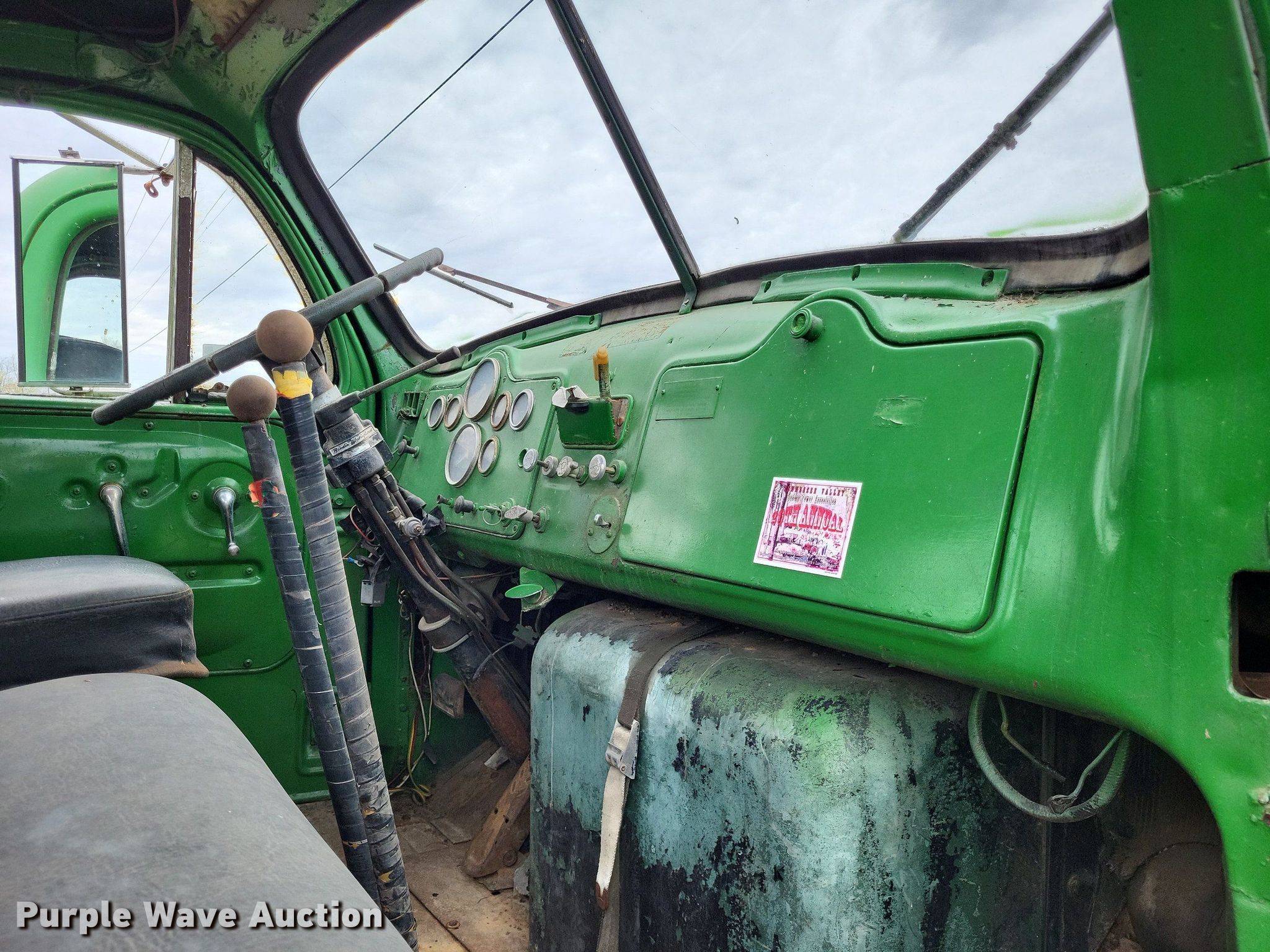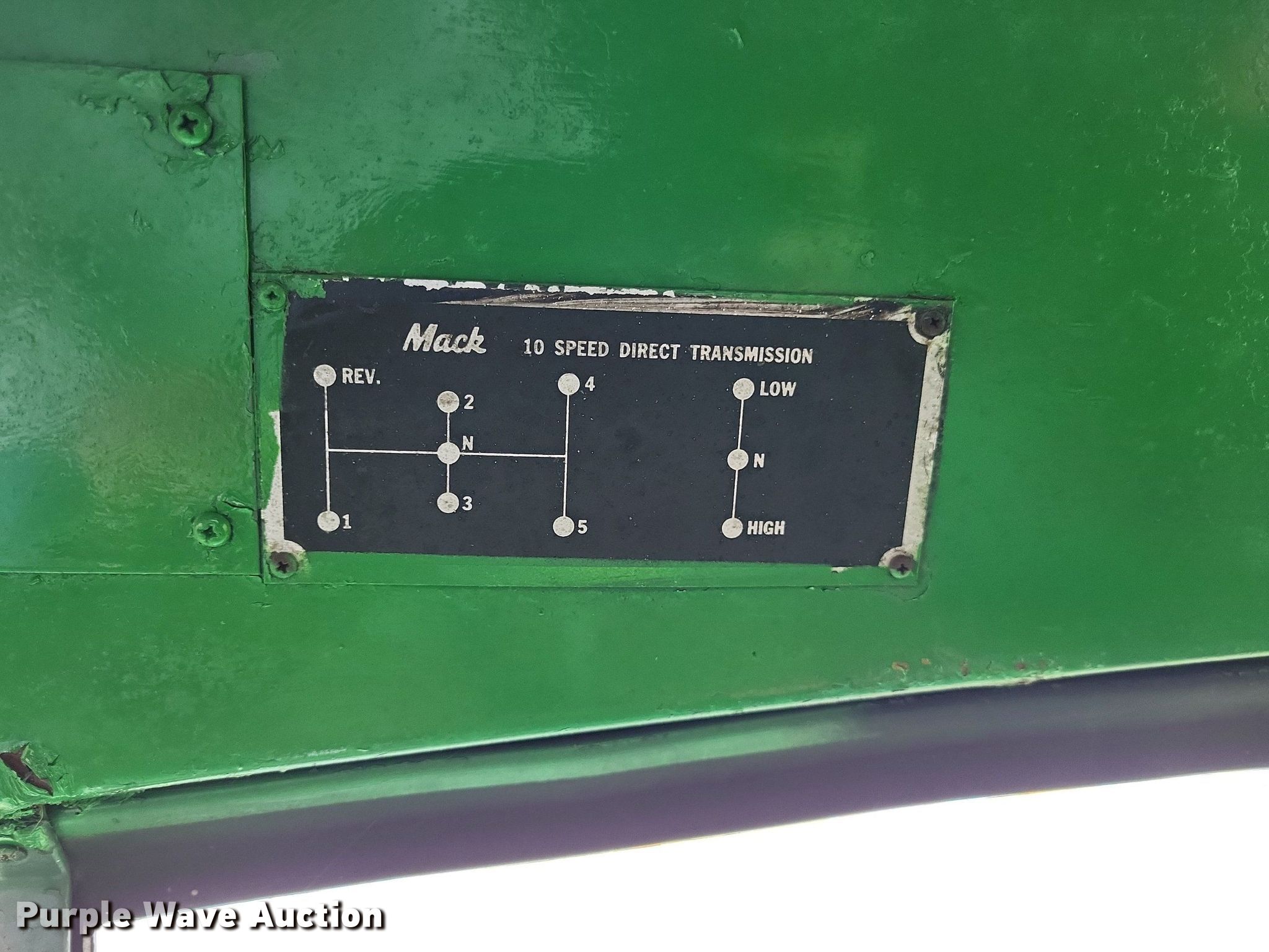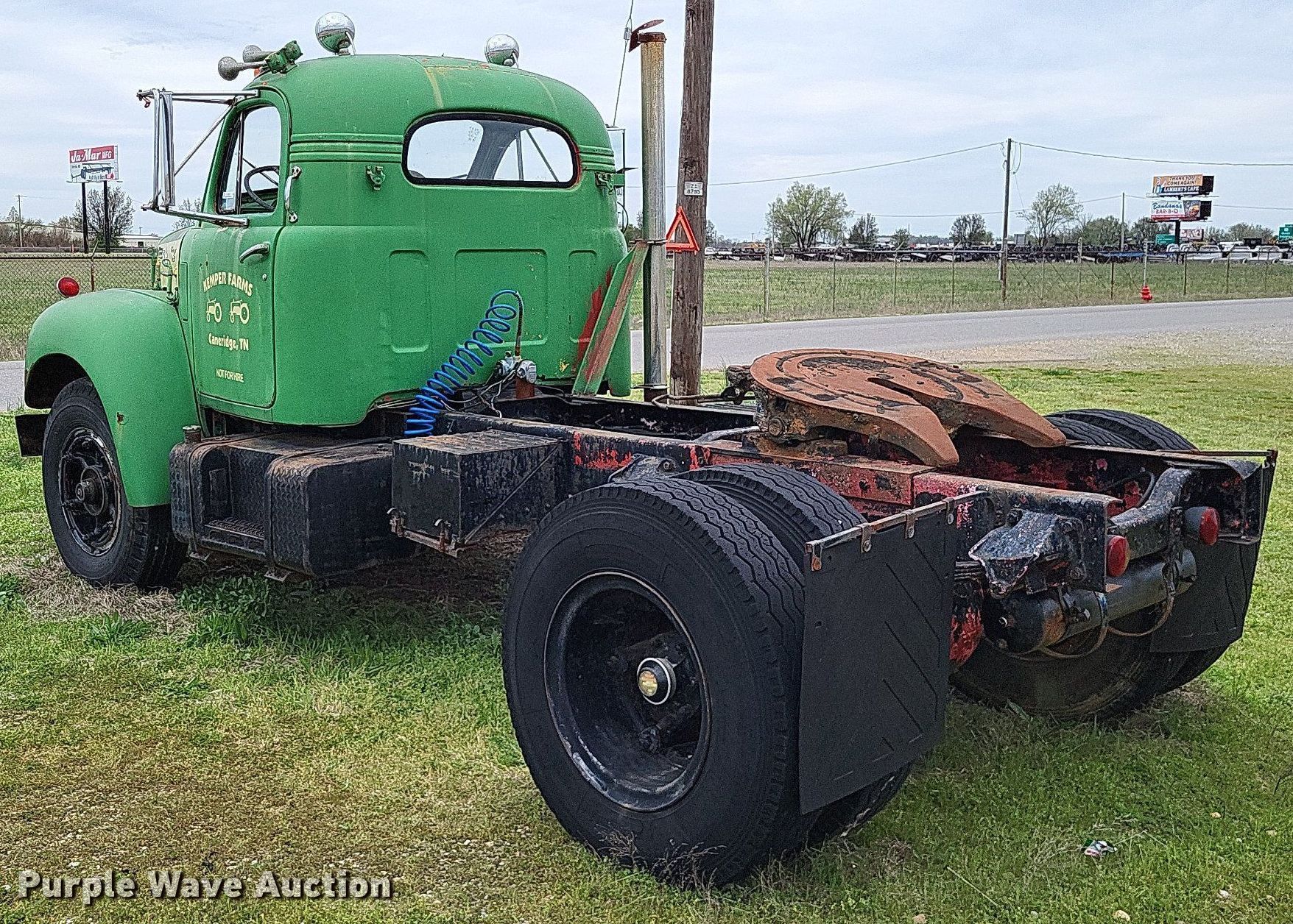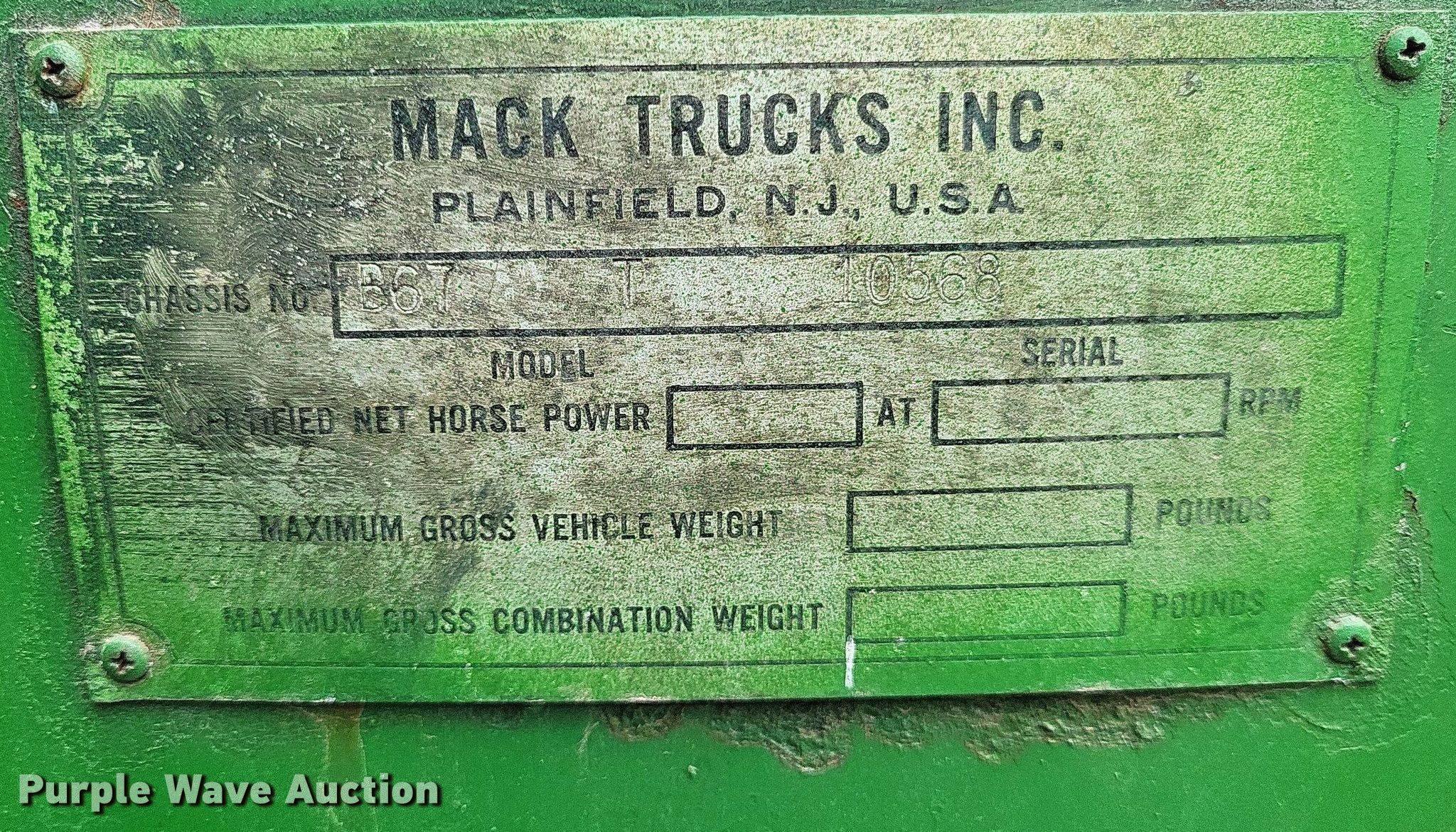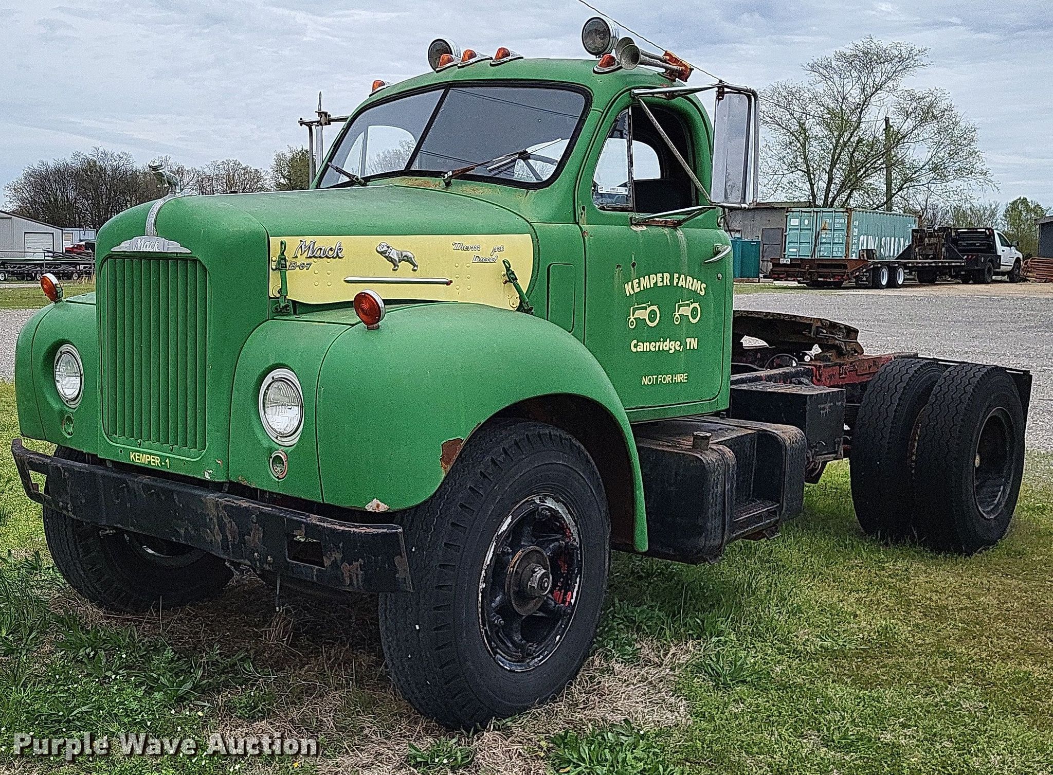 1965 Mack B67 truck cab and chassis. Miles: 566,990 on odometer, VIN: B67T10568. Engine Cylinders: 6, Fuel type: Diesel. Transmission Manual. Chassis Axles: Single, Suspension: Spring, Brakes: Air, Truck chassis: 112". Features Fifth wheel type: Fixed, Fuel tank: Dual. Tires Size: 10.00-20. Notes Windshield chipped or cracked. Missouri title. Title distribution may be delayed up to 14 days from verification of funds. Oliver Trucking. 212 M Interstate. Sikeston, MO 63801