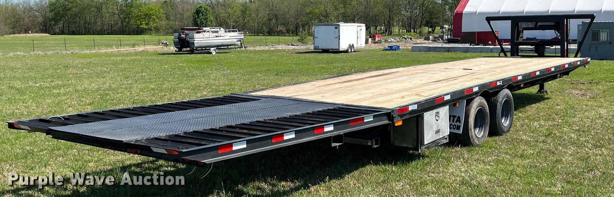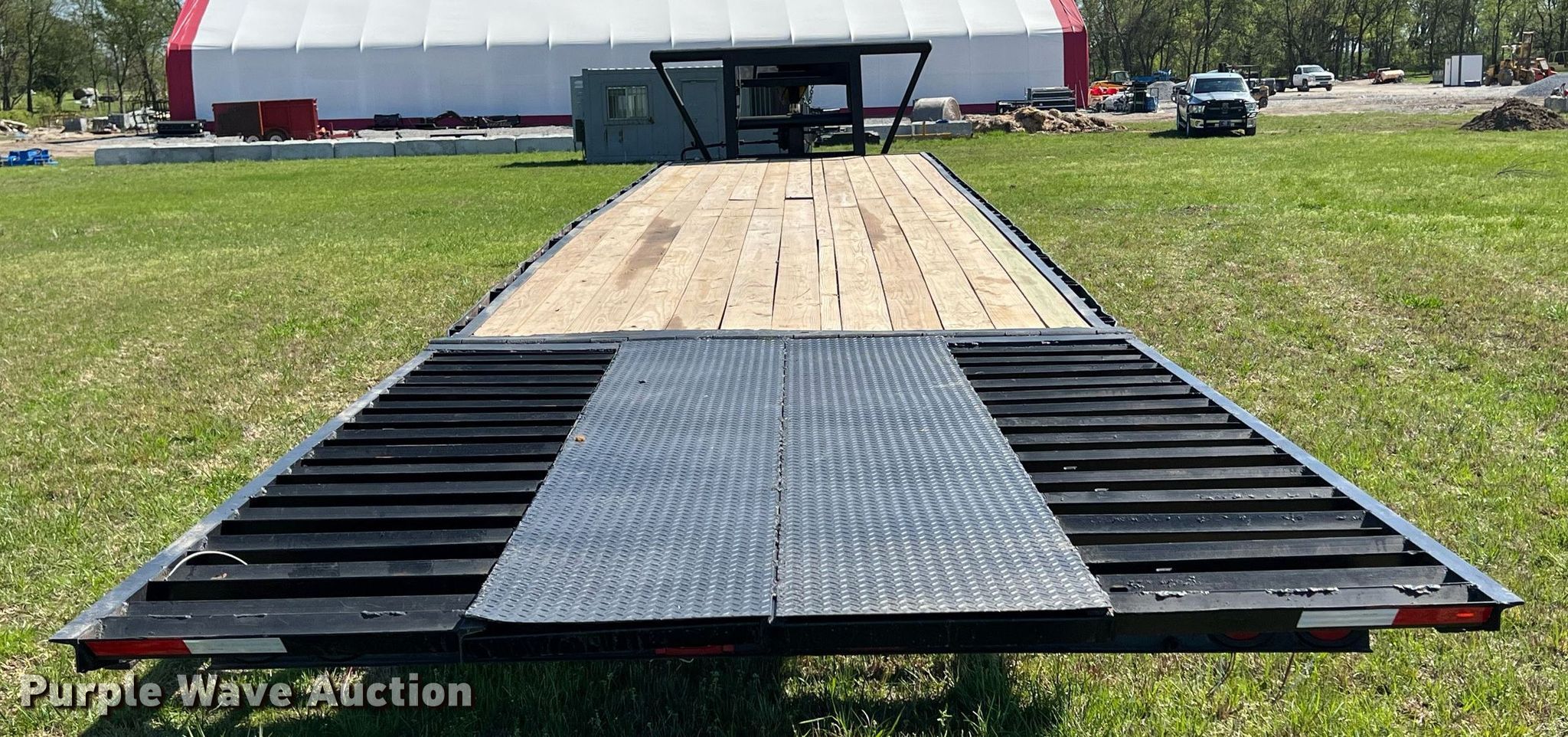 Shop built equipment trailer. VIN: 12X1622219160. Dimensions Overall: 48' 6" L x 8' W, Deck: 30' L x 8' W, Ramps: Hydraulic Length: 10' 6". Features Deck type: Wood. Chassis Hitch: Gooseneck, Landing gear: Single, Suspension: Spring, Brakes: Electric, Axles: Tandem. Tires Size: 7.50R16. Transfer of ownership documentation will be a bill of sale. 8173 S 429. Chouteau, OK 74337